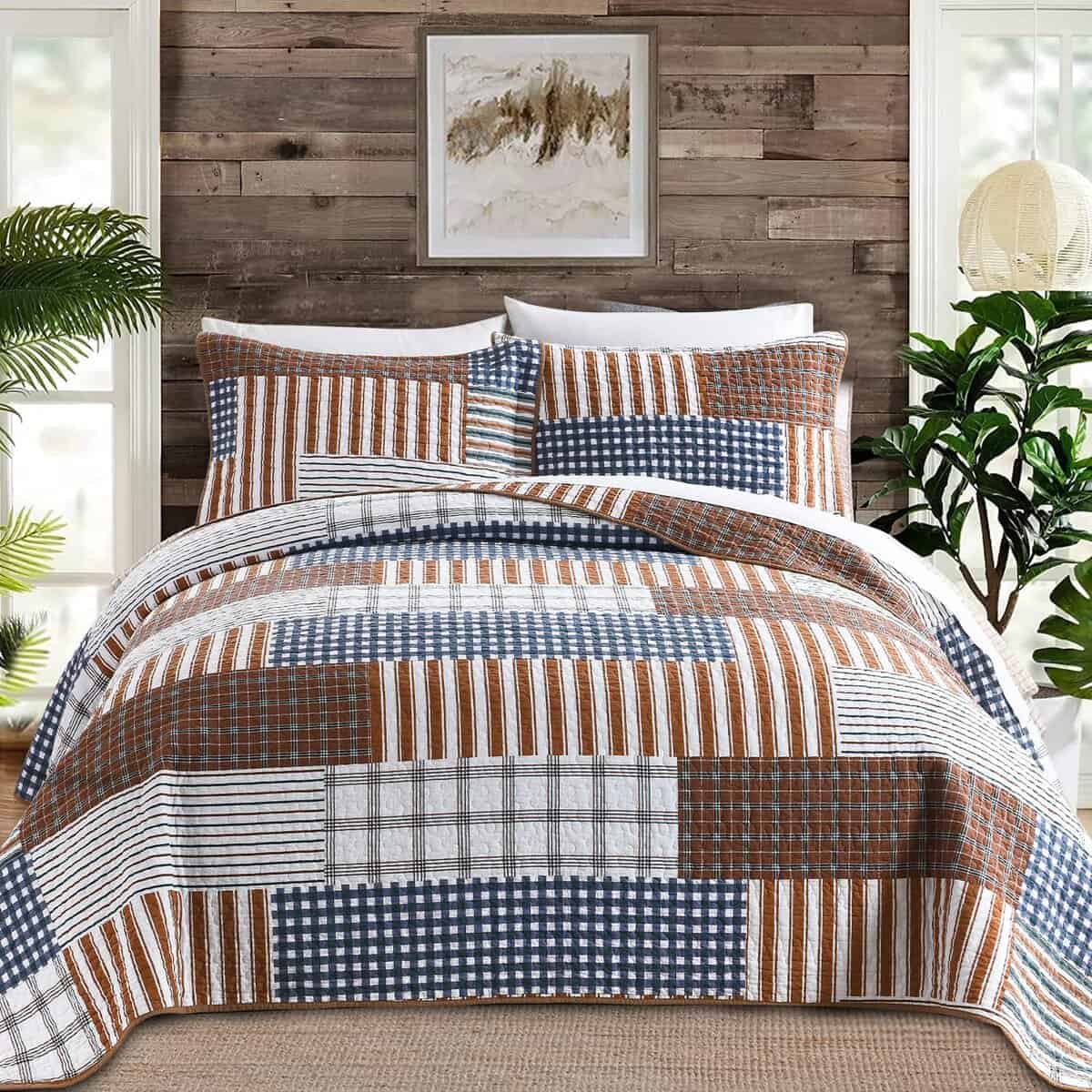 1. Patrón de Cuadros de Estilo Granja: Este edredón king size está diseñado con un patrón de cuadros de color gris; La artesanía de doble costura hace que este cubrecama de tamaño queen sea duradero y puede coincidir fácilmente con la decoración de tu habitación; ampliamente aplicable, por lo que puede ser una buena elección como regalo.