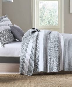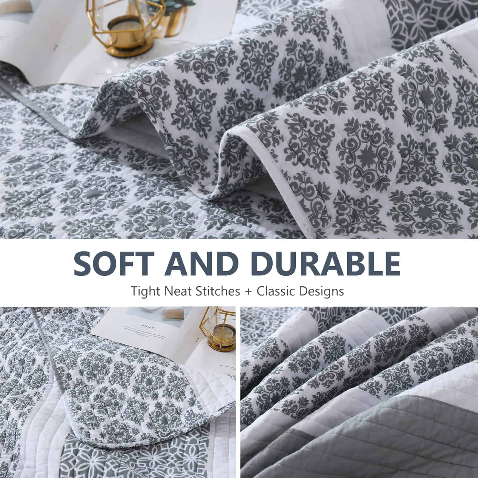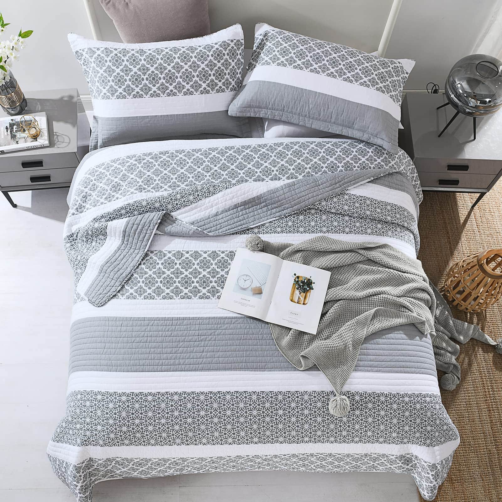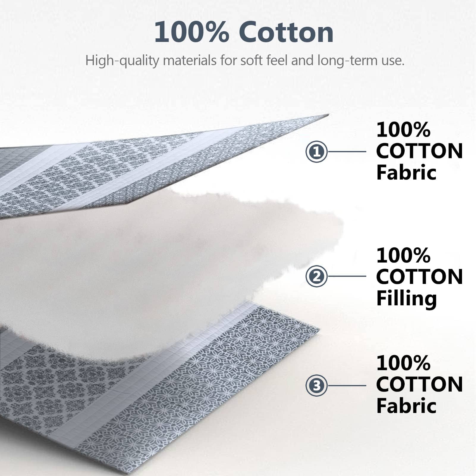 El edredón está hecho de algodón 100% natural, lo que lo hace más suave, transpirable y adecuado para todas las edades. La clásica combinación de gris azulado con patrones florales y diseños a rayas blancas le da un toque de estilo moderno y retro a su habitación.