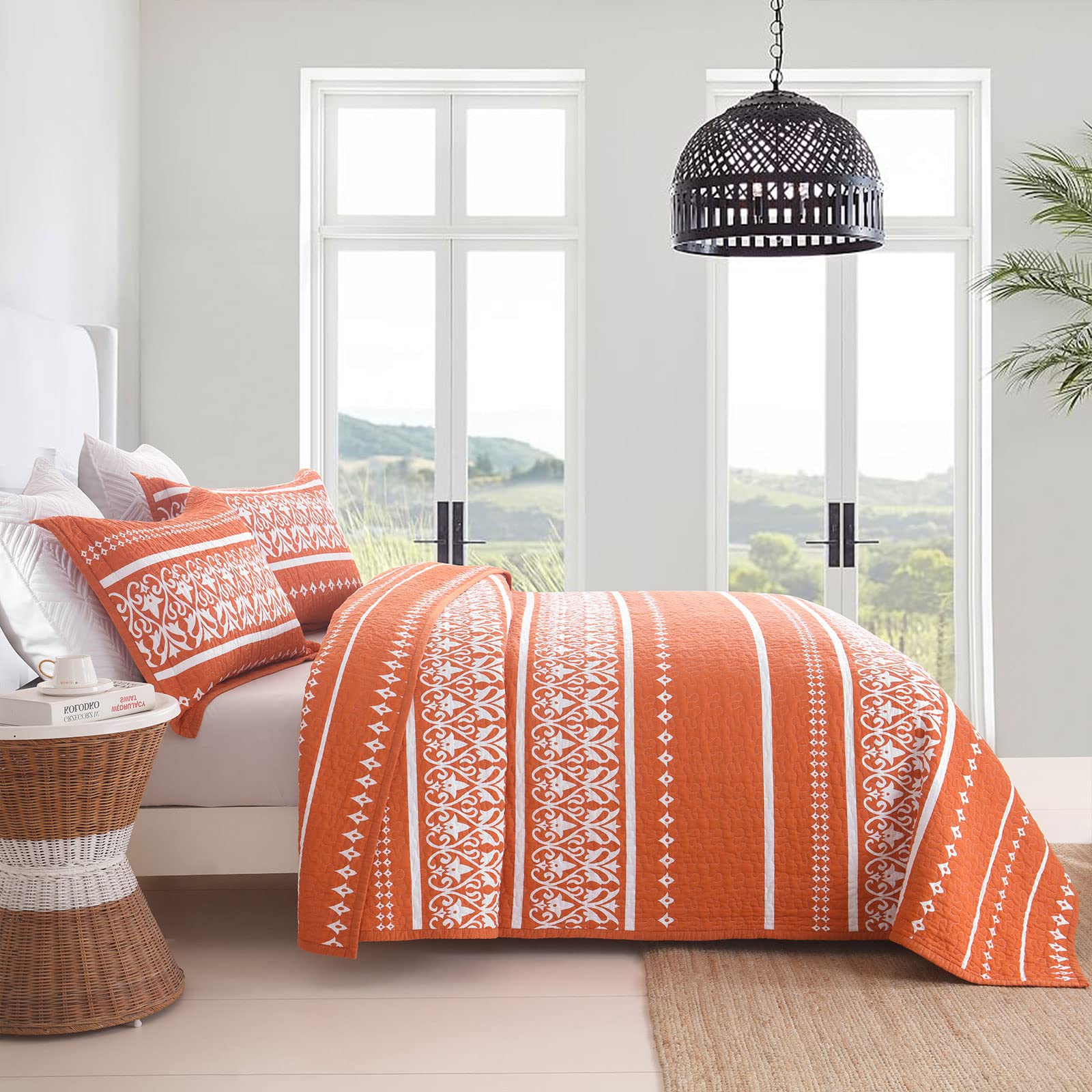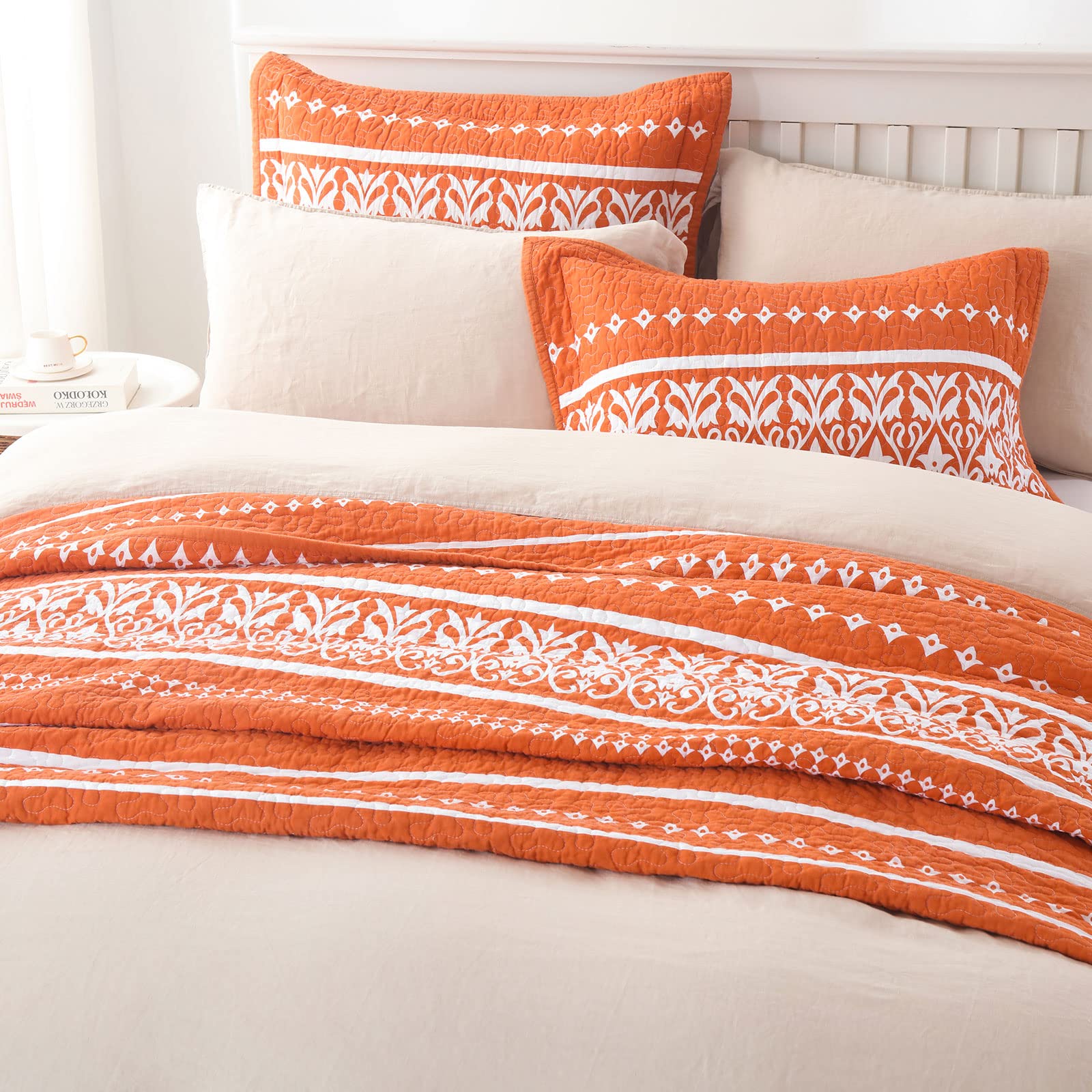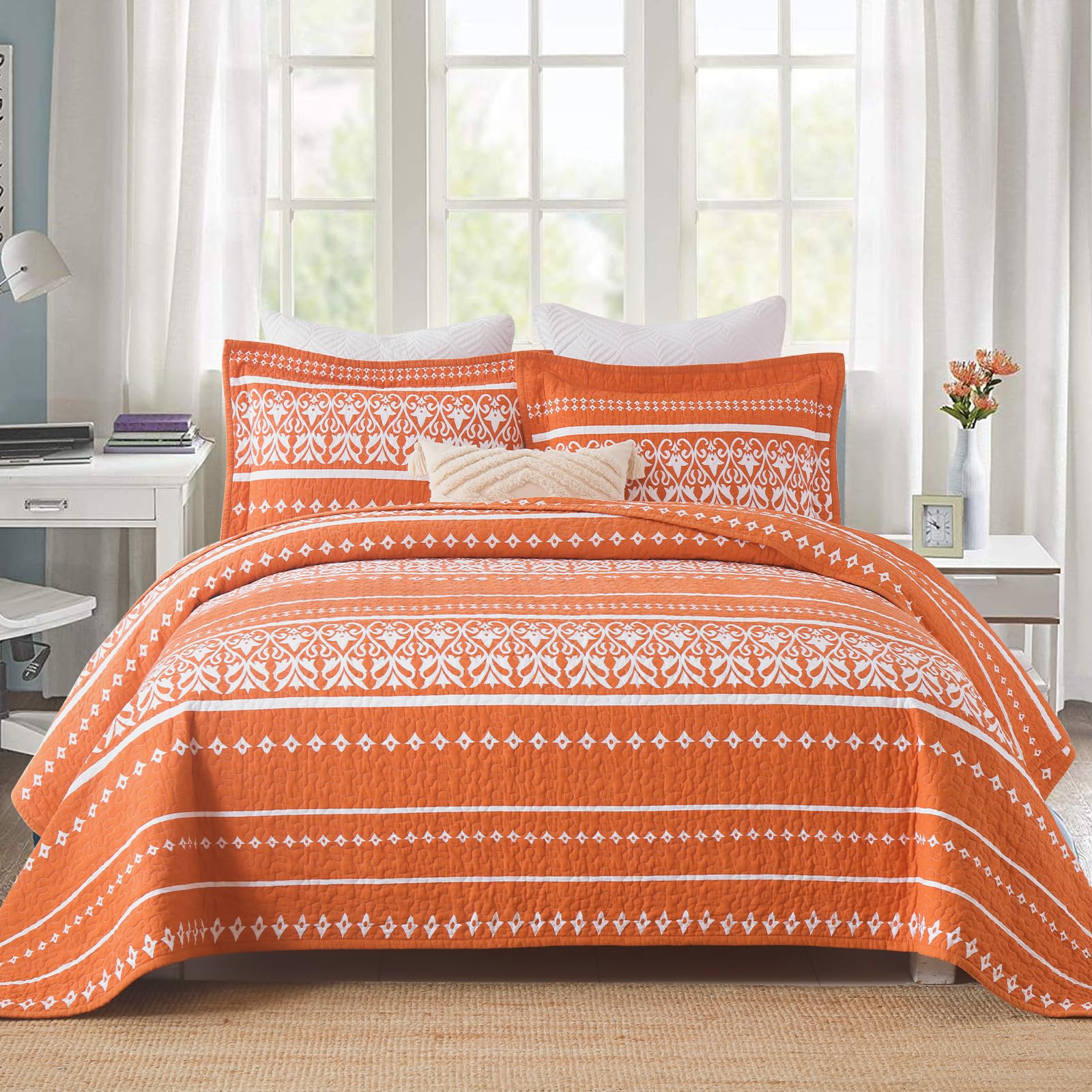 2. Juego de Ropa de Cama Boho Disfruta del encanto de nuestro edredón bohemio adornado con una hermosa combinación de patrones boho blanco y naranja. Transforma tu dormitorio al instante con este elegante juego de edredones boho, perfecto para agregar un toque fresco a tu espacio durante el verano.