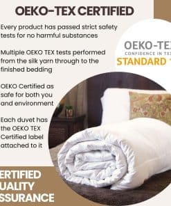 ¡ENVUÉLVETE EN CONFORT Y FELICIDAD TÉRMICA PURA! Nuestro edredón es un abrazo indulgente que se ajusta a tu cuerpo, creando un capullo lujoso y reconfortante. Disfruta de la armonía térmica, ya que el interior de seda libera el exceso de calor en calor y retiene el calor durante las noches frías. Certificado según el más alto Estándar OEKO-TEX 100, puedes disfrutar de la comodidad con total confianza con el Edredón Relleno de Seda Premium de Silk Bedding Direct. Spring/Fall Bliss (9 Tog). California King, 104″ x 98″. Refugio Hipoalergénico, Envuelve Tus Sueños en un Edredón de Seda Pura.