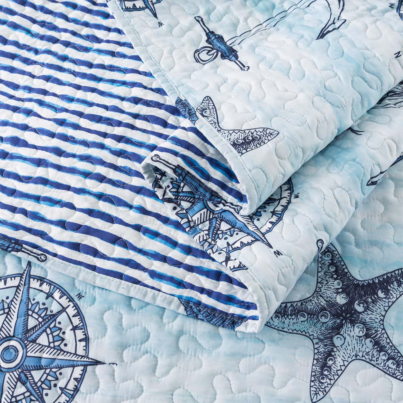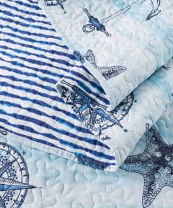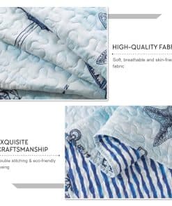 3. ARTESANÍA EXQUISITA — Exquisito diseño de patrón costero con tema oceánico, perfecto para habitación principal, habitación de invitados, casa de vacaciones, habitaciones de hotel con temática oceánica y decoración de dormitorio de verano. El acolchado cerrado a doble caja especial del edredón mantiene su relleno uniforme y evita que se agrupe y se desplace, incluso después de lavarlo.