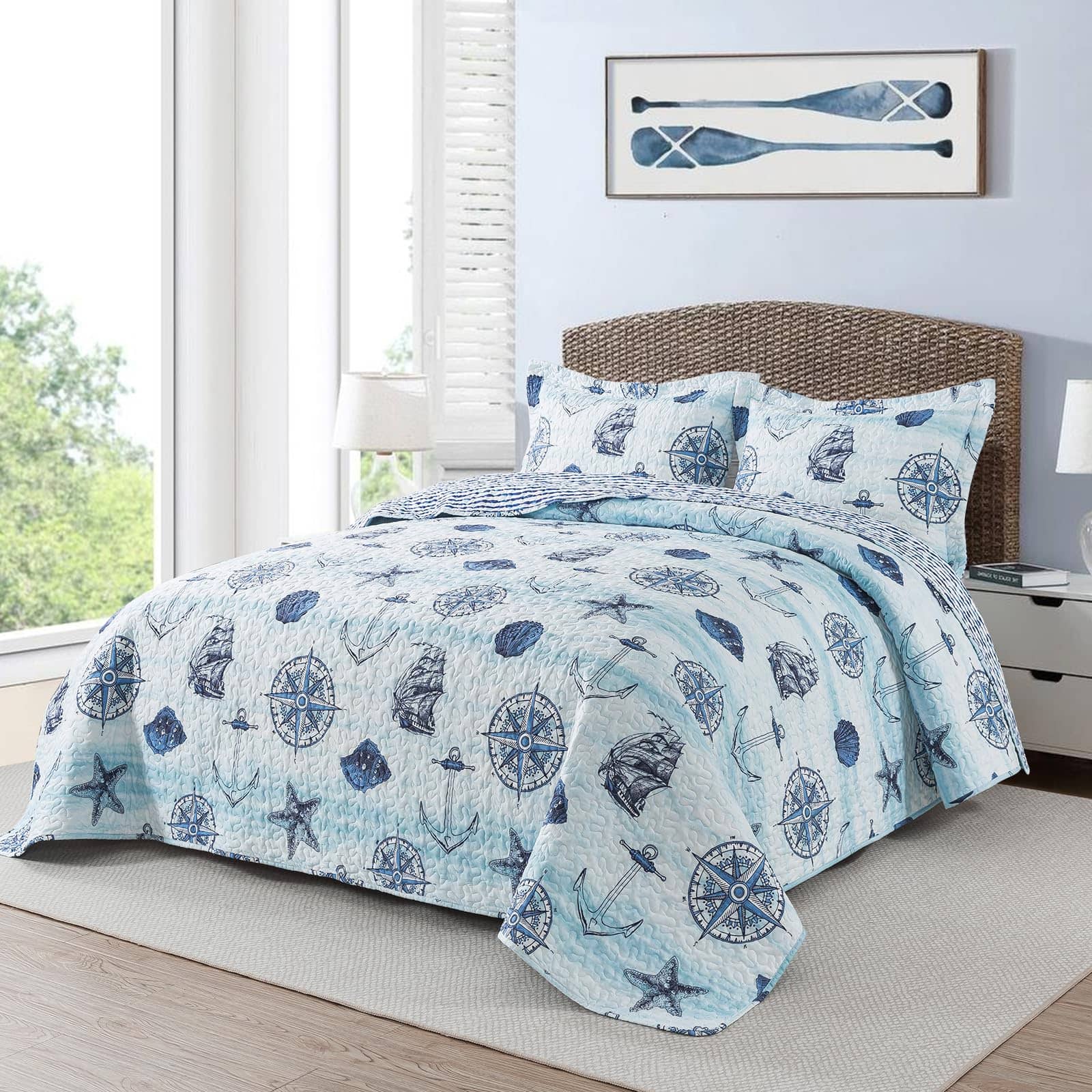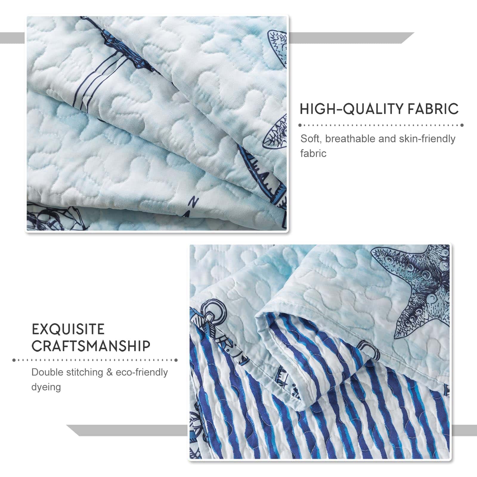 4. SUAVE y Resistente a las Arrugas — Hecho de una exquisita tela amigable con la piel lavada con agua. Edredón acolchado con un material de microfibra súper suave que te mantendrá cálido y cómodo durante todo el año. Este edredón está diseñado para su uso durante TODO EL AÑO. Puede colocarse solo en su cama o actuar como una pieza de capas perfecta creando un estilo oceánico refrescante para su habitación.