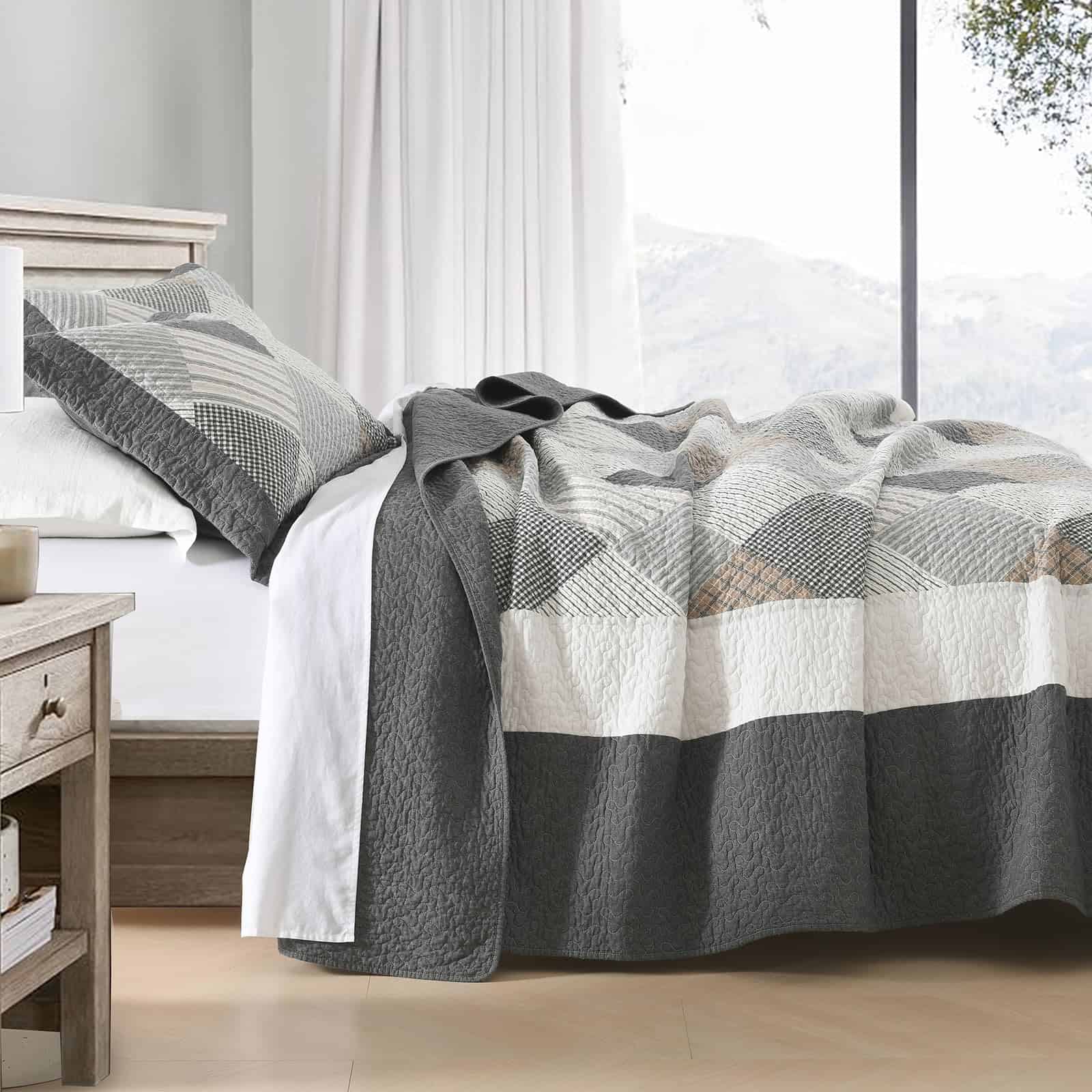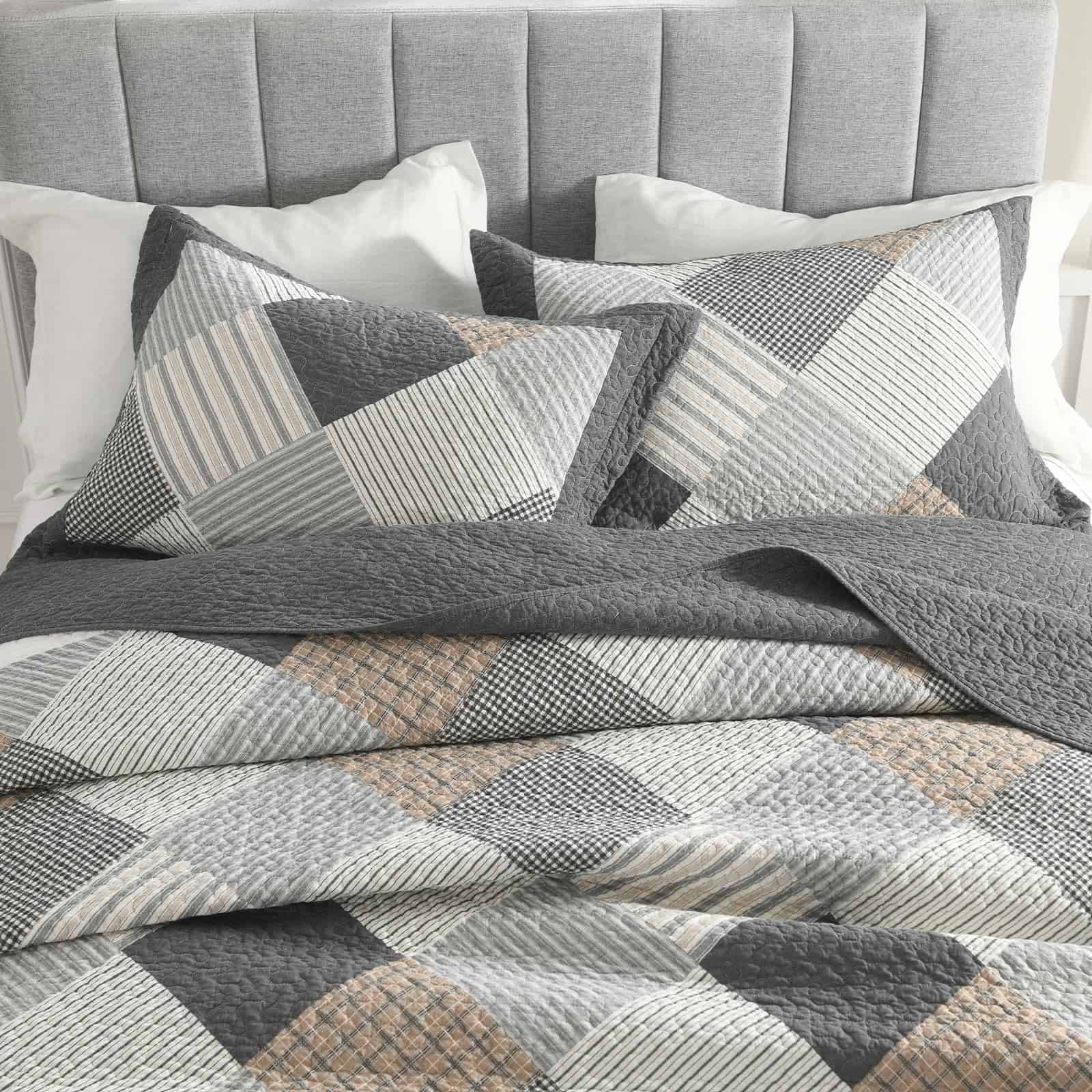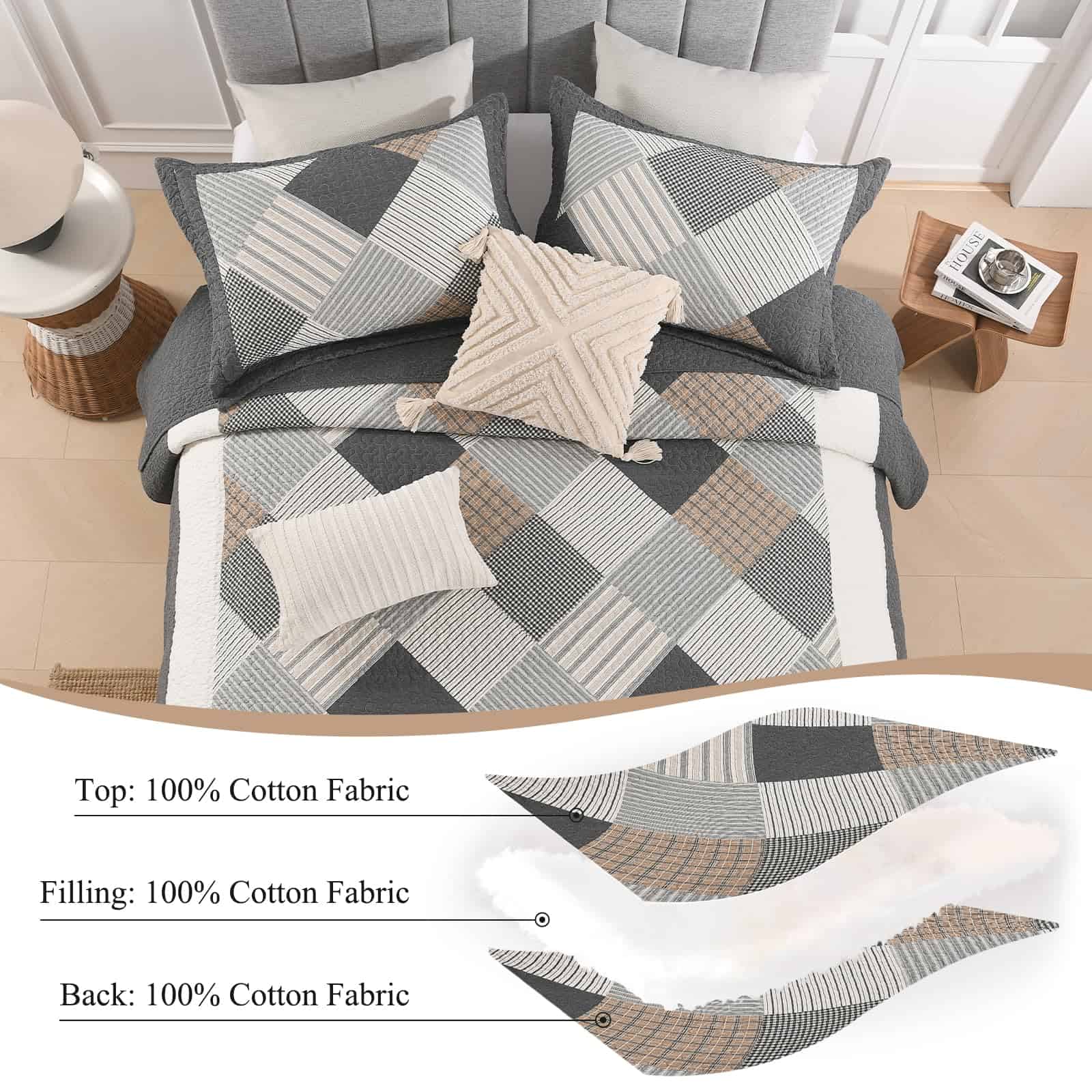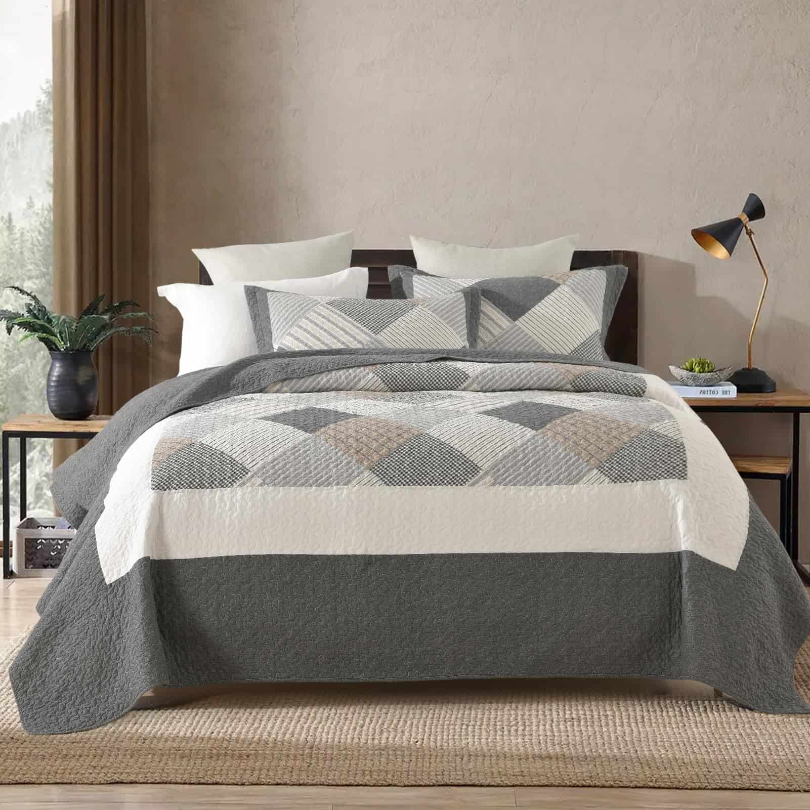 2. : Estos patrones geométricos de tablero de ajedrez crean un efecto visual rico al combinarlos y disponerlos de manera ingeniosa. Este edredón es principalmente en tonos neutros de gris, beige y marrón claro. Este estilo de diseño es moderno y con estilo, y complementa tanto los estilos modernos minimalistas como los rústicos campestres.