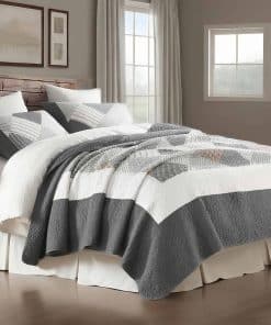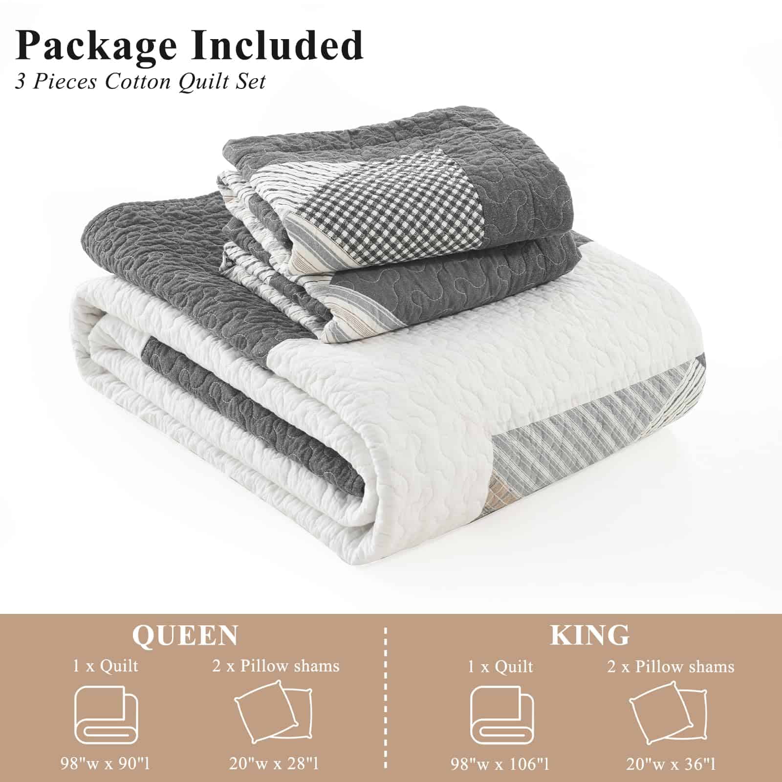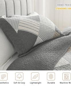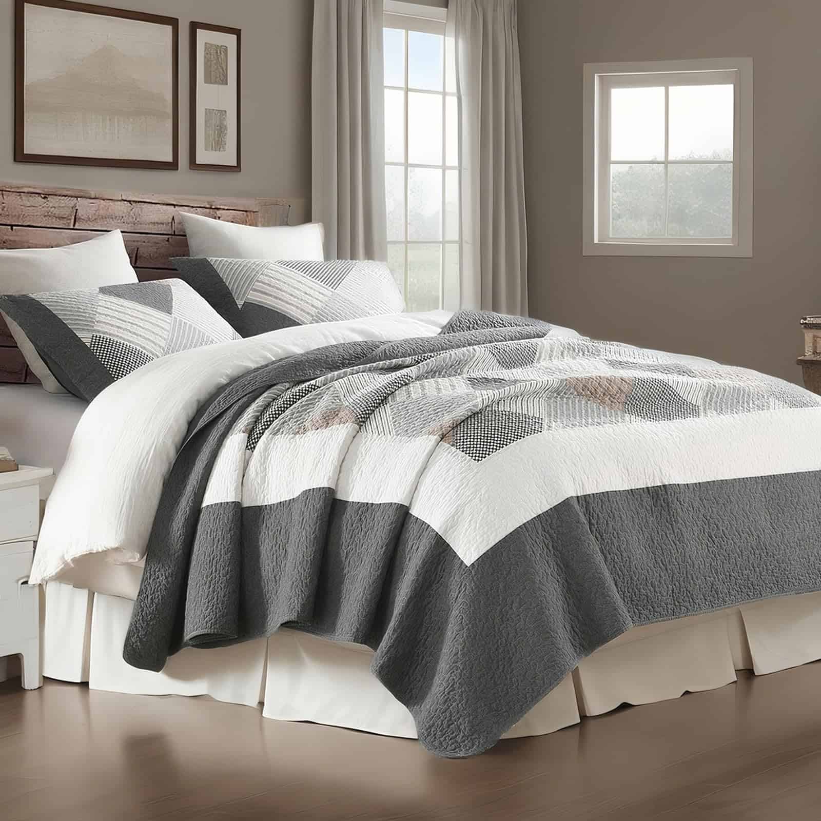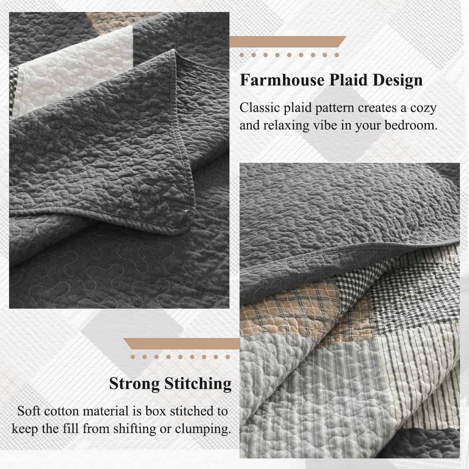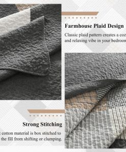 2. : Estos patrones geométricos de tablero de ajedrez crean un efecto visual rico al combinarlos y disponerlos de manera ingeniosa. Este edredón es principalmente en tonos neutros de gris, beige y marrón claro. Este estilo de diseño es moderno y con estilo, y complementa tanto los estilos modernos minimalistas como los rústicos campestres.