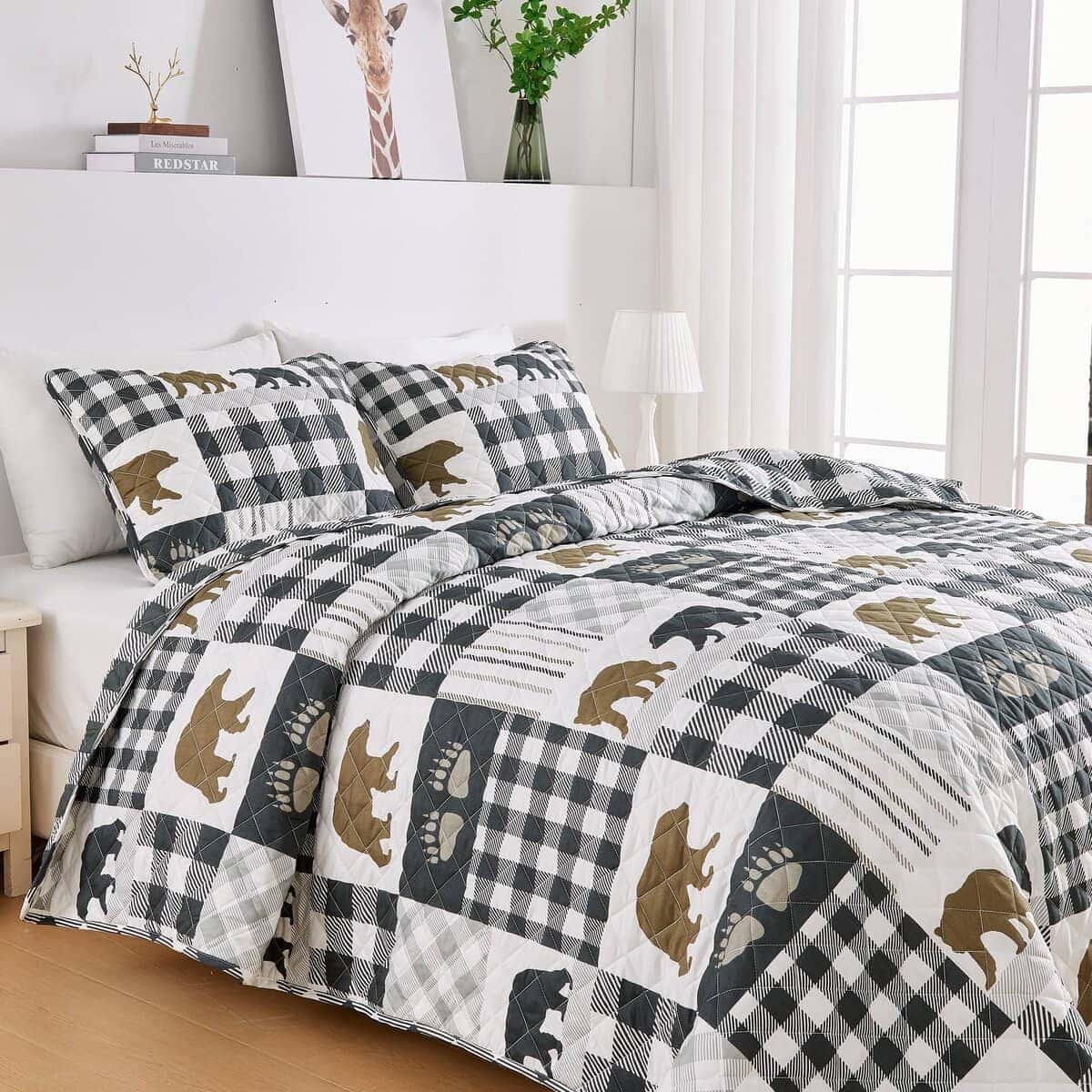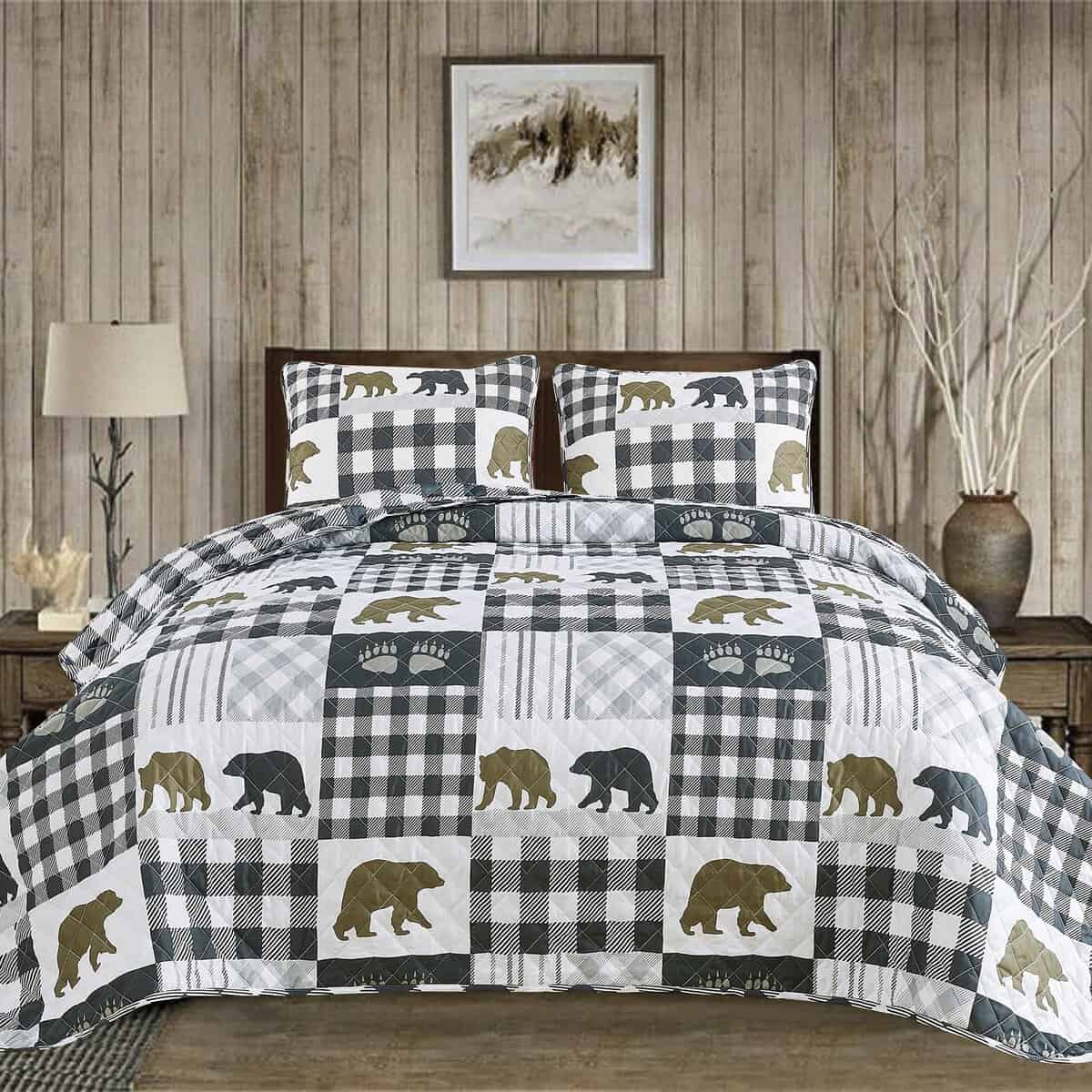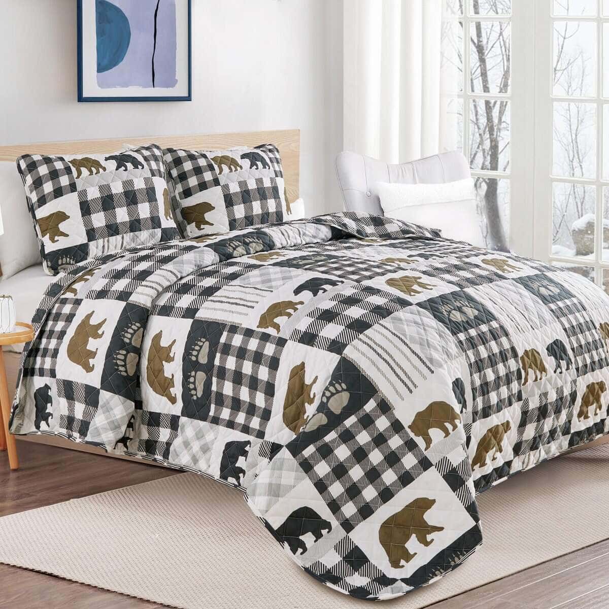 Agrega un toque rústico y moderno a tu hogar con este hermoso juego de colcha reversible de la colección Orson de 3 piezas de Market & Place. Elaborado con un tejido exterior de microfibra suave y transpirable y relleno de poliéster, este juego de colcha te mantiene acogedor y cómodo durante todo el año. Su encantador diseño de patrón a cuadros temático de cabaña con osos, ciervos y árboles es el complemento perfecto para colocar encima de tu cama. Este juego de colcha es lavable a máquina para un cuidado fácil y uso duradero. Cada set de colcha viene con una colcha y dos fundas (una funda para tamaño Twin). Elige entre tres tamaños: Twin: 1 Colcha (90″ x 66″), 1 Funda Estándar (20″ x 26″), Queen: 1 Colcha (90″ x 90″), 2 Fundas Estándar (20″ x 26″), King: 1 Colcha (90″ x 108″), 2 Fundas King (20″ x 36″)