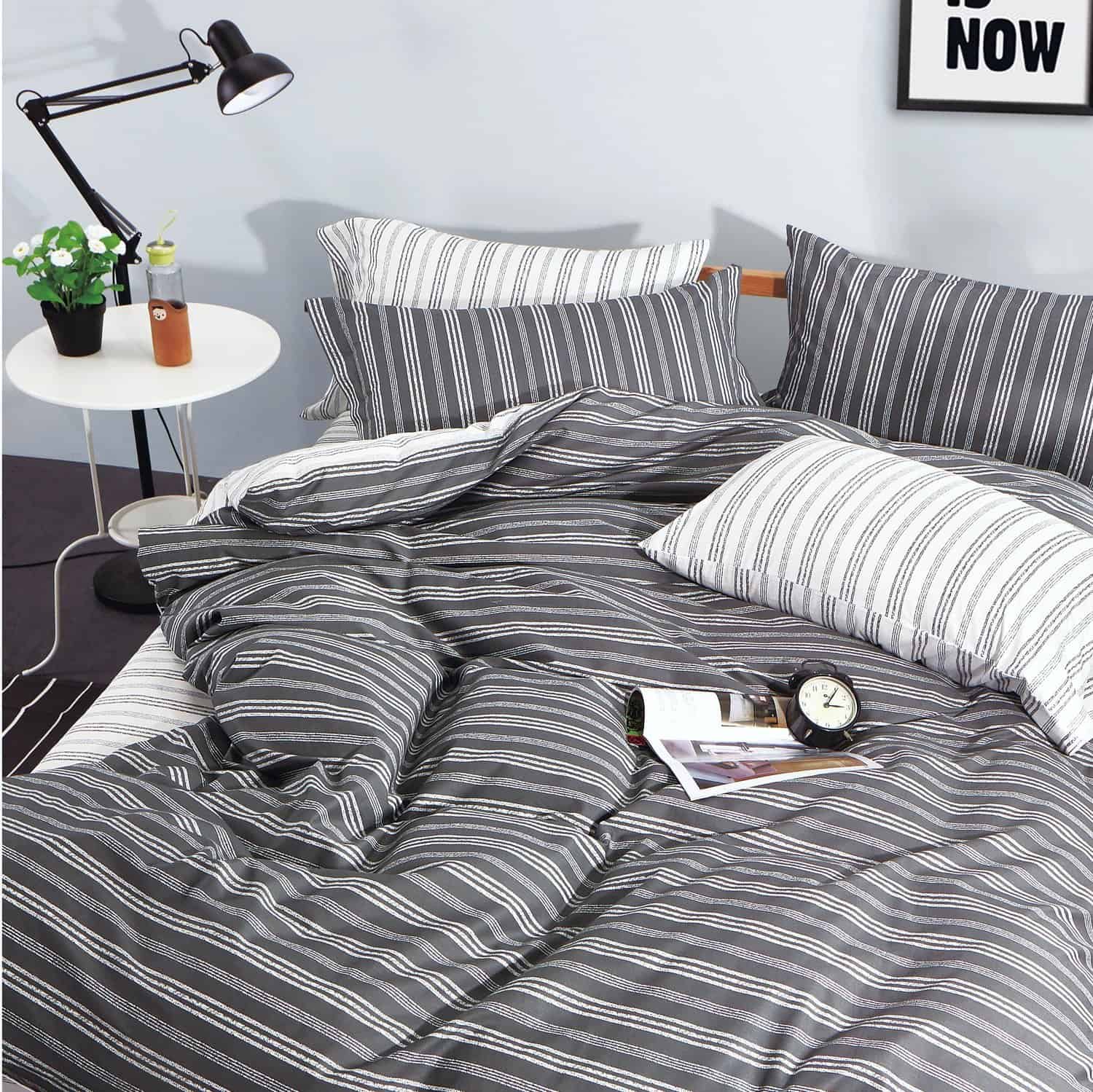 Clásico juego de ropa de cama con estampado a rayas de Cabana con un toque moderno, por EIKEI Home. Diseño blanco desgastado, gris pizarra y negro en una sarga de algodón 100% que es ligera y suave al tacto. Este patrón atemporal funcionará bien con decoraciones tanto tradicionales como modernas y minimalistas. Juego de 3 piezas en tamaño King o Full / Queen, de tamaño generoso para adaptarse a los tamaños de edredón de EE. UU., incluye una funda nórdica y 2 fundas de almohada con volante y abertura de solapa francesa. Funda nórdica con lazos interiores y cierre de botón para mantener tu edredón en su lugar. Lavar a máquina en agua tibia, ciclo suave. Secar a baja temperatura. Usar solo blanqueador sin cloro cuando sea necesario. Planchar en caliente según sea necesario. Viene con una bolsa de almacenamiento ecológica y sostenible.
