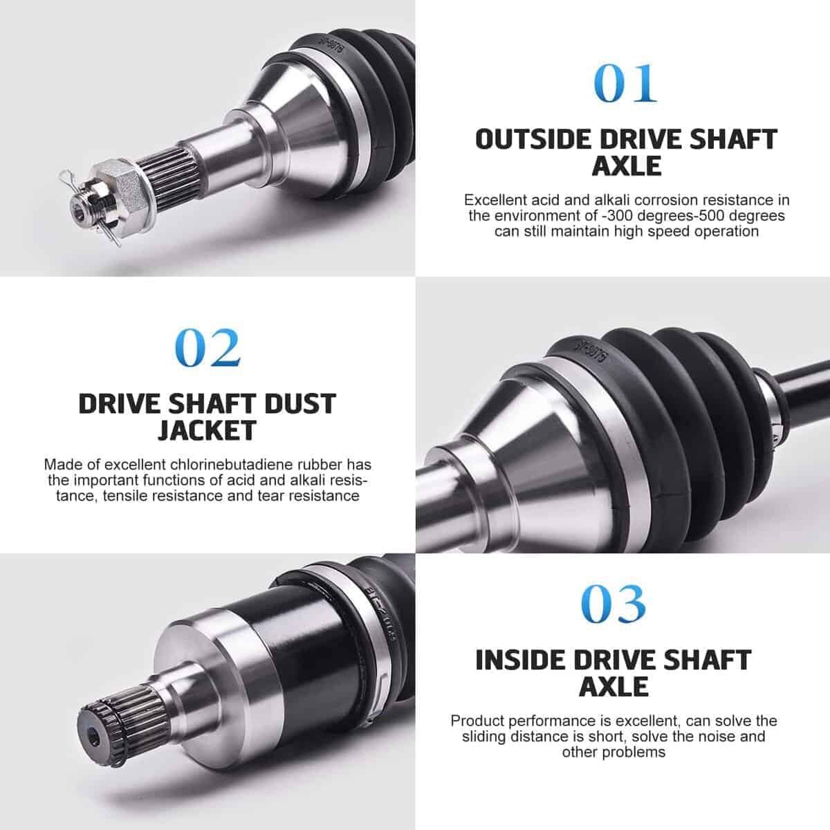 Diseño superior: Todos los componentes del conjunto del eje de la CV se mecanizan con precisión para garantizar una articulación suave y un desplazamiento suave para evitar la fricción que conduce al calor excesivo. Botas de neopreno para una protección de calidad contra temperaturas extremadamente altas o bajas. Especificaciones: Eje de velocidad constante de alta resistencia y alta resistencia Longitud comprimida: 21 3/4, Estrías internas: 24T, Diámetro de la estría interna: 2 9/16, Estrías externas: 26T, Diámetro de la estría externa: 2 3/4, Diámetro del eje: 13/16, Medida de rosca: M18x1.5. Nota: ¡Elige el correcto para tu ATV/UTV y podemos ofrecer un servicio de 12 meses con una respuesta rápida en 24 horas! ¡Si tienes alguna pregunta sobre el eje, no dudes en contactarnos!