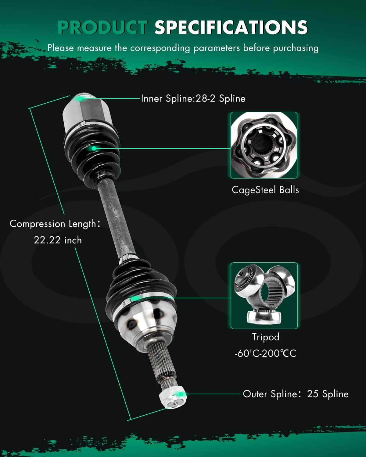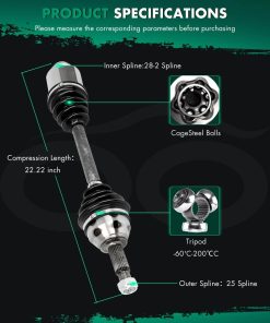 Los ejes de transmisión CV funcionan como el último eslabón entre el motor y las ruedas, transfiriendo potencia de la transmisión y el diferencial del vehículo a las ruedas para impulsar el vehículo hacia adelante. Incluye 1 x Eje de Transmisión CV. Números de parte: 6S4Z3B436AA, 8S4Z3B436B, NCV11142, 662195, 66-2195, 602195, 60-2195. Compatible con Ford Focus 2.0L 1989CC 121Cu. In. l4 GAS DOHC, Ford Focus 2.0L 1999CC 122Cu. In. l4 GAS DOHC, Ford Focus 2.3L 140Cu. In. l4 GAS DOHC, Ford Focus 2.5L 2521CC 154Cu. In. l5 GAS DOHC Turbocharged