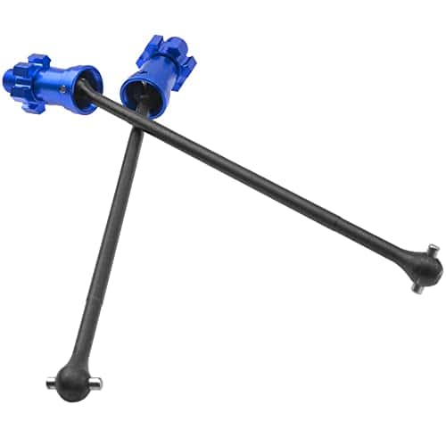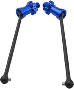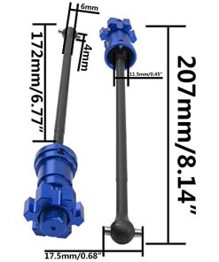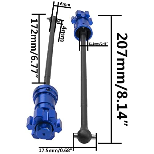 El eje de transmisión delantero trasero es compatible con Traxxas X-Maxx 8S XMAXX 77086-4 1/5 RC monster truck. No es compatible con 1/5 6s u otros modelos de RC. El conjunto de ejes de transmisión x-maxx está hecho de acero y aluminio de alta calidad, alto rendimiento, duradero en uso. Actualización ligera que mejora instantáneamente el rendimiento general en manejo y durabilidad. Piezas de actualización y reemplazo, metal resistente para un rendimiento máximo. Fácil y conveniente de instalar y actualizar. Material: Acero y Aluminio. Número de parte de reemplazo: 7750X 7768 7756. Longitud total: Aprox. 207mm. Longitud del eje (parte negra): Aprox. 172mm. Diámetro exterior del eje (parte negra): 6mm. Diámetro exterior de la bola final: 11.5mm. Tamaño del pasador (Diám. x L): 4mmx17.5mm. Color: Azul (Opcional). Peso: 143g/2 Piezas. Incluye: 2 Ejes de Transmisión para RC Car.