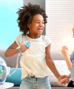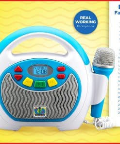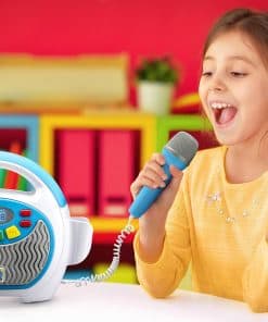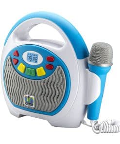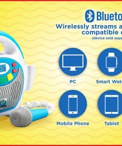 Este set de micrófono y altavoz de karaoke para niños cuenta con un micrófono con cable incorporado, conectividad Bluetooth y 24 canciones integradas. Simplemente presiona reproducir y canta junto a las populares canciones de Mother Goose Club, incluyendo ‘The Farmer in the Dell’, ‘This Old Man’, ‘The Wheels on the Bus’, Hickory Dickory Dock�, London Bridge is Falling Down�, y muchas más. El micrófono de karaoke para niños hace que sea fácil cantar y poner en escena una actuación para amigos y familiares. Además, este reproductor de MP3 USB tiene un puerto USB para expandir tu contenido y escuchar cualquier MP3 de tu colección cuando conectas una unidad USB (no incluida). Las dimensiones del producto son: 10.2 L x 3.6 W x 10 H. Portátil y ligero, este reproductor de música para niños es un gran regalo para los niños que aman cantar, bailar y ser la estrella del espectáculo. ¡Visita la tienda de la marca ekids para explorar aún más productos geniales para niños!