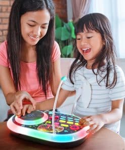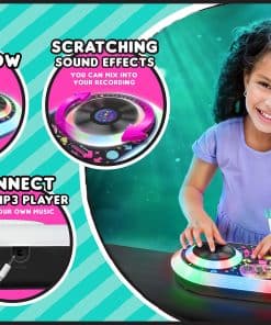2. TOCADISCOS Y LUCES: Usa el tocadiscos de giro libre para hacer scratching mientras mezclas tus jams. ¡Las luces interactivas brillan mientras giras, haces scratching y sueltas el ritmo! Los controles de Volumen y Tempo te permiten subir y bajar el sonido y la velocidad, ¡también!.