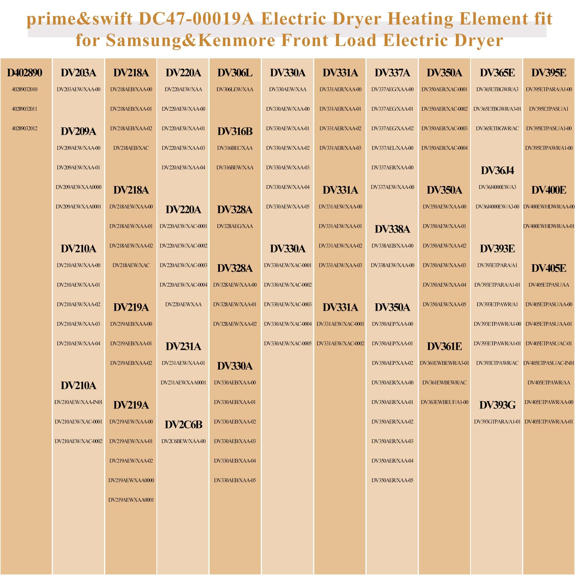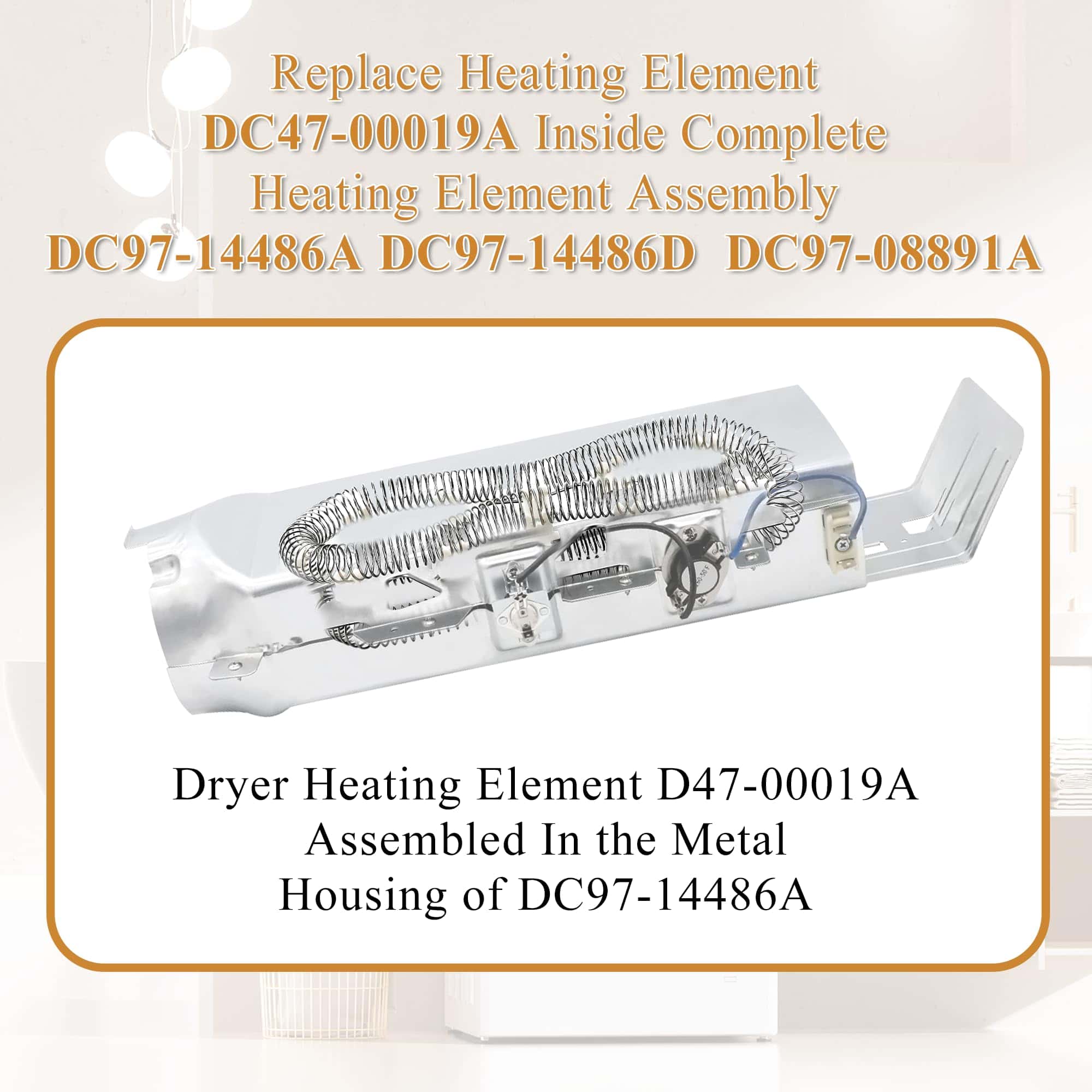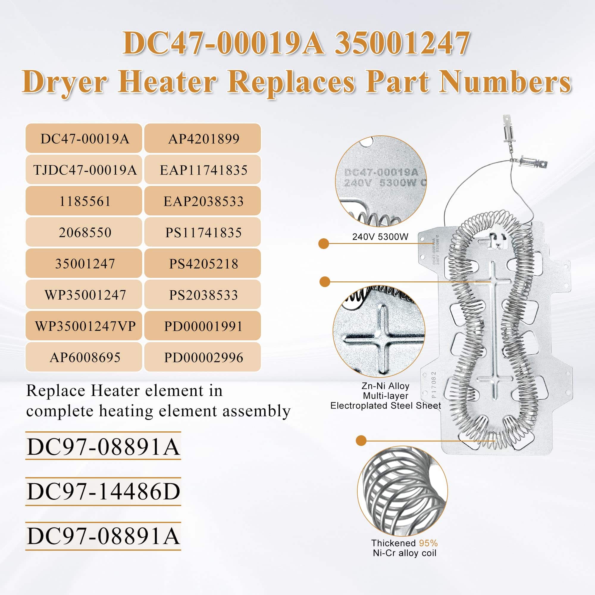 El elemento calefactor DC47-00019A mejorado es perfecto para reemplazar el elemento calefactor de la secadora Samsung en modelos como DV42H5000EW/A3, DV45H7000EW/A2, DV40J3000EW/A2, DV42H5200EW/A3, DV42H5200EW/A2, DVE50R5200W/A3, DVE50M7450W/A3, DV42H5200EP, DV48H7400EW, y más.