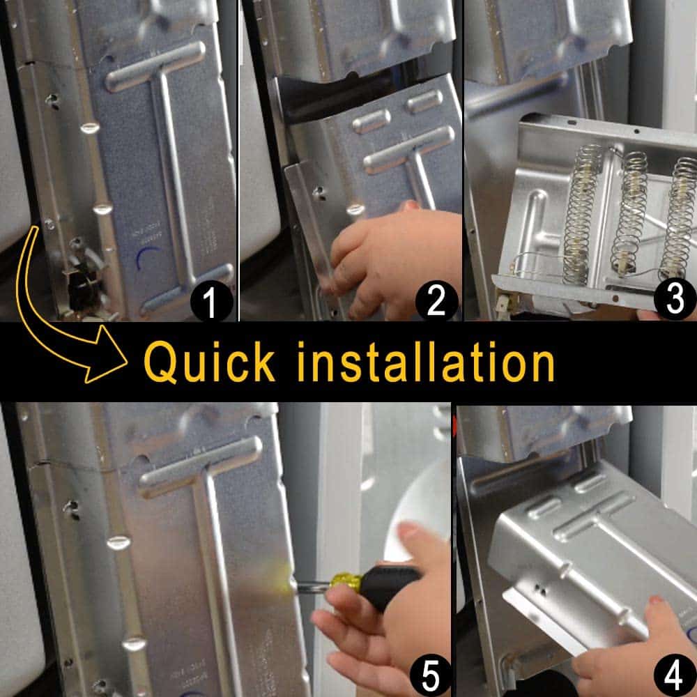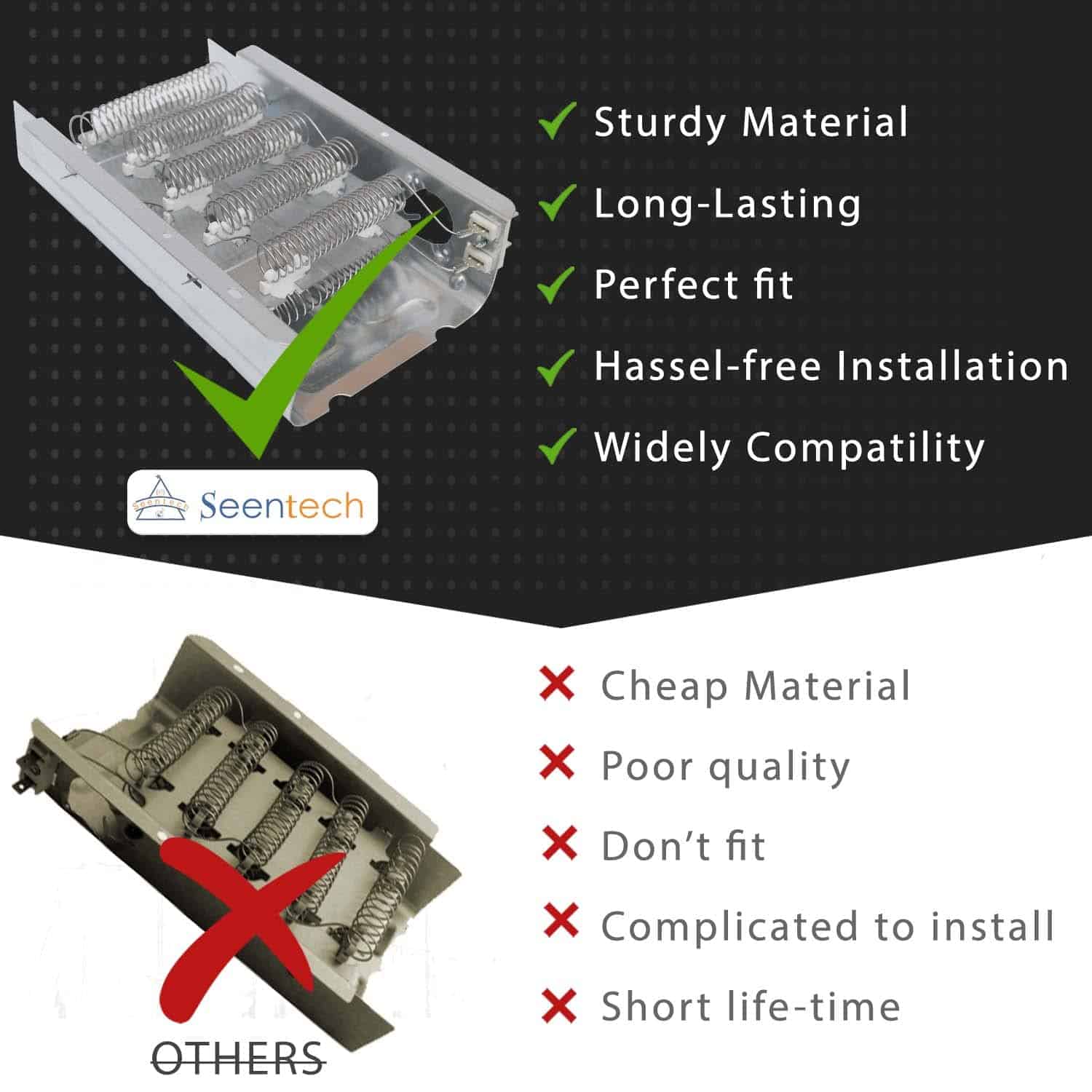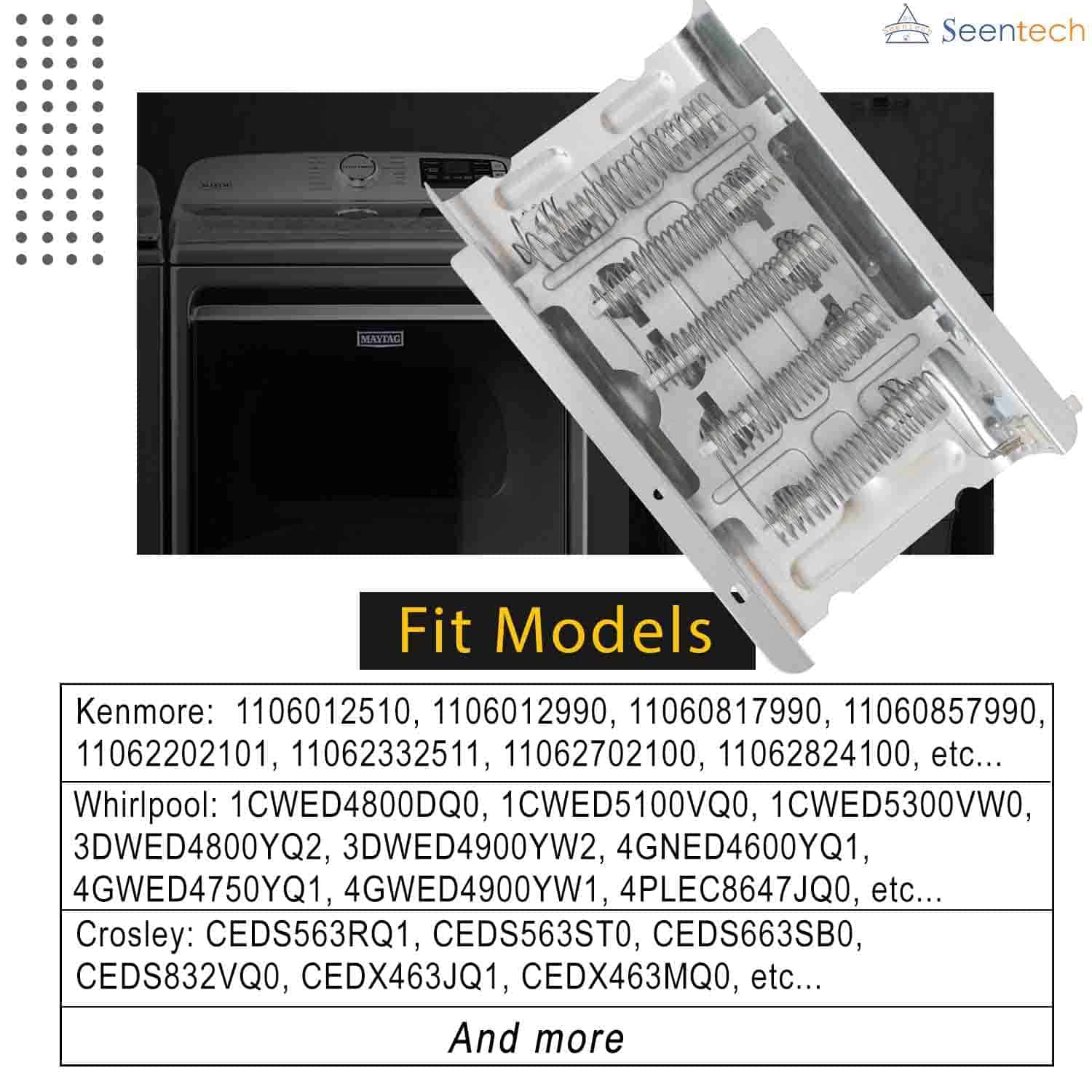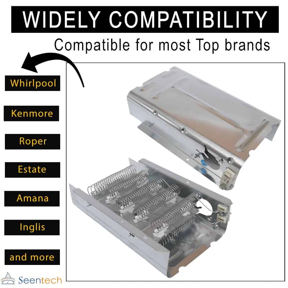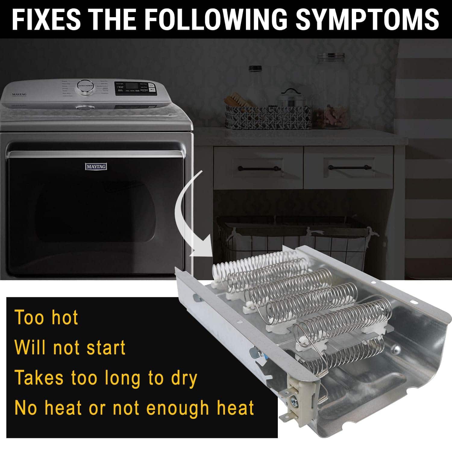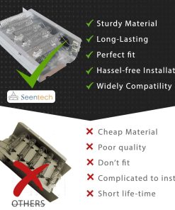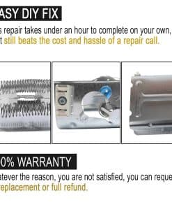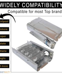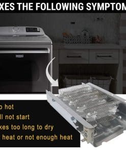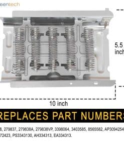 279838 Elemento Calefactor de Secadora. El ensamblaje del elemento calefactor incluye la carcasa con la bobina del elemento calefactor y los aisladores adjuntos. El elemento calefactor genera el calor para secar la ropa. Este elemento tiene una potencia de 5400 vatios, 240 voltios y tiene 2 terminales macho de 5/16″. Marcas compatibles incluyen: Whirlpool, Kenmore, Sears, Magic Chef, Amana, Admiral, Norge, Estate, Inglis, Roper, Crosley. Modelos compatibles: LER5620KQ0, 7EWED1510YM0, 7EWED1705YM0, 7EWED1705YM1, 7EWED1730YW0, 7EWED1730YW1, LEN2000LW0, LEN2000LW1, 7MWED1600BM0, 7MWED1600BM1, 8530040, 8543000, 885450, 885453, 885455, 885456, 885457, 885458, 885461, 885462, 885463, 885464, 885465, 885468, 885469, 885472, LER5600JT0, LEC5000PQ1, WED5600SQ0, WED5600ST0, WED5600VQ0, WED5700SW0, WED5700VH0, WED5700VH1 11096560200, 1037777000, 1037777020, 1037777040, 1037777060, 1038017050, 1038517050, 11065132411, 11066132411, 110C62442511, 110C66132411, 110C67132411, 11066722690, 11062842101, 1106012511, 11060222511, 11060022010, 11060022011, 1106012510, 11060202990, 11060212990, 11060222510, 11060522900, 11060602990, 11060612990, 1106062110, 11060622990, 11060702990, 11060712990, 1106072010. Reemplaza varios números de parte, como AP3094254, 279837, 2438, 279838VP, 3398064, 3403585, 8565582, AH334313, EA334313, PS334313, B017L2HC8M, B00D8G49D2, B071FR1KC6, B00D9978YK, B00LX8BEOO, B00LX8B9RQ, B00PH7QJPG, y más. Repara los siguientes síntomas: Sin calor, No suficiente calor, Demora mucho en secar, Ruidos inusuales, Ruidos fuertes. Contáctenos si tiene alguna pregunta sobre la compatibilidad.