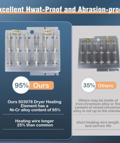 Número de parte de repuesto: El elemento calefactor 503978 puede reemplazar los números de parte: 964P3, 510329, 510329P, 510325P, 510325, 61195, 503404, 56047, wpy503978, 503978, Y503978, 56179, 61928, 56176, 56047, 1246369, 14218929, AP4294403, PS2200820, EAP2200820, 2304695, AP4489047, PS12210200, EAP12210200, AP6285328, 56176, AP2403592 AP6285327, DE164, 1914, R0610020, R0610022, R0610067, AP4072871, PS2061575, EAP2061575. (* Compatible con ADE, AE5, AEM, AGM, ZDE y más). Maytag SDG4606AWW, SDG305DAWW, PDET910AYW, PDET910AZW, PDET920AYW, SDE2606AYW, SDE305DAZW, SDE3606AZW, SDE4000AYW, SDE4000AZW, SDE405DAYW, SDE4606AZW, SDE505DAYQ, SDE515DAZW, SDE5401AYW, SDE5701AYQ, SDE5701AYW, SDE5701AZW, MDE208DAYW, MDE2706AYW, MDE3706AGW, MDE3758AYW, MDET336AYW, MDET446AYW, SDG515DAWW, HYE2205AKW, SDG2606AWW, SDG3606AWQ, Amana ALE230RAW, ALE331RAC, ALE331RCW, ALE443RAC, ALE643RBW, ALE866SBC, ALE866SBW, NDG7800AWW, NDG5800AWW, NDE2330AYW, NDE2330AZW, NDE5800AYW, NDE5800AZW, NDE5805AYW, NDE7800AYW, NDE7800AZW, NDE8805AYW, NDG2330AWW, LEA80AW-PLEA80AW, LEA10AW-PLEA10AW, LEA20AL-PLEA20AL, LEA20AW-PLEA20AW, LEA30AL-PLEA30AL, LEA50AL-PLEA50AL, LEA60AL-PLEA60AL, LEA60AW-PLEA60AW, LEA80AL-PLEA80AL, LEA90AL-PLEA90AL, LEA90AW-PLEA90AW, LEA30AW-PLEA30AW, ALE643RAC-PALE643RAC, ALE120RAW-PALE120RAW, ALE230RAW-PALE230RAW, Crosley CDG9500W, CDE6505W, CDE9500W, CDE9505W, CDE9505AZW, CDE9500AZW, Speed Queen LES10AW-PLES10AW, LES34AW-PLES34A, SLE120RAW-PSLE120RAW, SLE332RAW-PSLE332RAW. Calidad actualizada: El elemento calefactor 503978 está hecho de metal de alta calidad y materiales de acero inoxidable, y una vida útil larga después de las pruebas. El artículo es una pieza de repuesto compatible (no original), bien probado por el fabricante, cumple con OEM. Fácil de Instalar: Mira el video de YouTube antes de instalar la pieza de repuesto, para que tu secadora pueda funcionar rápidamente. Simplemente busca la parte 503978 con «instalación» y, fácilmente, deberías encontrar un video. Nota: Si no estás seguro de si nuestro kit de elemento calefactor de secadora es adecuado, puedes enviarnos el modelo de tu secadora y lo confirmaremos por ti.