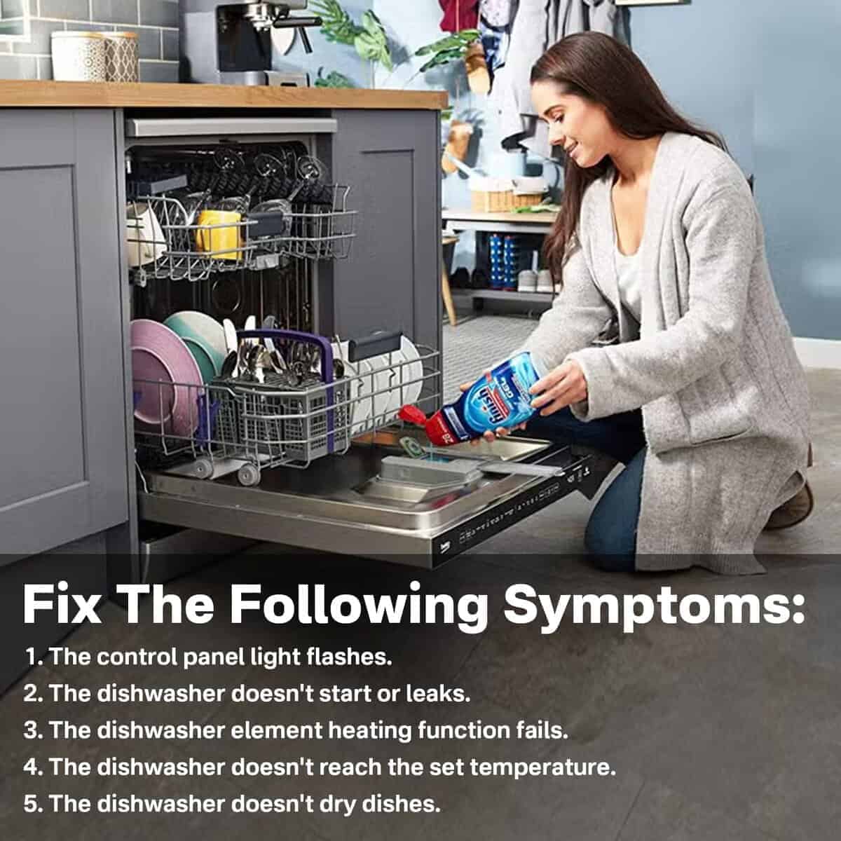 4. Soluciona los Síntomas Siguientes 1. La luz del panel de control parpadea; 2. El lavavajillas no se enciende o tiene fugas; 3. Falla en la función de calentamiento del elemento del lavavajillas; 4. El lavavajillas no alcanza la temperatura establecida; 5. El lavavajillas no seca los platos.