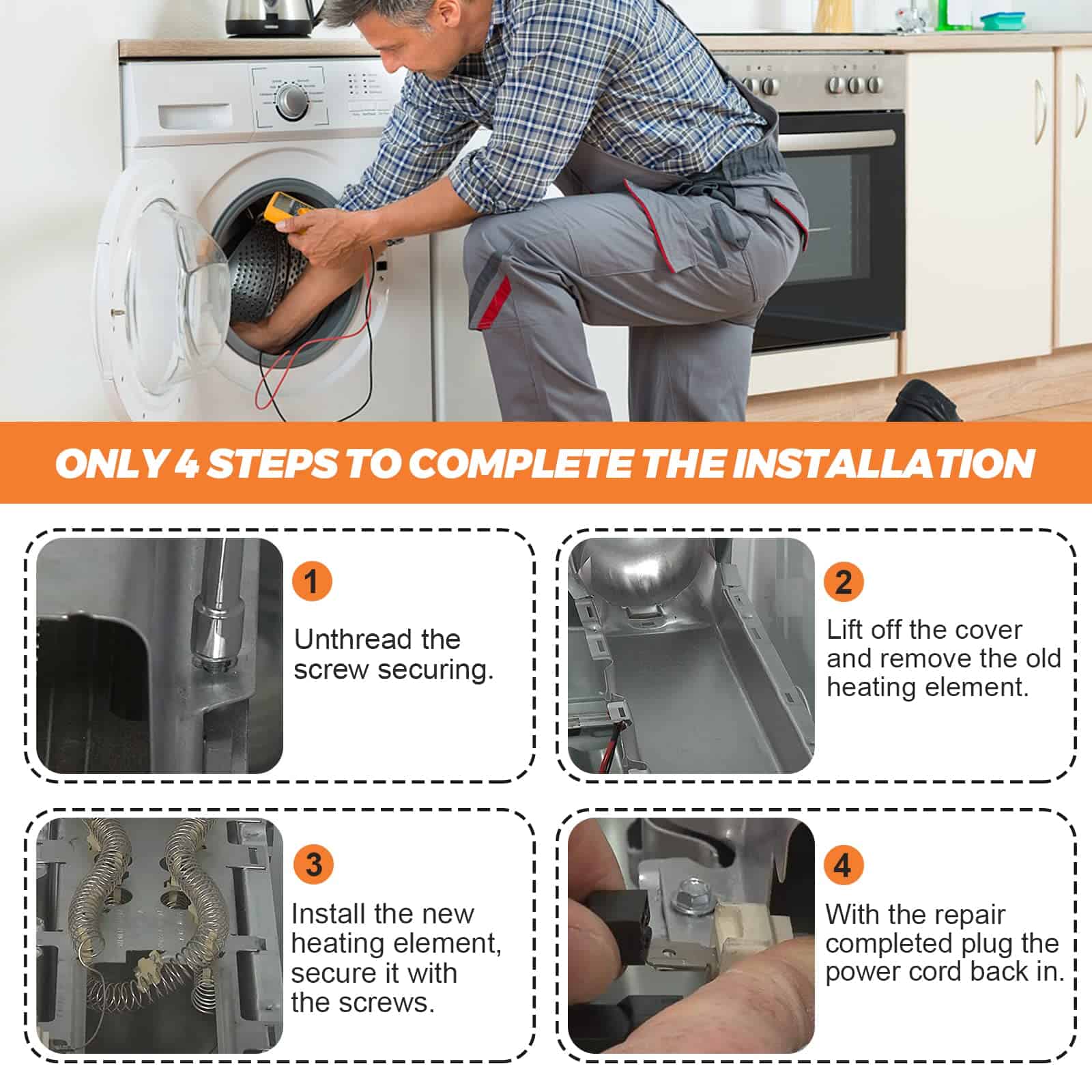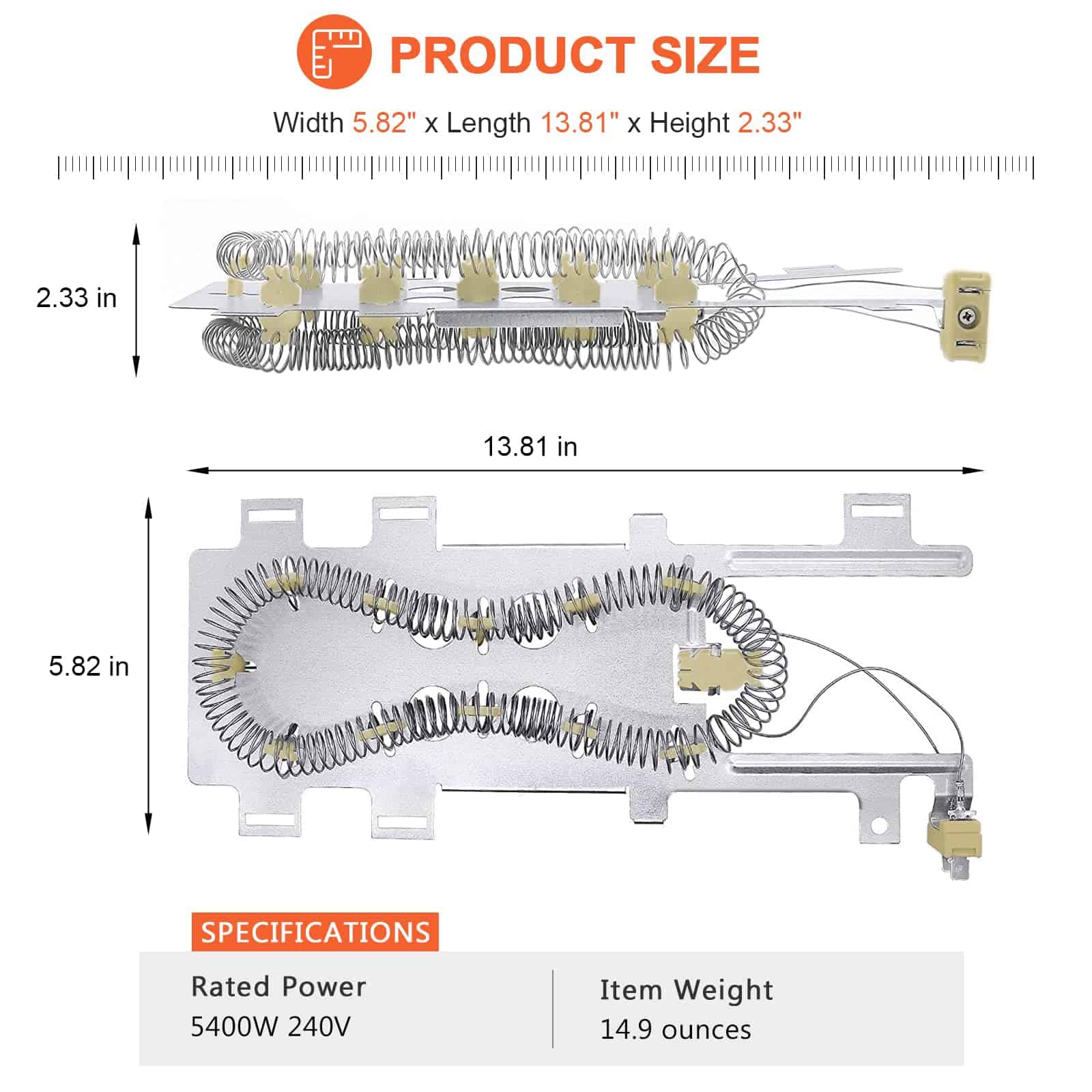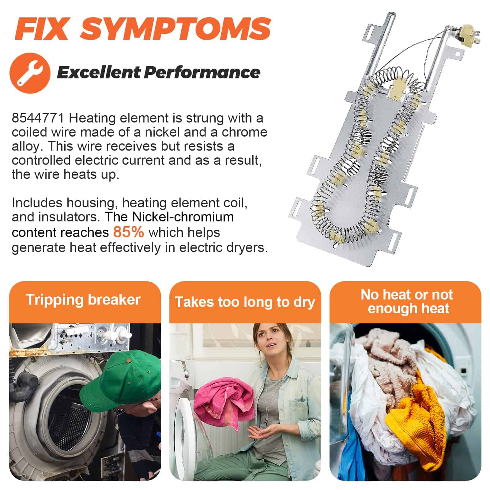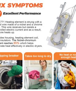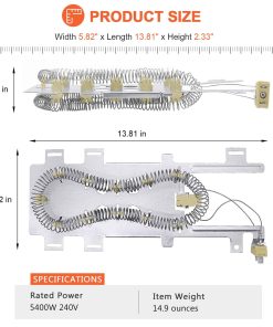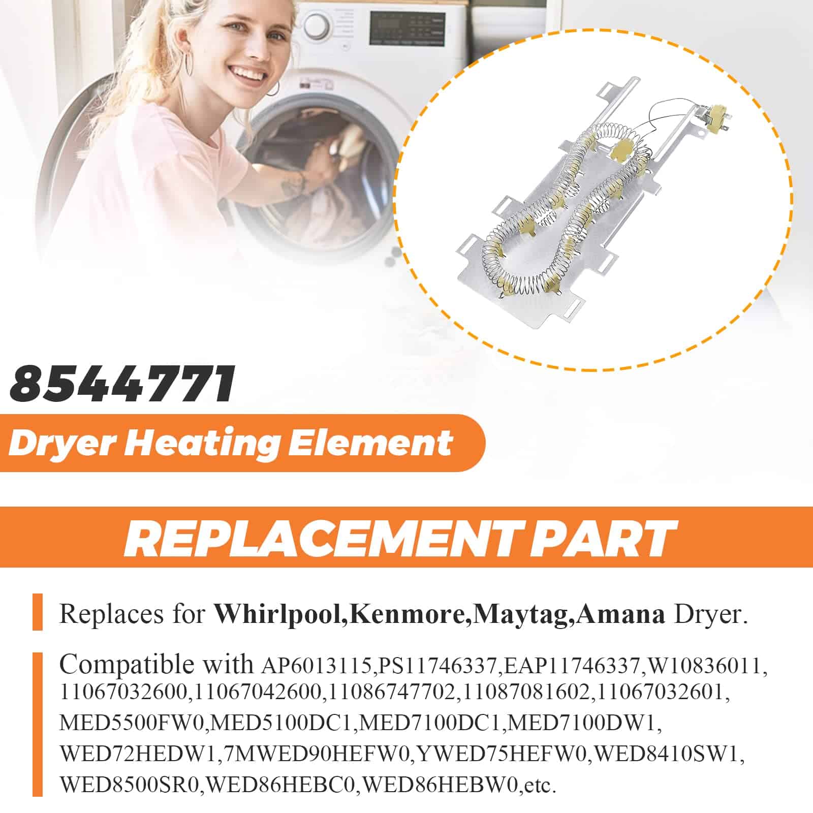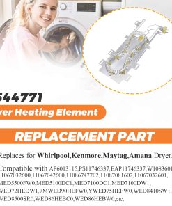 El elemento calefactor para secadora 8544771 está enrollado con un cable hecho de una aleación de níquel y cromo. Este elemento de calefacción genera el calor de la secadora. 5400 vatios 240 voltios. El paquete incluye: 1 x Elemento Calefactor para Secadora 8544771. Fácil de instalar: desconecte la fuente de alimentación antes de instalar esta pieza. Compatible con marcas: Elemento Calefactor para Secadora 8544771 para Whirlpool y Kenmore. Modelos de reemplazo: LGWED72HEDW1, 7MWED90HEFW0, YWED75HEFW0, WED92HEFU0, WED92HEFW0, 11086572501;11086742700 y más. Solucione síntomas comunes: Solucione el problema de no hay calor o no hay suficiente calor. TENGA EN CUENTA: El nombre de la marca o la designación del modelo de este producto se hace únicamente con el propósito de demostrar compatibilidad. Gracias.