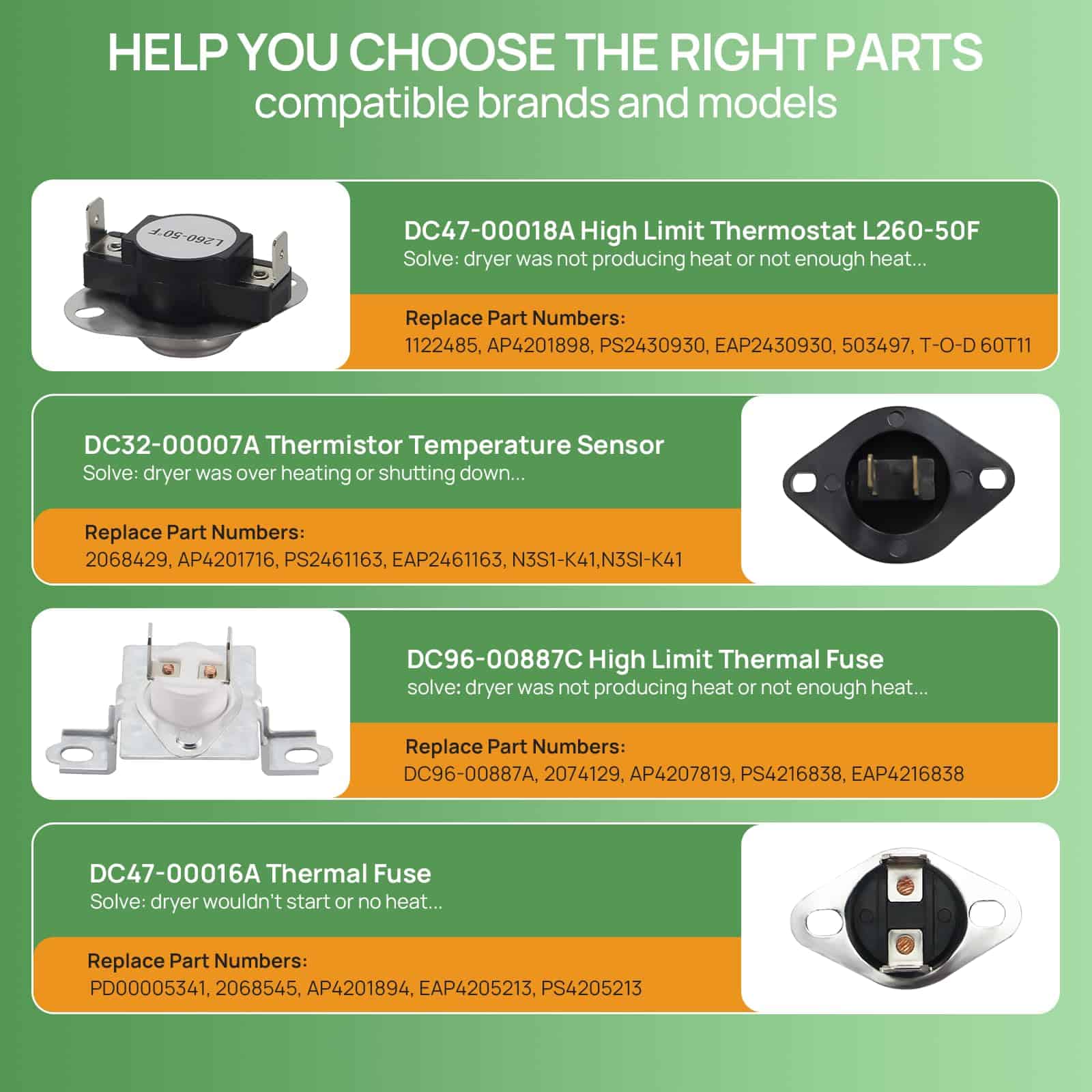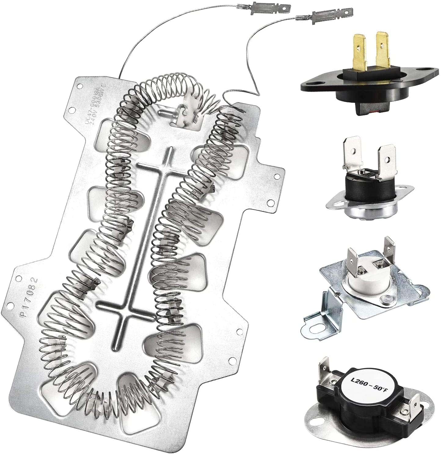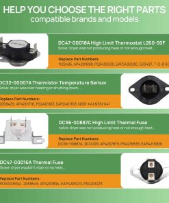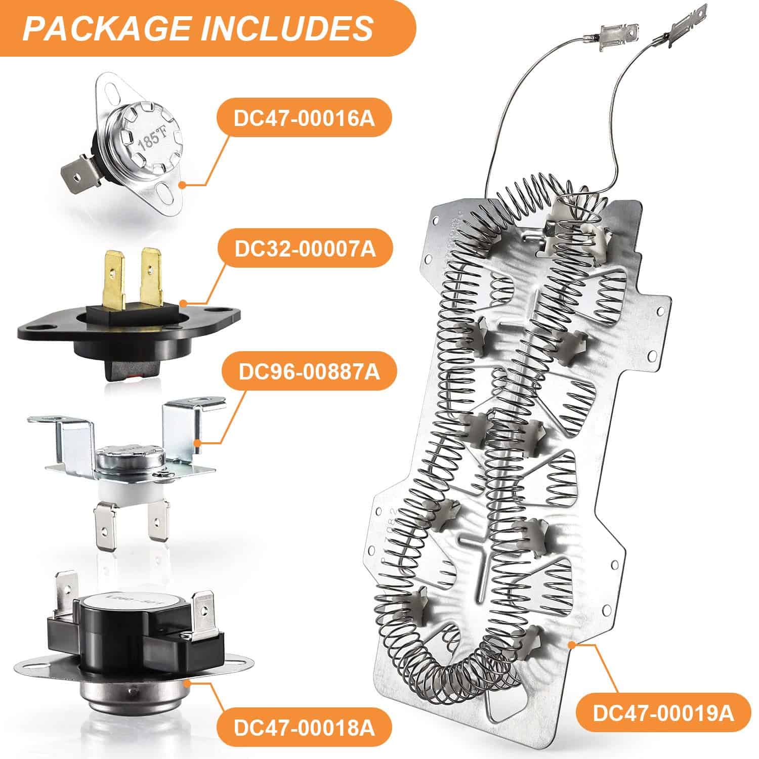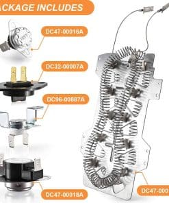 PAQUETE INCLUYE: (Consulte la imagen para detalles) 1 elemento calefactor DC47-00019A (5300w 240 voltios) 1 termostato de límite alto DC47-00018A 1 fusible térmico DC47-00016A (termostato) 1 sensor de temperatura termistor DC32-00007A 1 fusible térmico de límite alto DC96-00887C (termostato) con soporte PERFECTA PIEZA DE REPUESTO: El elemento calefactor DC47-00019A (5300w 240 voltios) reemplaza a AP4201899, 2068550, PS2038533, EAP2038533. El fusible térmico de límite alto DC96-00887C (termostato) con soporte reemplaza a DC96-00887A, 2074129, AP4207819, PS4216838, EAP4216838. El sensor de temperatura termistor DC32-00007A reemplaza a N3S1-K41, N3SI-K41, 2068429, AP4201716, PS2461163, EAP2461163. El fusible térmico DC47-00016A (termostato) reemplaza a 2068545, AP4201894, EAP4205213, PS4205213. El termostato de límite alto DC47-00018A reemplaza a 35001092, 1122485, AP4201898, PS2430930, EAP2430930…