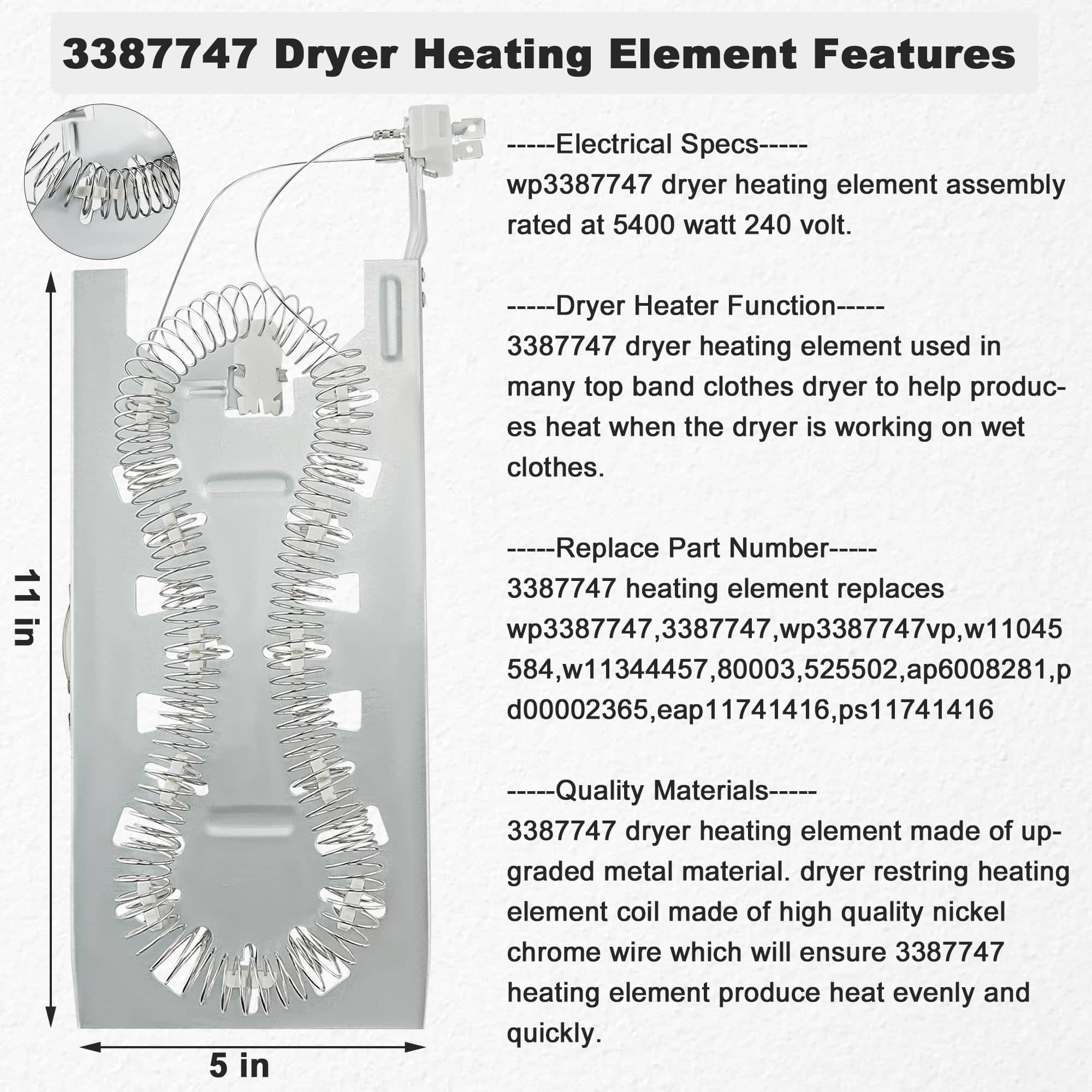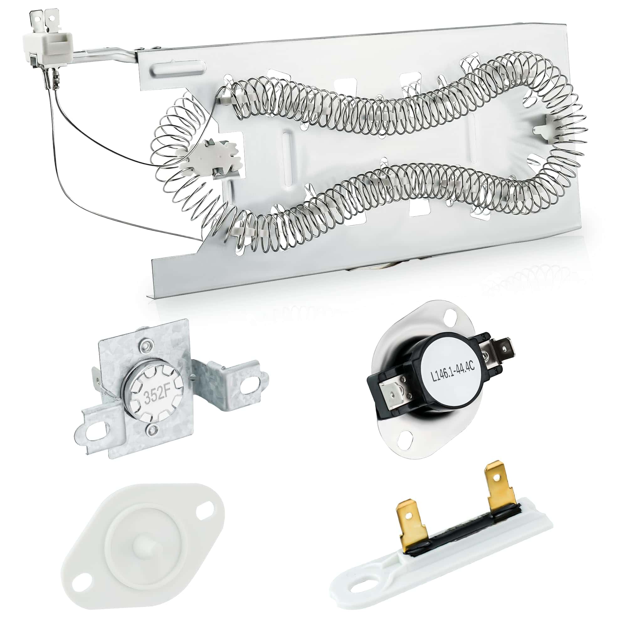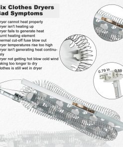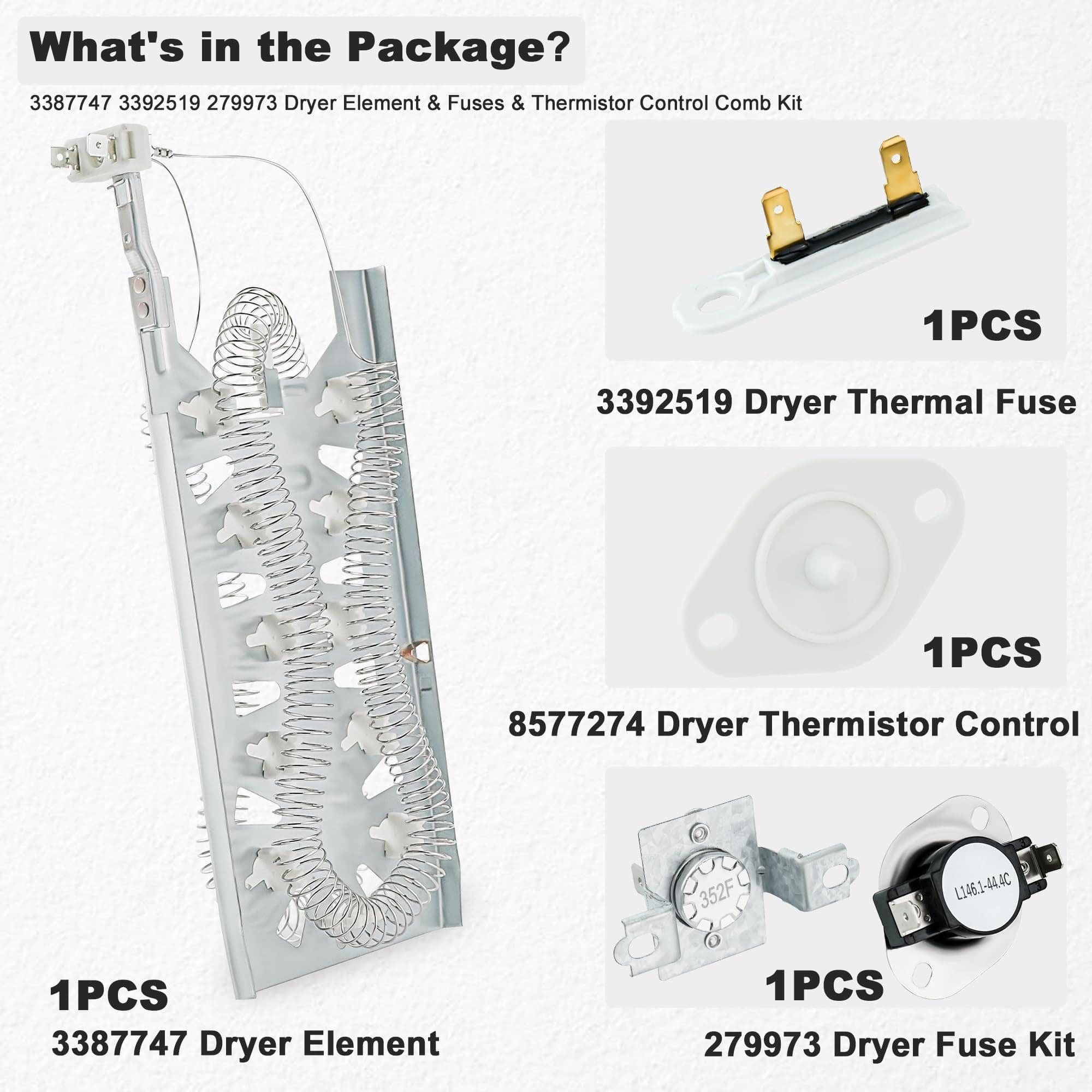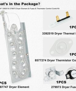 Número de Parte: 3387747. Calificado a 5400 Watts 240 Volts y tiene terminales de 2-5/16 pulgadas. El elemento calefactor para secadora 3387747 reemplaza los números de parte: WP3387747, WP3387747VP, 8527865, 8003, AP2947033, AP6008281, PS11741416 y PS344597. Número de Parte: 279973. El fusible térmico y termostato 279973 reemplaza los números de parte: 3391913, 3404151, 3404152, 3977395, 8318314, 897710 AP3094323 PS334387 279973VP EAP334387. Número de Parte: 8577274. El termistor para secadora 8577274 se adhiere a la carcasa del soplador y monitorea y ayuda a regular la temperatura dentro de la secadora. El termistor 8577274 reemplaza los números de parte: 3390292, 3406294, 3976615, 772546, WP8577274, WP8577274VP. Número de Parte: 3392519. El fusible térmico 3392519 se utiliza en secadoras como un mecanismo de seguridad que detiene el flujo de electricidad al circuito del motor cuando la secadora se sobrecalienta. El fusible térmico 3392519 reemplaza el número de parte: 3388651, 694511, 80005, WP3392519VP, ET401. Compatible con la mayoría de las marcas reconocidas: Whirlpool, Maytag, KitchenAid, Jenn-Air, Amana, Magic Chef, Admiral, Norge, Roper y otras. Repara los siguientes síntomas: Sin calor o insuficiente, la secadora no arranca, demasiado caliente, se apaga demasiado pronto, tarda mucho en secar. Lista de paquetes: 1PC Elemento Calefactor 3387747, 1PC Kit Fusible Térmico 279973, 1PC Termistor 8577274, 1PC Fusible Térmico 3392519. Modelos compatibles: ¡Si no estás seguro de si el modelo es adecuado, contáctanos! 4GWED5500YW0, 4GWED5500YW1, 4GWED5500YW2, 4GWED5500YW3, 4KWED4750BQ0, 4KWED4750BQ1, 4KWED4900BQ0, 4KWED4900BQ1, 4KWED4900BW0, 4KWED4900BW1, 7EWED5550YW0, 7EWED5550YW1, 7MWED5600BW0, 7MWED5620HW0