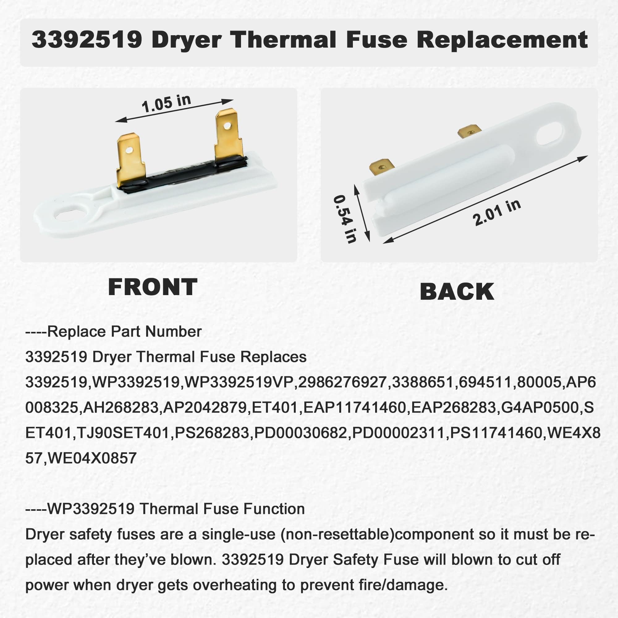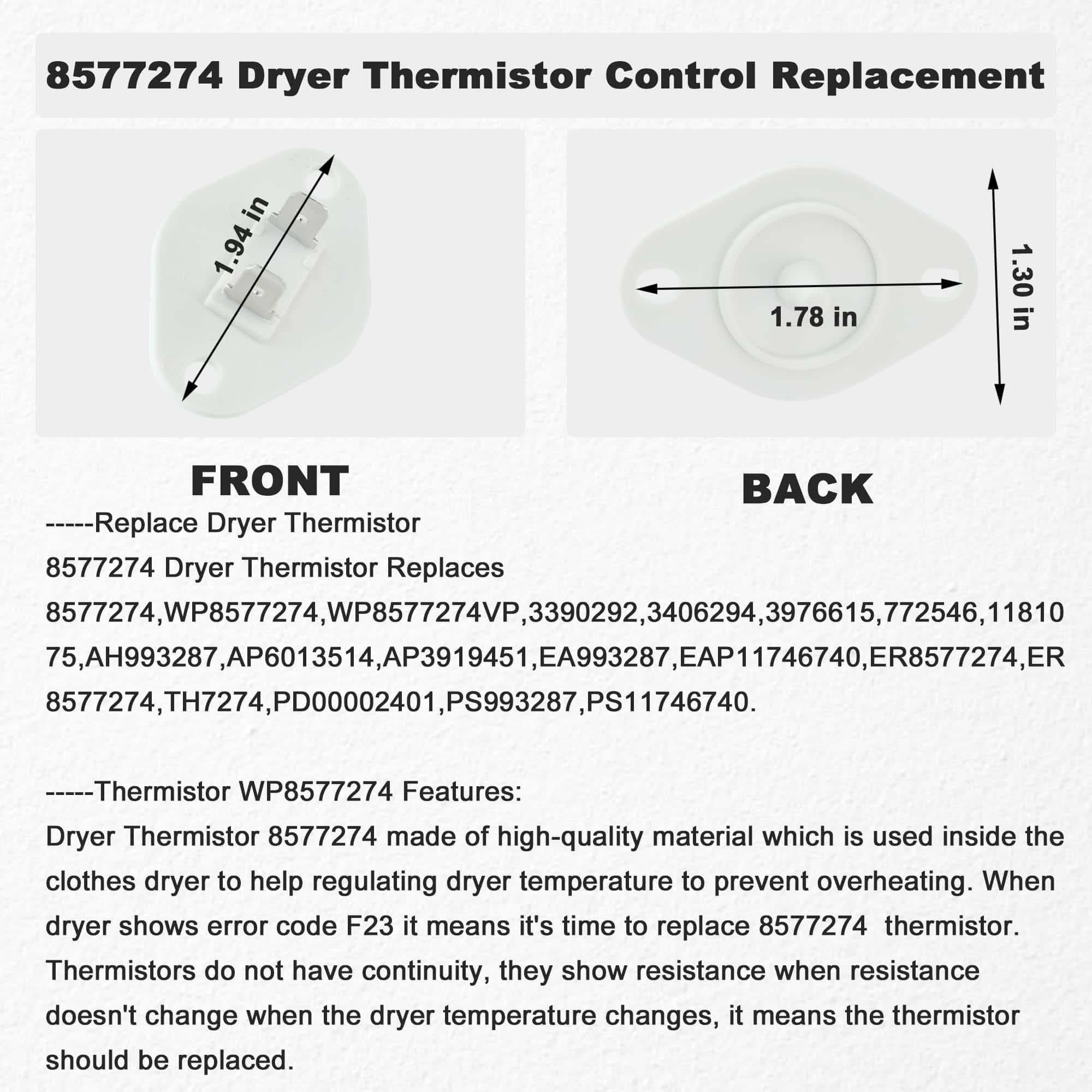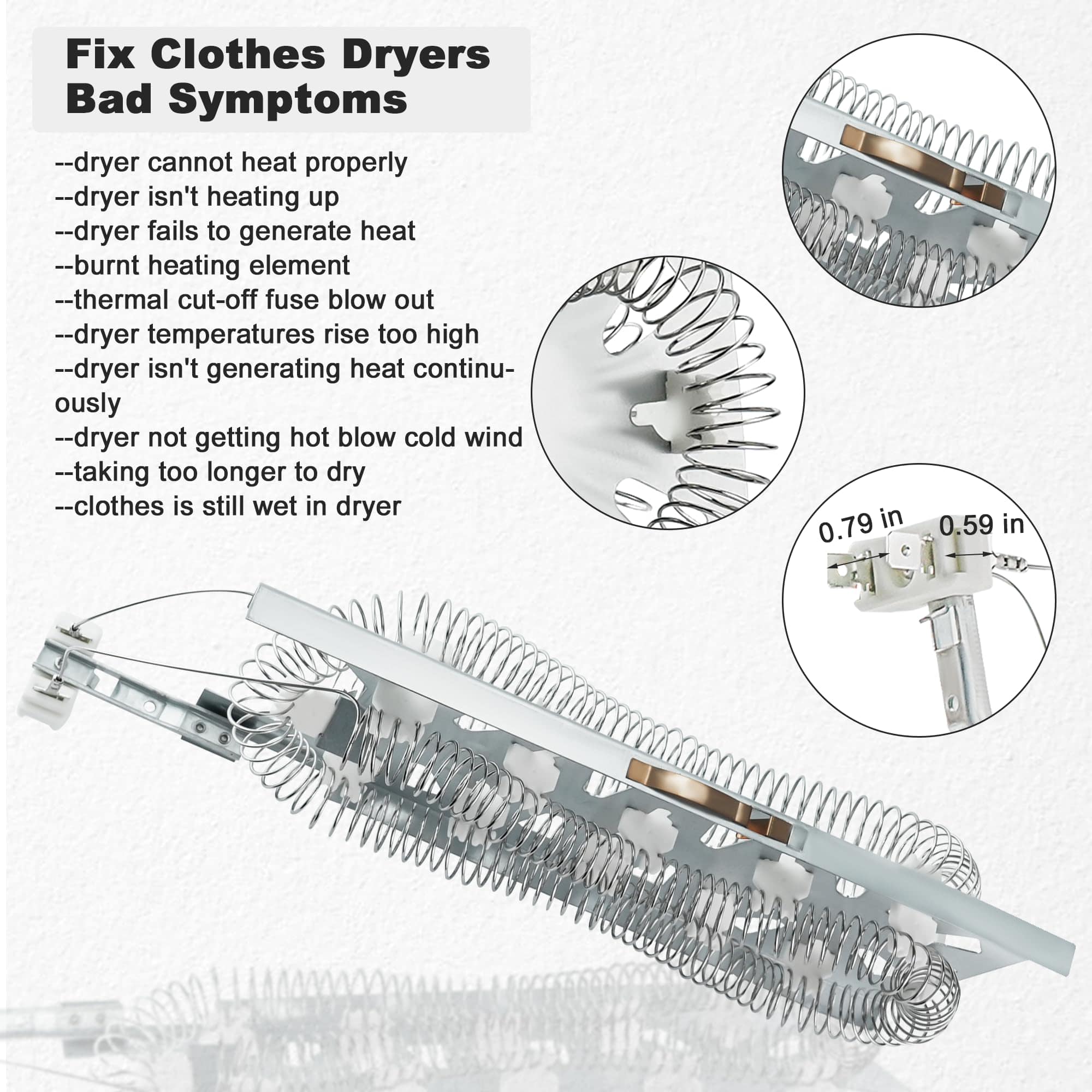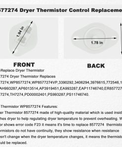 Número de Parte: 3387747. Calificado a 5400 Watts 240 Volts y tiene terminales de 2-5/16 pulgadas. El elemento calefactor para secadora 3387747 reemplaza los números de parte: WP3387747, WP3387747VP, 8527865, 8003, AP2947033, AP6008281, PS11741416 y PS344597. Número de Parte: 279973. El fusible térmico y termostato 279973 reemplaza los números de parte: 3391913, 3404151, 3404152, 3977395, 8318314, 897710 AP3094323 PS334387 279973VP EAP334387. Número de Parte: 8577274. El termistor para secadora 8577274 se adhiere a la carcasa del soplador y monitorea y ayuda a regular la temperatura dentro de la secadora. El termistor 8577274 reemplaza los números de parte: 3390292, 3406294, 3976615, 772546, WP8577274, WP8577274VP. Número de Parte: 3392519. El fusible térmico 3392519 se utiliza en secadoras como un mecanismo de seguridad que detiene el flujo de electricidad al circuito del motor cuando la secadora se sobrecalienta. El fusible térmico 3392519 reemplaza el número de parte: 3388651, 694511, 80005, WP3392519VP, ET401. Compatible con la mayoría de las marcas reconocidas: Whirlpool, Maytag, KitchenAid, Jenn-Air, Amana, Magic Chef, Admiral, Norge, Roper y otras. Repara los siguientes síntomas: Sin calor o insuficiente, la secadora no arranca, demasiado caliente, se apaga demasiado pronto, tarda mucho en secar. Lista de paquetes: 1PC Elemento Calefactor 3387747, 1PC Kit Fusible Térmico 279973, 1PC Termistor 8577274, 1PC Fusible Térmico 3392519. Modelos compatibles: ¡Si no estás seguro de si el modelo es adecuado, contáctanos! 4GWED5500YW0, 4GWED5500YW1, 4GWED5500YW2, 4GWED5500YW3, 4KWED4750BQ0, 4KWED4750BQ1, 4KWED4900BQ0, 4KWED4900BQ1, 4KWED4900BW0, 4KWED4900BW1, 7EWED5550YW0, 7EWED5550YW1, 7MWED5600BW0, 7MWED5620HW0