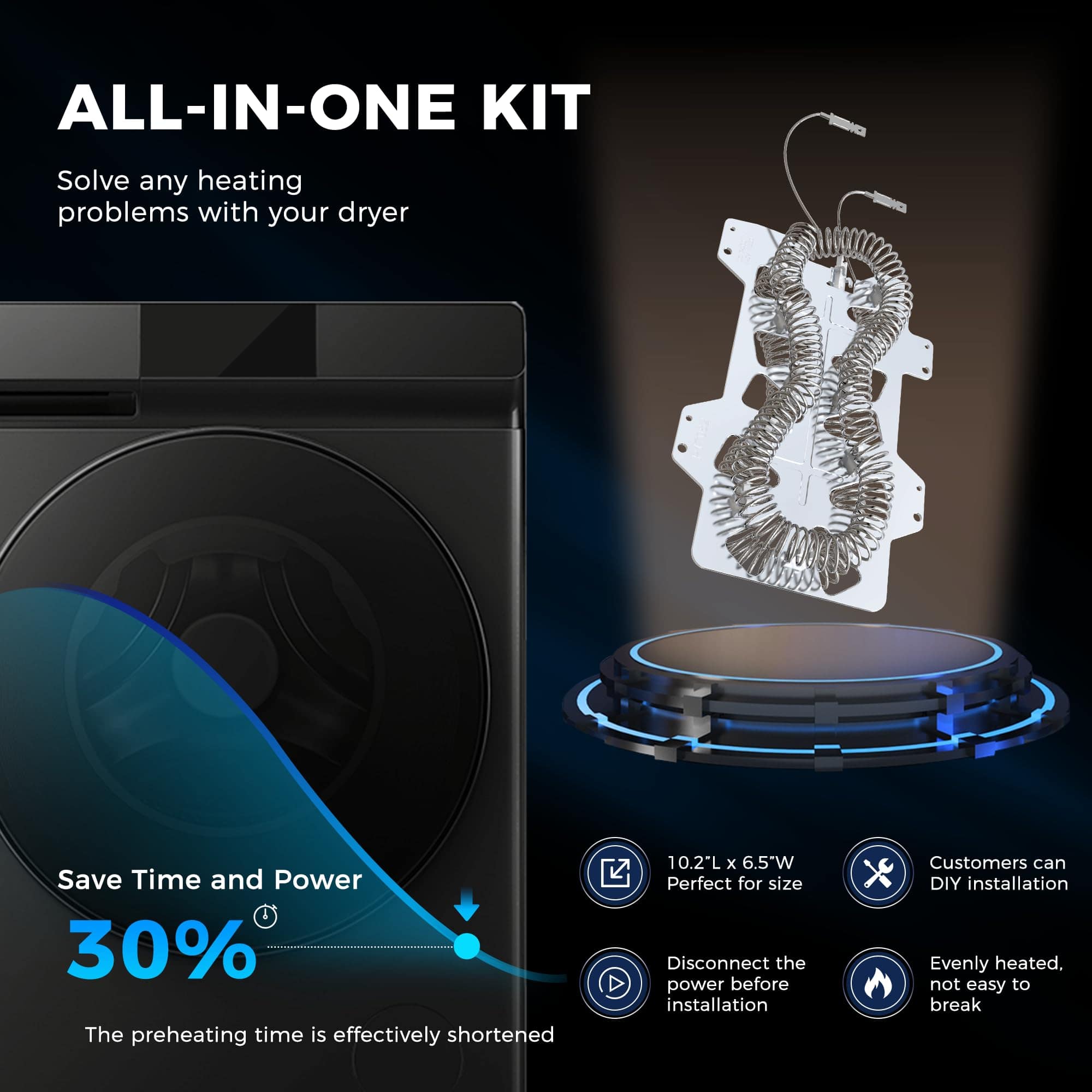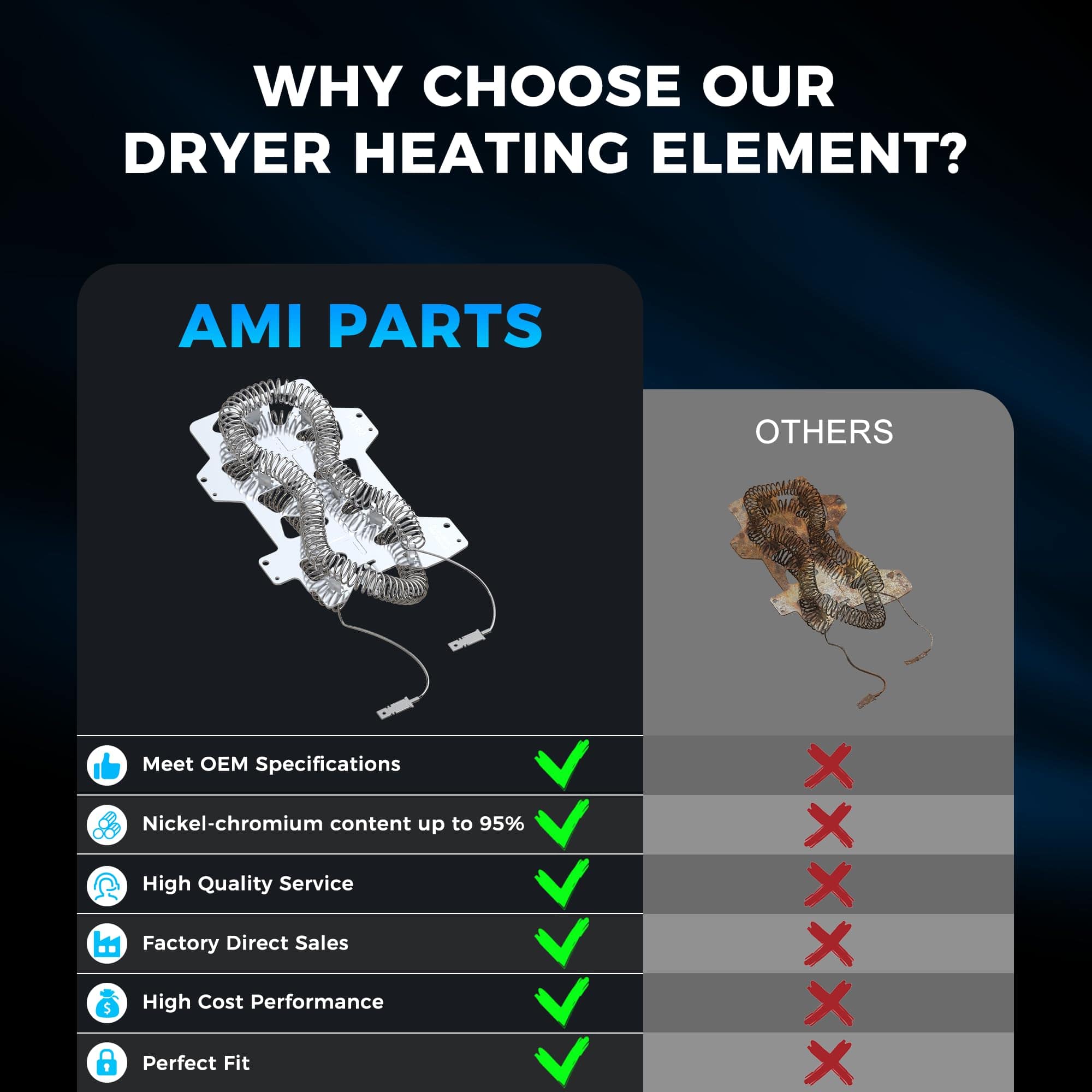 1. Modelo de Referencia Se ajusta al elemento calefactor de la secadora samsung: dv40j3000ew/a2, dv42h5000ew/a3 dv45h7000ew/a2, dv42h5200ew/a3 dv48h7400ew/a2, dve50m7450w/a3, dv42h5200ep/a3, dv45h7000ew/A2 dve50r5400v/a3, etc. Para ahorrar tiempo y evitar cometer un error de compra, asegúrese de que el modelo coincida antes de comprar. 2. Estructura del Material El alambre del elemento calefactor de Samsung es un 30% más largo que el de otros alambres de secadora, y la resistencia aumenta un 70%, lo que puede alcanzar la temperatura preestablecida más rápido y acortar el tiempo de calentamiento en un 30%. No deje que el alambre de aleación de niquel-cromo del alambre calefactor toque la carcasa durante la instalación. Por favor, limpie el pelusa que cae de la ropa dentro de la secadora regularmente. Esto hará que su secadora dure más tiempo. Recuerde desconectar la fuente de alimentación antes de la instalación. 3. Aviso-Se puede instalar en el ensamblaje DC97-14486A El elemento calefactor de la secadora DC47-00019A es compatible con secadoras Samsung, May-tag, Ama-na y Ken-more. 240V 5300W. 4. El paquete incluye 1 Elemento Calefactor para Secadora DC47-00019A, 1 Fusible Térmico DC96-00887A, 1 Fusible Térmico DC47-00016A, 1 Termostato DC47-00018A, 1 Termistor DC32-00007A. 5. Post Venta 100% Calidad en el Servicio – Todos los elementos calefactores DC47-00019A son probados en cuanto a seguridad al 100% para garantizar una calidad consistente en la que puede confiar. La calidad del elemento calefactor de la secadora ha sido certificada en el país y en el extranjero. Le servimos sinceramente. Por cualquier motivo que no esté satisfecho, puede solicitar un reemplazo. ¡Si no está satisfecho con las piezas de repuesto del elemento calefactor de sam.sung, contáctenos! AMI PARTS le mostrará nuestra actitud sincera y una solución satisfactoria.
