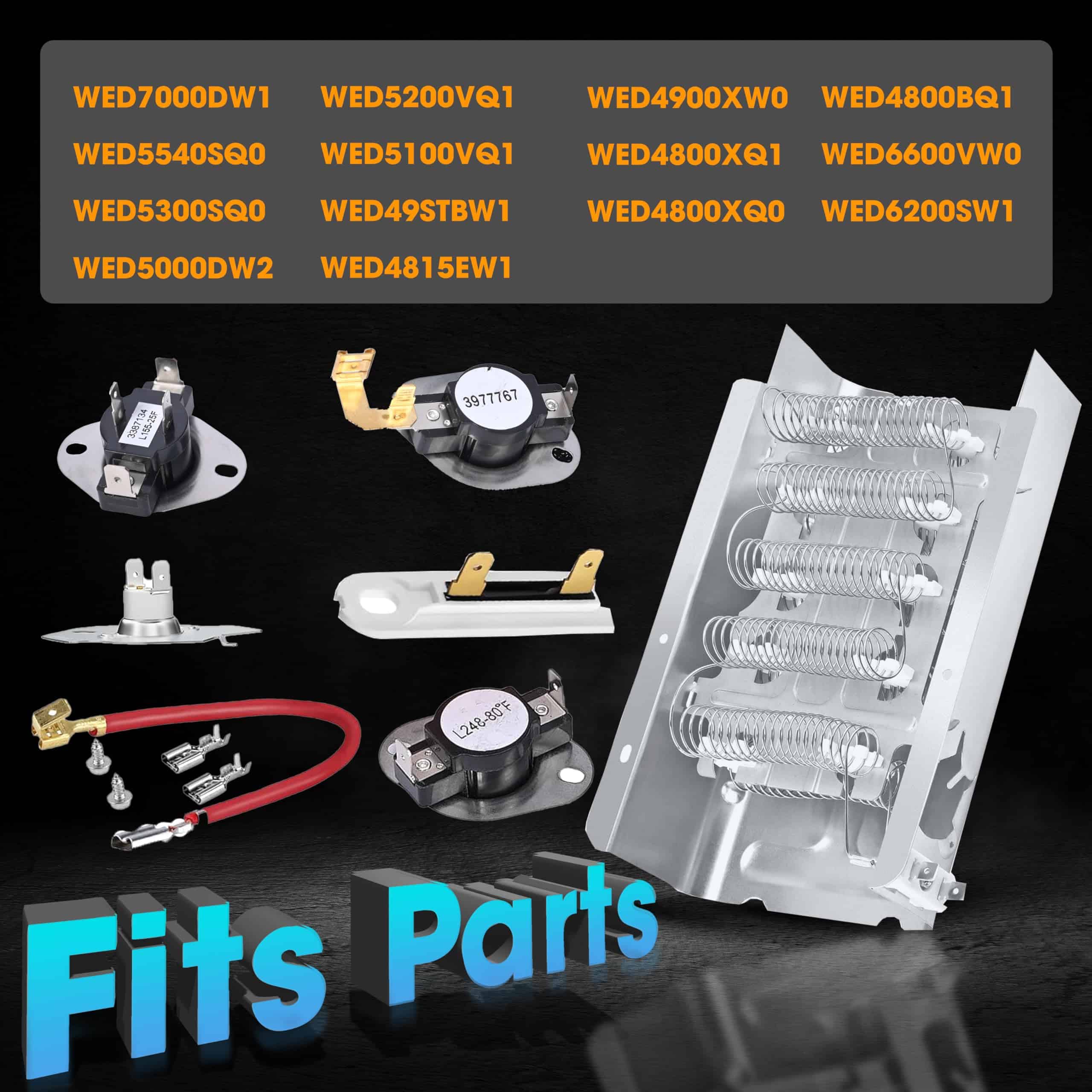Eleve el rendimiento y la eficiencia de su secadora con nuestro Kit de Elemento Calefactor para Secadora de 5400W. Esta solución todo en uno está diseñada para abordar problemas comunes de las secadoras, por lo que es perfecta para una reparación de bricolaje. En su interior, encontrará un elemento calefactor premium, fusibles térmicos, termostatos, cables de puente y terminales hembra de espiga, todo diseñado para una fácil instalación.