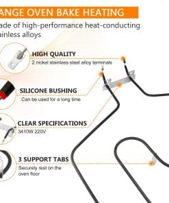Este elemento de horneado tiene una potencia nominal de 3410 vatios y un voltaje de 220 voltios. Sus dimensiones son de 19 1/2″ de largo, 18 1/2″ de ancho y un espaciado de terminal de 3 pulgadas. Tiene 3 pestañas de soporte para descansar de forma segura en el piso del horno y un soporte de montaje con 2 agujeros para fijarlo directamente a la pared trasera del horno con tornillos.