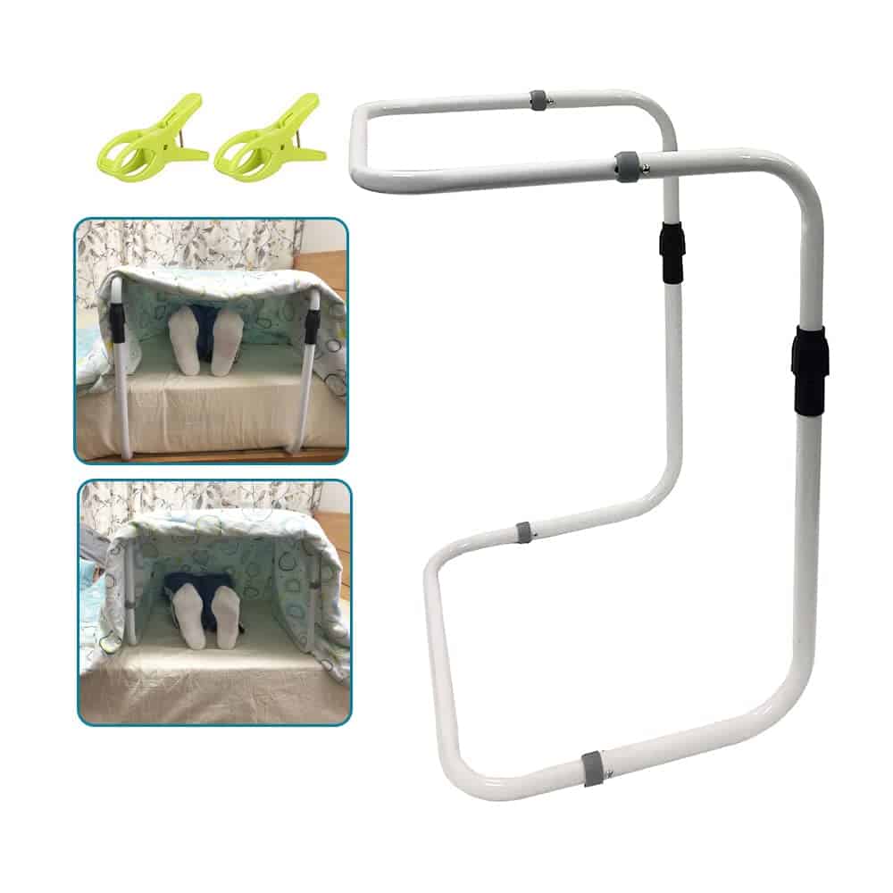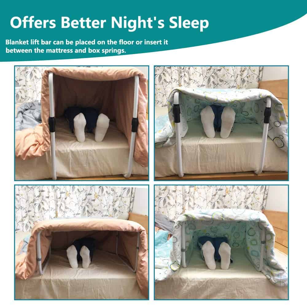 La barra de elevación de mantas de apoyo mantiene las cubiertas fuera de los pies para aliviar el dolor, la tensión y la presión durante el sueño, lo cual es ideal para aquellos con Artritis, Gota, Dolor en los Pies, CRPS, Fractura de Pies o Piernas, Calambres en las Piernas, Piernas Fatigadas, o para ayudar con la recuperación de cirugía.