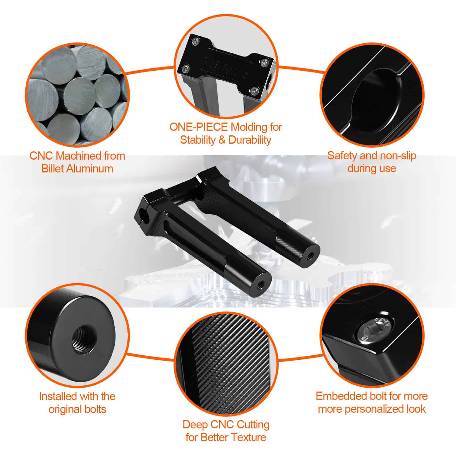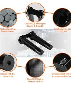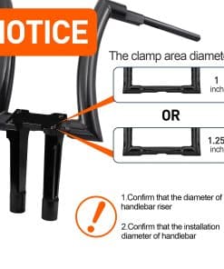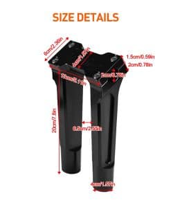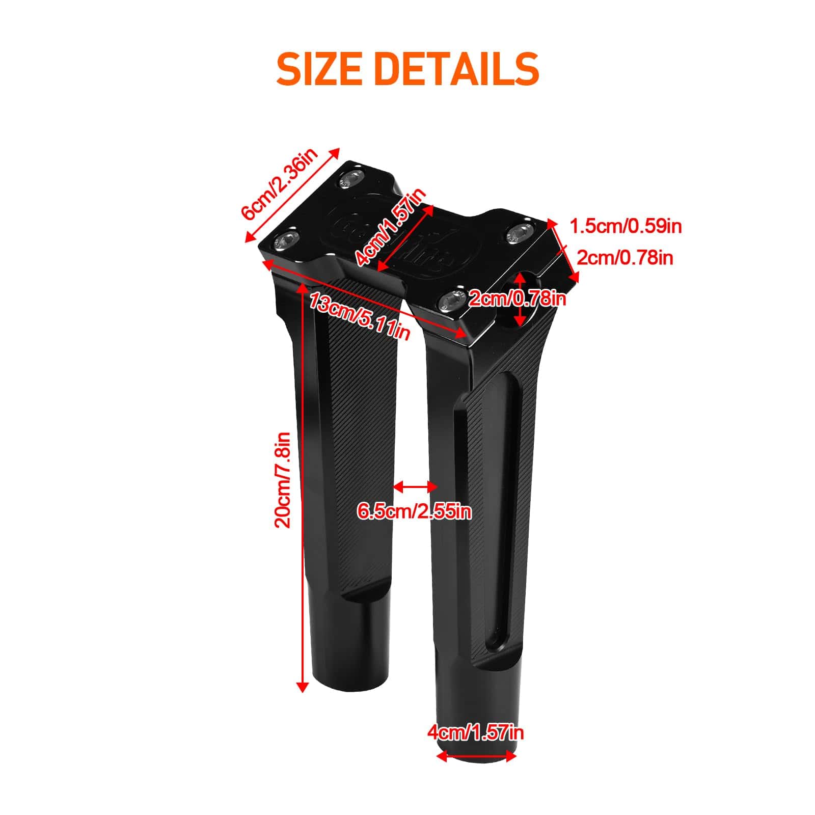 Elevadores de Manillar Recto para Motocicleta Harley, Hutexico 1 pulgada de Aluminio Elevador de Manillar Alto con Abrazadera Superior de una Pieza para Sportster Dyna Road Glide FXLRS. Este kit de elevadores de manillar de motocicleta para mejor ajuste y apariencia integrada. Se adapta a la mayoría de las motocicletas Harley o de otras marcas con un área de agarre de 1″, funciona con cualquier manillar estándar de 1″. Distancia de centro a centro en los agujeros de montaje del elevador de 3 1/2″. Agujero base roscado para pernos de montaje estándar de 1/2″-13 (pernos no incluidos) (Tamaño Estándar). Contenido del paquete: Elevadores de Manillar con una Abrazadera Superior de una Pieza con 4 tornillos de montaje, instrucciones no incluidas. El duradero elevador de manillar de motocicleta para Harley Dyna está hecho de aluminio de alta resistencia mecanizado por CNC y proceso de moldeo de una sola pieza por CNC para la abrazadera superior que tiene mejor resistencia, resistencia y seguridad que los de hierro. El interior del tubo del manillar adopta un patrón antideslizante cortado por CNC, que puede ser más antideslizante y estable. La posición precisa de los tornillos de montaje se puede cortar para adaptar perfectamente las conexiones de tornillos. Los elevadores de barra de aluminio duraderos reubican el manillar hacia arriba y agregan más comodidad durante viajes más largos. Los elevadores de la motocicleta brindan alivio inmediato a quienes se estiran para alcanzar sus manillares con 8 pulgadas de altura y tendrán la pulgada extra para ajustar mejor su configuración. Proporciona una posición de conducción más erguida y cómoda al elevar el manillar tubular de diámetro original, sin necesidad de reemplazar tus barras de mano. Nuestros elevadores de manillar tienen características resistentes al agua y al óxido para mantener tu moto a salvo del viento y la lluvia, a la vez que son muy fáciles de limpiar con solo un paño húmedo. Recubrimiento en polvo negro brillante y pulido a mano para resistencia al óxido. Textura elegante con corte de franja único por CNC en ambos lados de los postes del manillar y sin hardware visible para mejorar el aspecto personalizado de los elevadores de barra. Elimina virtualmente el deslizamiento del manillar cuando se usan manillares más altos. Los robustos elevadores de aluminio fresados por CNC ofrecen mejores posiciones de conducción para mayor comodidad. Diseñado para aumentar la rigidez y estabilidad del manillar. El kit de abrazadera de elevadores de manillar de motocicleta está diseñado para una instalación fácil y uso sencillo, podrás terminar por ti mismo. Postventa: Garantía de un año a partir de la fecha de compra, cualquier problema con el producto por favor avísanos, ofreceremos soluciones lo antes posible.