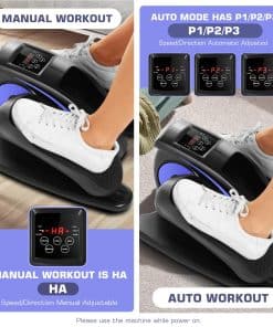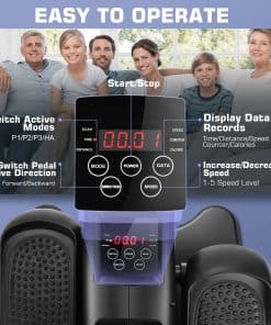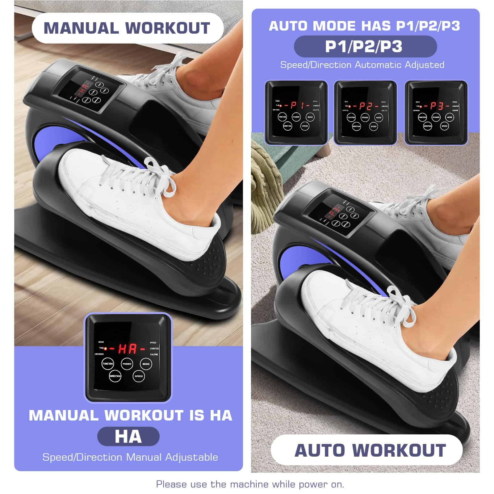 2. Función de movimiento múltiple: Dependiendo de sus necesidades y habilidades, el elipsómetro para piernas como se ve en la tv tiene las opciones Automático (P1-P3) y Manual (5 niveles de velocidad) para su elección. Los pedales pueden ir hacia adelante o hacia atrás para enfocarse en diferentes músculos. Nota: úselo solo estando sentado.