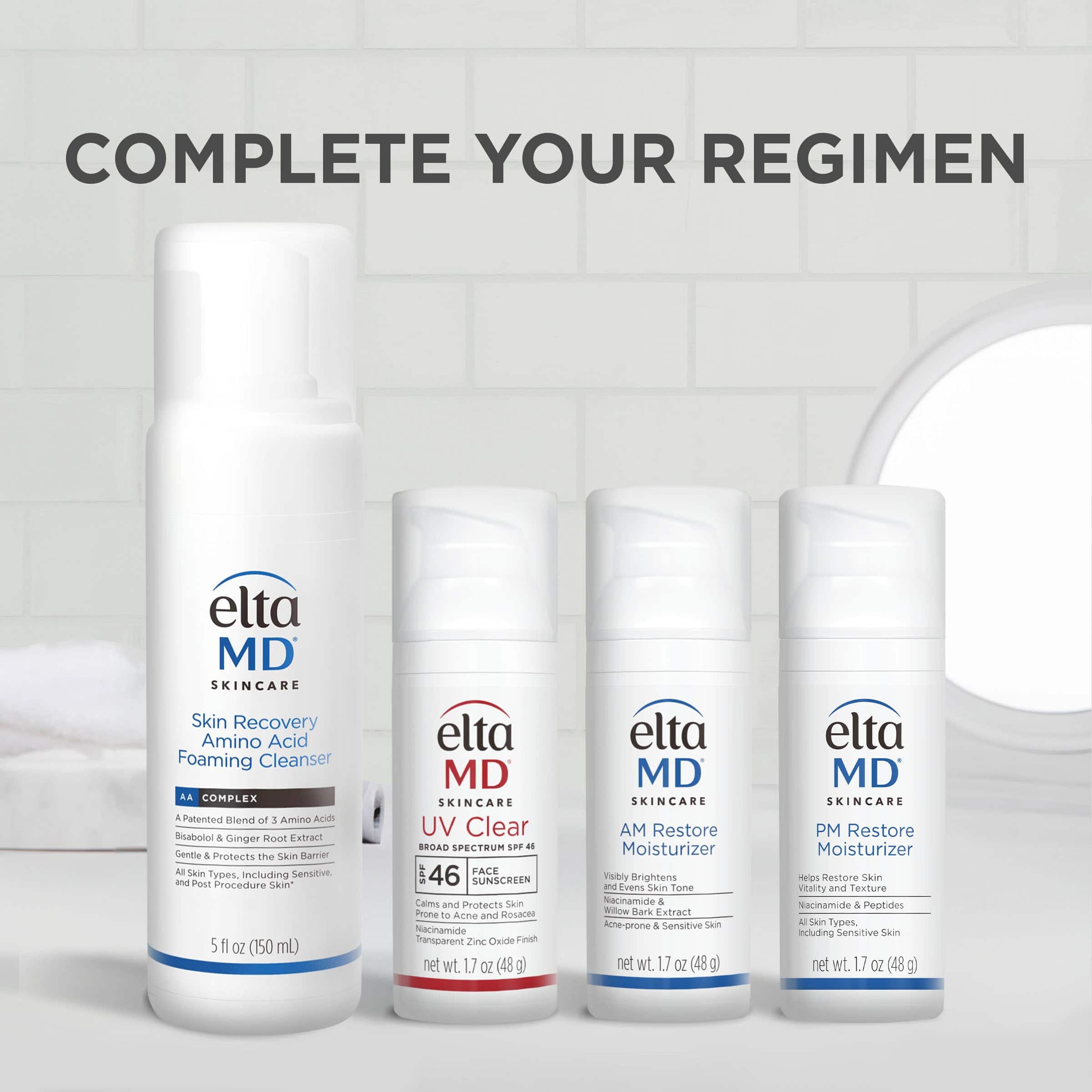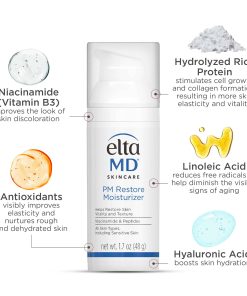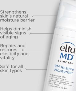 EltaMD PM Restore Face Moisturizer es una crema hidratante facial nocturna de una marca confiable en productos para el cuidado de la piel. Ofrece una solución antienvejecimiento con su fórmula que ayuda a restaurar los niveles naturales de humedad de la piel durante la noche. También cuenta con ingredientes clave como Ácido Hialurónico y Niacinamida, que trabajan juntos para reducir los signos visibles del envejecimiento. Esta crema hidratante Elta MD para la piel es libre de aceites, sin fragancia y segura para todo tipo de piel, lo que convierte a esta crema antienvejecimiento para la cara en una opción adecuada para muchas personas. Esta loción facial para mujeres y hombres es no comedogénica, hidratando la piel sin obstruir los poros.