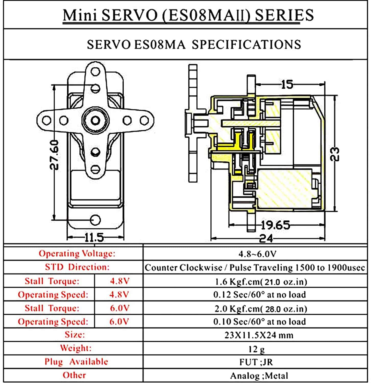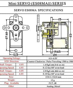 Voltaje de funcionamiento: 4.8V~6.0V Corriente de operación: 200mA/60 Velocidad de funcionamiento: 0.12sec/60 a 4.8V; 0.10sec/60 a 6V Par de giro: 1.5/1.8 kg.cm 20.8/24.9 oz.in (4.8V/6v) Banda muerta: 1-2 uSec Material del engranaje: Metal Longitud del cable del conector: 25 cm Tipo de conector: Compatible con Futaba/JR Peso del paquete de un solo servo: 12g / 0.42oz Tamaño del paquete de un solo servo: 23×11.5x24mm(0.9 x 0.45 x 0.94inch) Tamaño total del paquete: aproximadamente 48×11.5x50mm(1.89 x 0.45 x 1.97inch) Alcance: Helicópteros KT, planeo, deslizamiento, pequeños robots y otros modelos Paquete incluido: 4 x EMAX ES08MA II Mini Servo de Engranaje de Metal Analógico