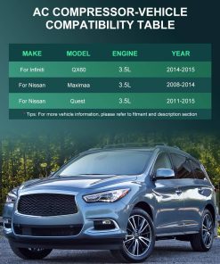1. Ajuste del embrague del AC: 2013 Apto para Infiniti JX35 3.5L, 2014-2015 Apto para Infiniti QX60 3.5L, 2008-2014 Apto para Nissan Maxima 3.5L, 2009-2014 Apto para Nissan Murano 3.5L, 2013-2015 Apto para Nissan Pathfinder 3.5L, 2011-2015 Apto para Nissan Quest 3.5L.