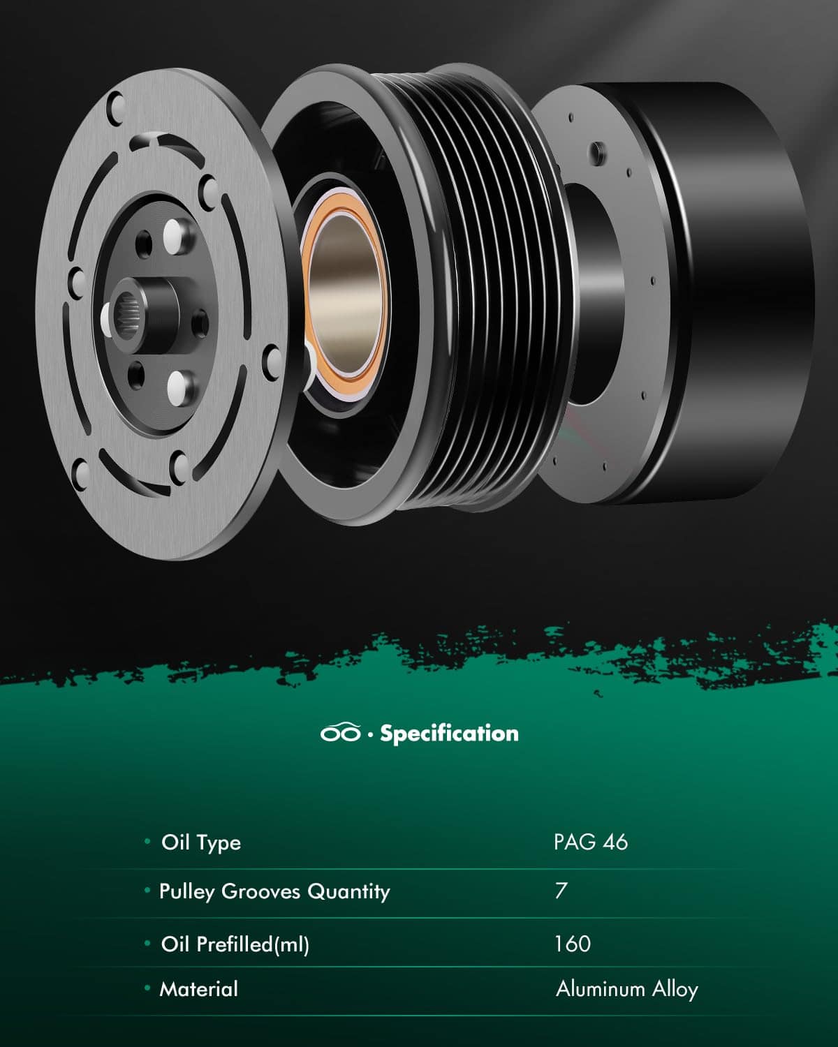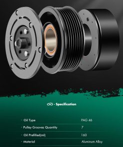 3. Especificaciones: Tipo de Aceite: PAG46; Cantidad de Estrías en la Polea: 7; Material: Aleación de Aluminio; Clutch Incluido: Sí; Aceite Precargado: 160 ml.