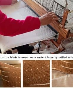 Tejido a mano – La tela de algodón está tejida en un telar antiguo por artesanos expertos. Tiene una textura ligeramente áspera y gruesa con un acabado mate. Al tocar el Mudcloth, puedes sentir la textura del algodón tejido. Puede ser rígido, especialmente cuando es nuevo, pero se suaviza con el uso y lavado.