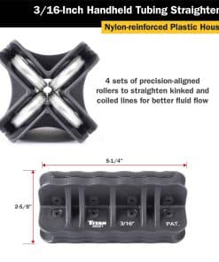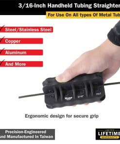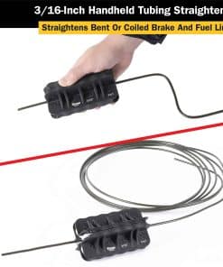 Endereza tubos de freno y combustible con esta herramienta duradera y compacta. El exterior de plástico reforzado con nailon alberga 4 juegos de rodillos de precisión para enderezar tubos doblados y enrollados para un mejor flujo de fluido. Esta herramienta fácil de usar ayudará a eliminar curvas y pliegues en todo tipo de tuberías metálicas, incluyendo acero, acero inoxidable, cobre, aluminio y más. Introduce el tubo y pásalo por los rodillos para obtener un tubo recto, fácil de usar, que es fácil de indexar y medir. Hecho en Taiwán.