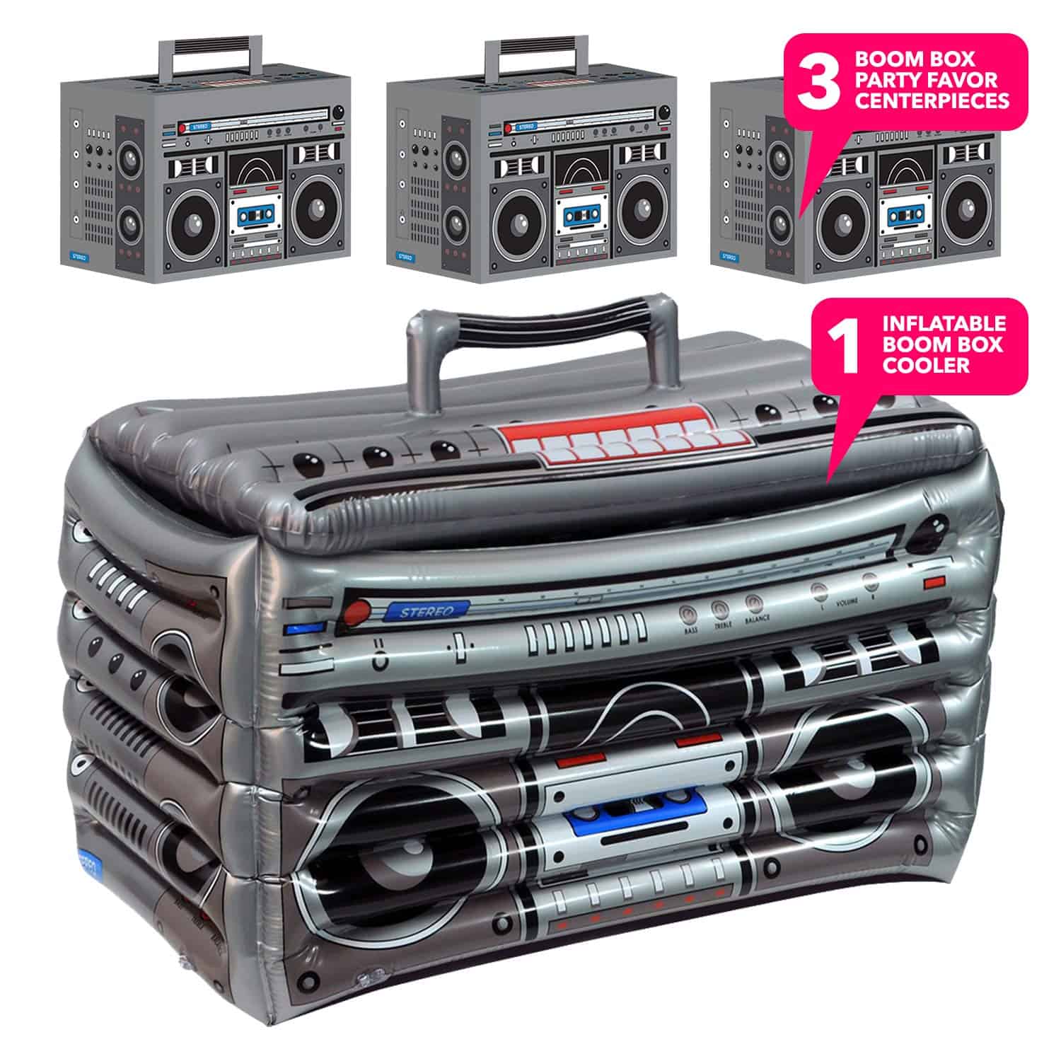 ¡Disfrute de su barbacoa de verano, fiesta de décadas de los 80 o 90 y cualquier evento con temática musical con este genial set de Enfriador de Bebidas Boom Box y Centros de Mesa! ¡Siéntese al lado de la piscina, de la hoguera, en la playa o cerca de cualquier estación de bebidas con este enfriador decorativo y funcional! El tamaño grande tiene capacidad para aproximadamente 48 latas cada uno, mientras usted organiza su evento con estilo. Desinfle y guarde para usar una y otra vez. Las decoraciones de favores de fiesta son una excelente manera de agregar decoración adicional durante todo su evento.