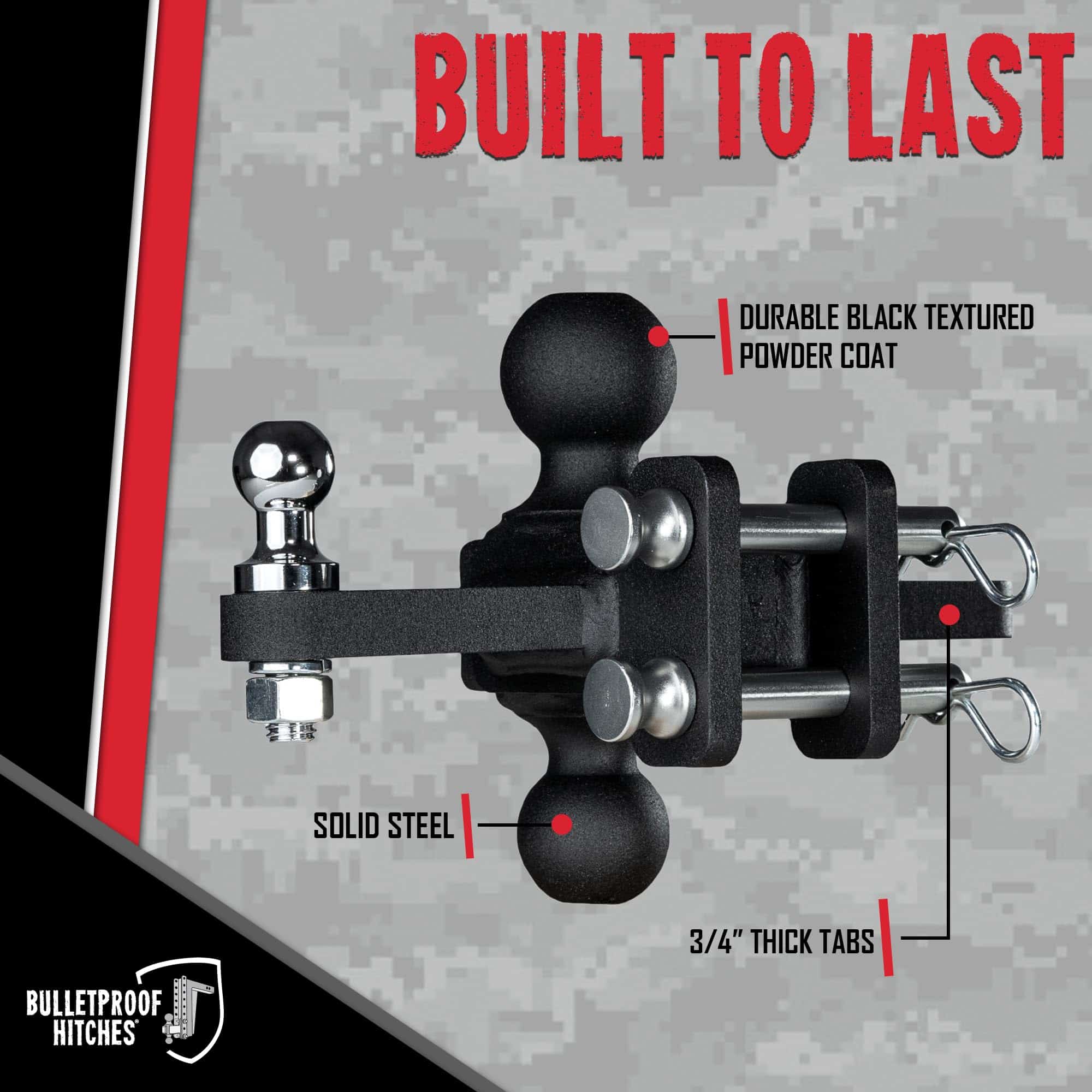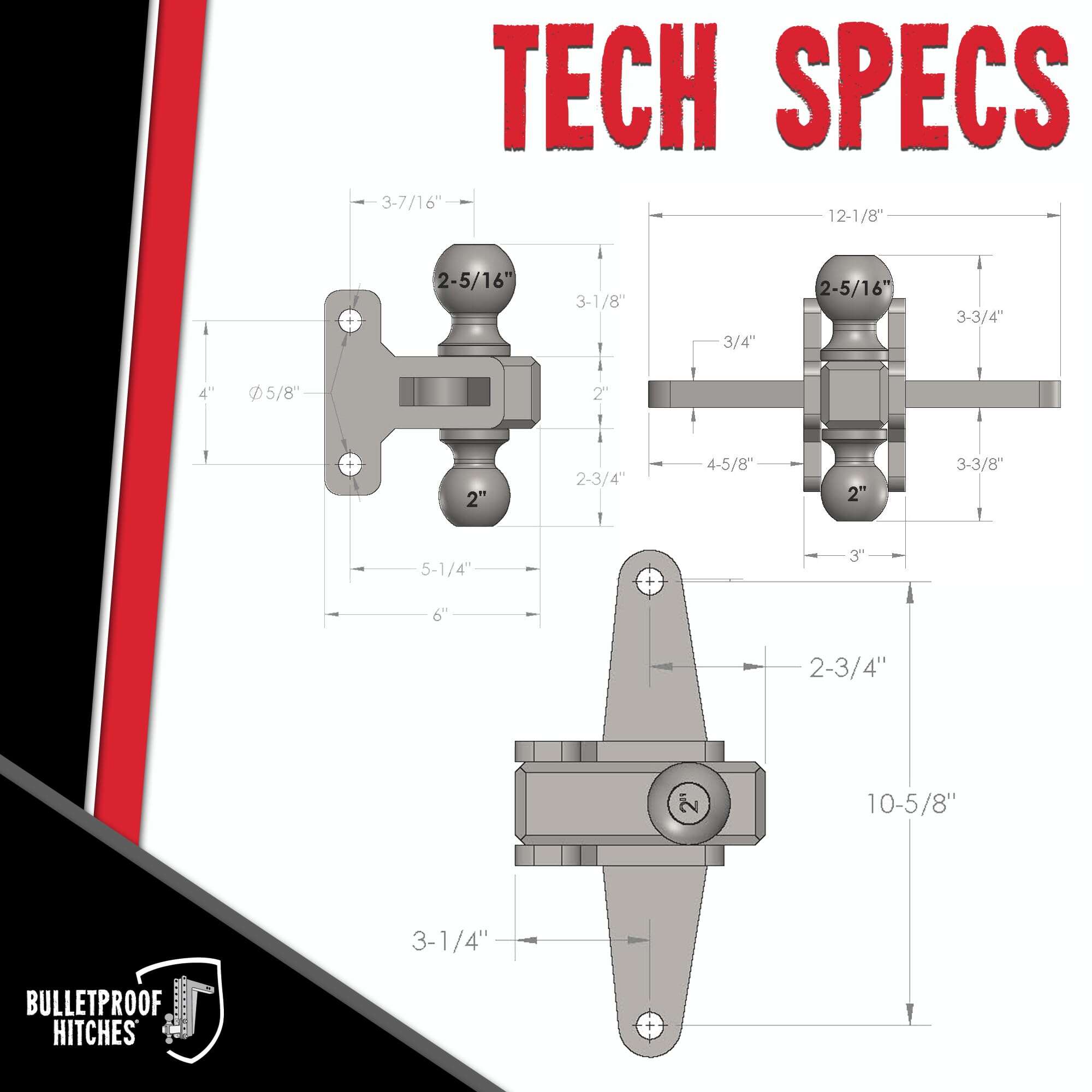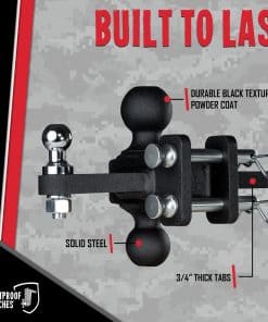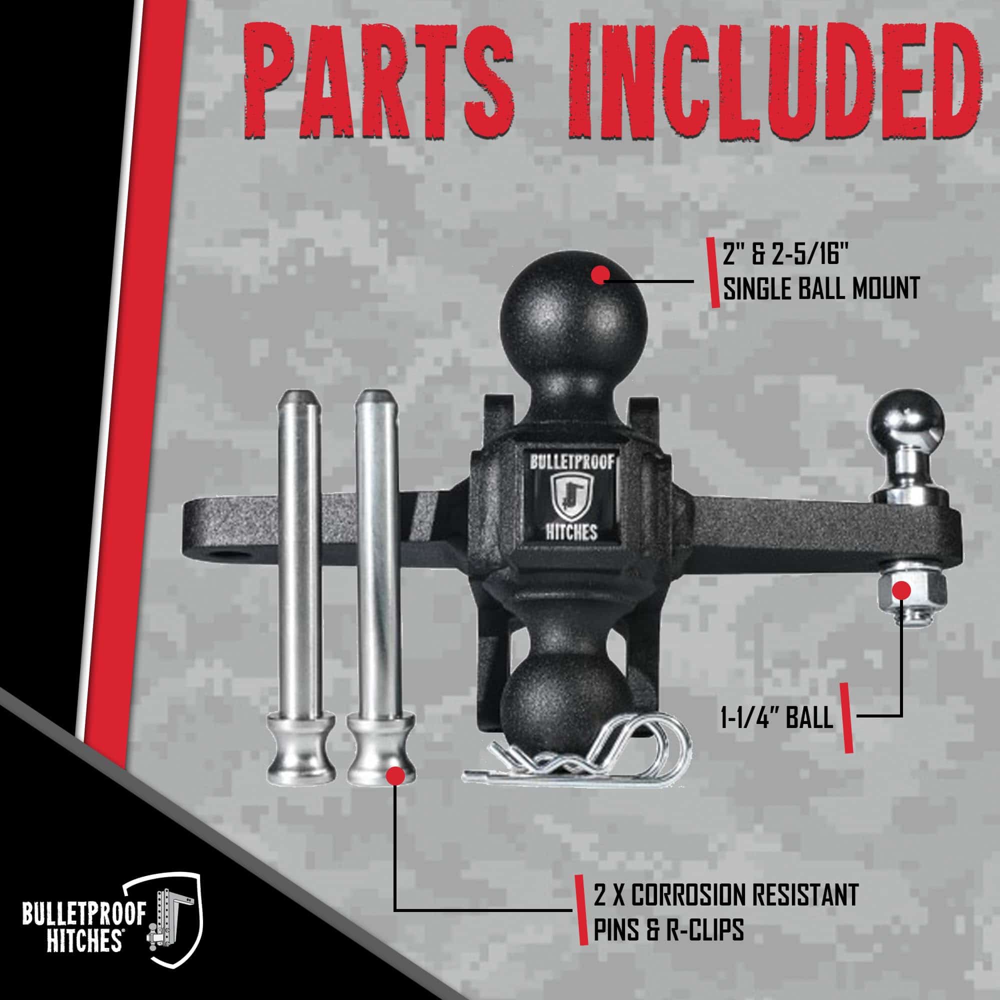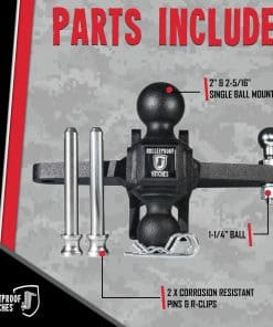 1. Preparado para Sistema de Control de Balanceo: Monte su barra de control de balanceo con facilidad utilizando nuestro montaje de bola; se conecta directamente a su enganche y proporciona un punto de conexión estable entre su remolque y el Sistema de Control de Balanceo. 2. Capacidad y Compatibilidad de Servicio Pesado: Este montaje de bola de barra de balanceo es compatible de forma universal con todos los enganches BulletProof de acero y soporta hasta 36,000 lbs de control de balanceo de remolque cuando se combina con nuestro Enganche de Servicio Extremo y Sistema de Control de Balanceo. 3. Diseño de Bola Dual y Placa Lateral: Cuenta con una bola de 2″ y 2-5/16″ combinada y placas laterales dobles, lo que le permite cambiar de remolques y montar su sistema de control de balanceo en cualquier lado ideal para diseños de remolque que limitan la articulación. 4. Construido para Durar: Construido en acero sólido con un acabado de recubrimiento de polvo negro, este montaje de bola de enganche contra balanceo de remolque resiste la corrosión y proporciona un control de balanceo confiable para remolques de viaje, ayudándole a remolcar cargas pesadas con confianza. 5. Piezas Incluidas: Incluye montaje de bola dual de acero sólido de 2″ y 2-5/16″ con placa de 3/4″, bola de control de balanceo de 1-1/4″, dos pasadores de 5/8″ resistentes a la corrosión y dos clips en R para una instalación segura.