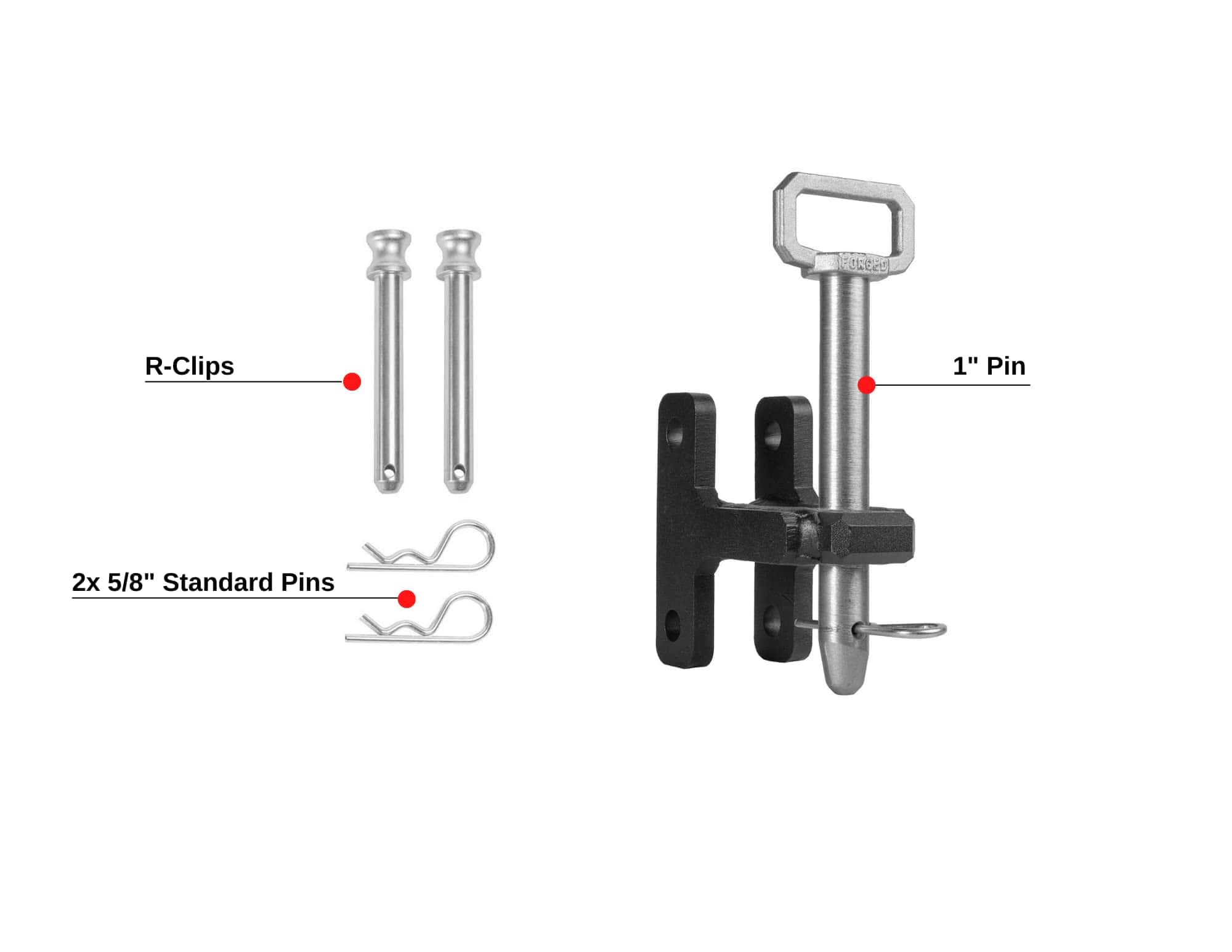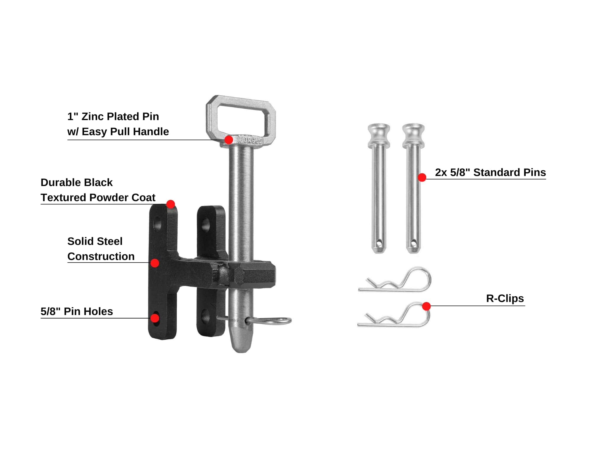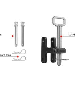Esta pieza está construida en acero sólido y recubierta con nuestro característico recubrimiento en polvo negro texturizado, al igual que el resto de nuestros enganches y accesorios. Este producto incluye un pasador de zinc plateado de 1″ con un mango grande y dos de nuestros pasadores estándar endurecidos de 5/8″. Compatible con todos los enganches BulletProof. Incluido con su orden: Enganche de Clevis de Acero Sólido Recubierto en Polvo Negro Pasador de Zinc Plateado Endurecido de 1″ con Mango Fácil de Jalar 2 Pasadores Estándar Endurecidos de Zinc Plateado de 5/8″ Clasificado para 20,000 lbs.
