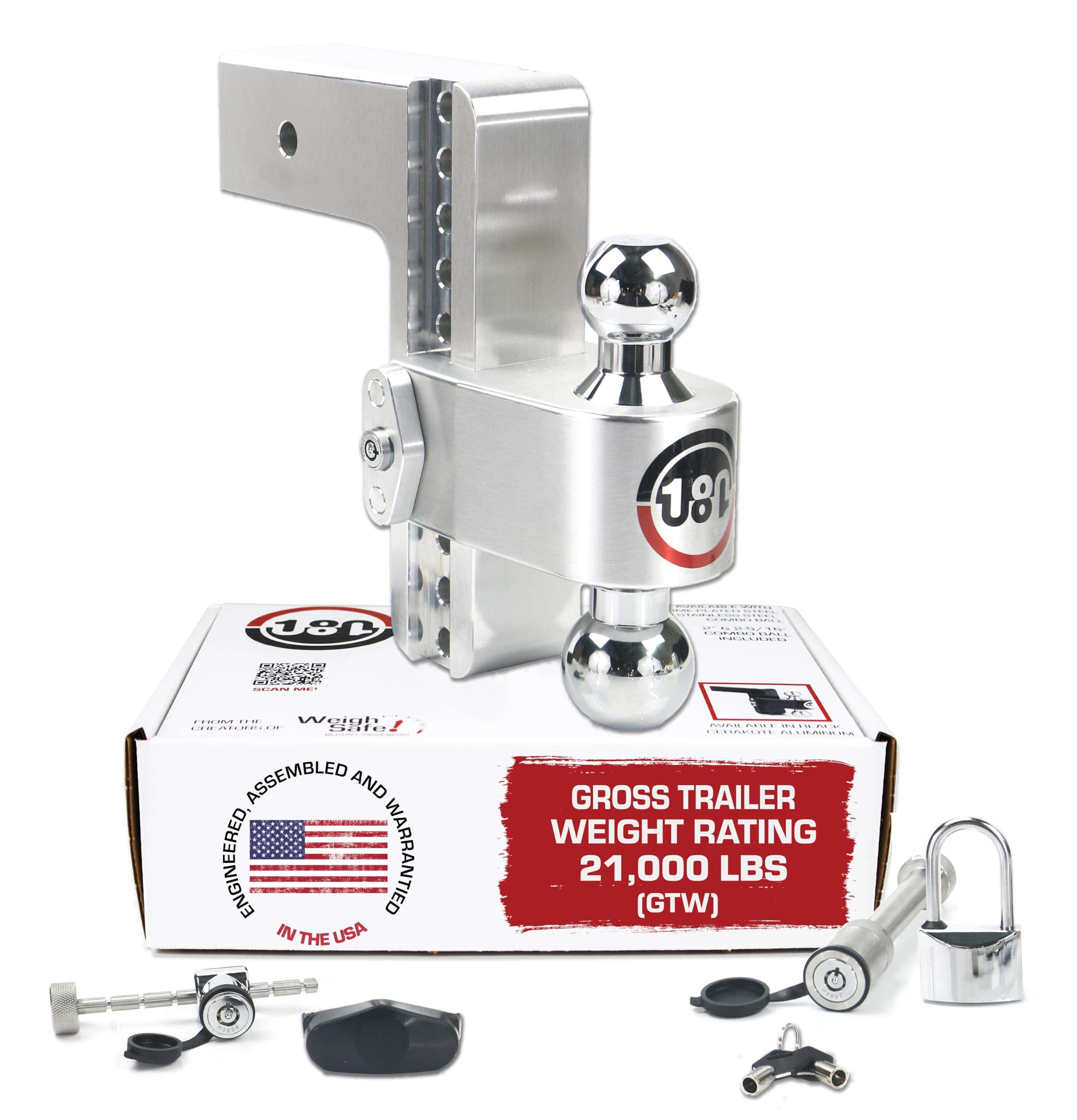 Weigh Safe es el líder de la industria del remolque para la Paz de Espíritu de Remolque. El enganche 180 de edición cromada de Weigh Safe está construido de aluminio macizo y acero cromado. El enganche 180 de edición cromada es el único enganche de bola ajustable disponible con el innovador diseño y función patentados de Weigh Safe. Con capacidades de peso que van desde 12,500lbs a 21,000lbs, nuestros enganches de bola están diseñados para superar las necesidades de nuestros clientes. Con certificación V5 & J684, nuestros enganches de bola han demostrado superar los estándares de la industria. Nuestro enganche de bola ajustable es simple de operar y le permite remolcar con facilidad mientras le permite mantener su remolque paralelo al suelo, manteniendo una experiencia de remolque más estable y segura. Este enganche de bola incluye una bola de remolque de 2″ y 2-5/16″ permitiéndole ser utilizado con una amplia variedad de remolques y aplicaciones. La altura ajustable le permite la flexibilidad de remolcar una variedad de remolques con una variedad de vehículos. Con la flexibilidad incorporada de la Edición Cromada 180, será el último enganche de bola que poseerá. El ALUMINIO DE GRADO AERONÁUTICO 6061 es una de las aleaciones de aluminio más resistentes a la corrosión disponibles en el mercado hoy en día. Esto asegurará que su enganche de bola mantenga tanto su integridad como su acabado cepillado mucho más tiempo que la competencia. El aluminio de alta resistencia NO se oxida Este enganche de bola ajustable también puede ser utilizado en la posición elevada hasta la altura máxima del enganche de bola. ¿No remolcando? ¡No hay problema! Simplemente retire el deslizador y gire hacia atrás para guardarlo debajo de su vehículo. Ya sea que esté remolcando su bote, RV o necesite hacer alguna remolcada pesada por trabajo, este será el producto perfecto para usted. Al igual que con todos los enganches de bola de Weigh Safe, la Edición Cromada 180 está disponible en descensos de 4″, 6″, 8″ y 10″ y está construido para tamaños de receptores de 2″, 2.5″, 3″. Weigh Safe se enorgullece de fabricar este producto de alta calidad en EE. UU. Nos sentimos honrados de ser parte de la Asociación de Distribuidores de Remolques de América del Norte.