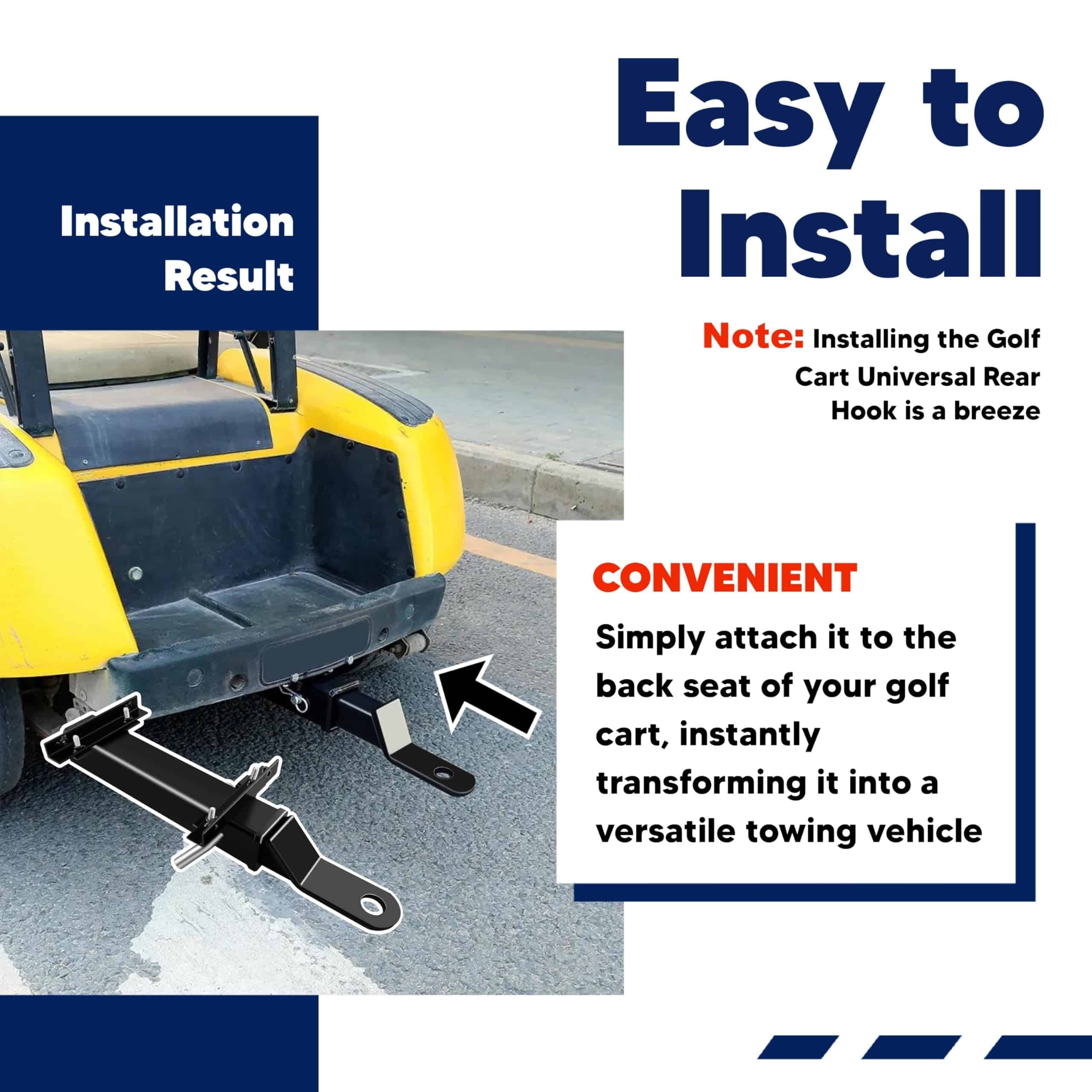 4. Instalación sencilla Instalar el Gancho Trasero Universal para Carritos de Golf es pan comido. Simplemente ajústalo al asiento trasero de tu carrito de golf, transformándolo instantáneamente en un vehículo de remolque versátil. En algunos casos donde los pedales son más largos, pueden requerirse modificaciones menores como taladrar agujeros y usar arandelas para un ajuste perfecto.