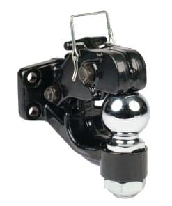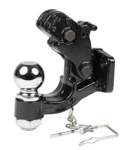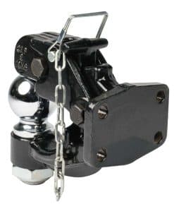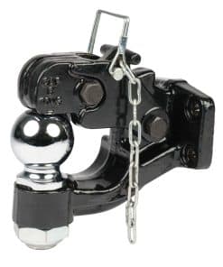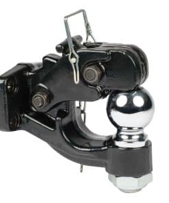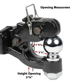 Enganche pintle con bola Tonelada: 8 Tamaño de bola: 2-5/16″ Capacidad máxima de carga vertical del enganche: 3000 libras Capacidad máxima de remolque bruto del enganche: 16,000 libras Capacidad máxima de remolque bruto con bola: 16,000 libras Material: Construcción de acero resistente con un acabado recubierto de polvo negro para resistencia a la corrosión. Kit de montaje con clip y cadena.