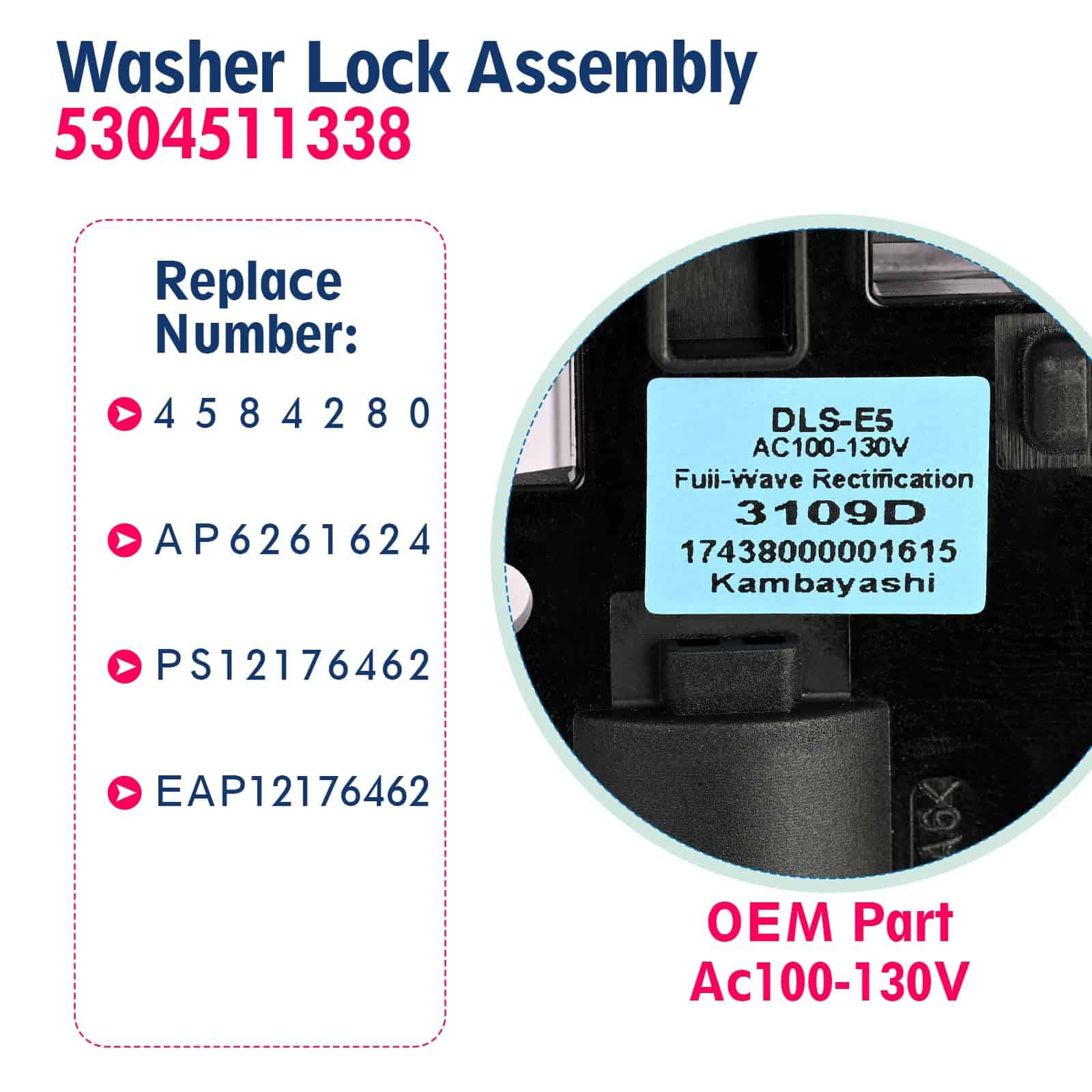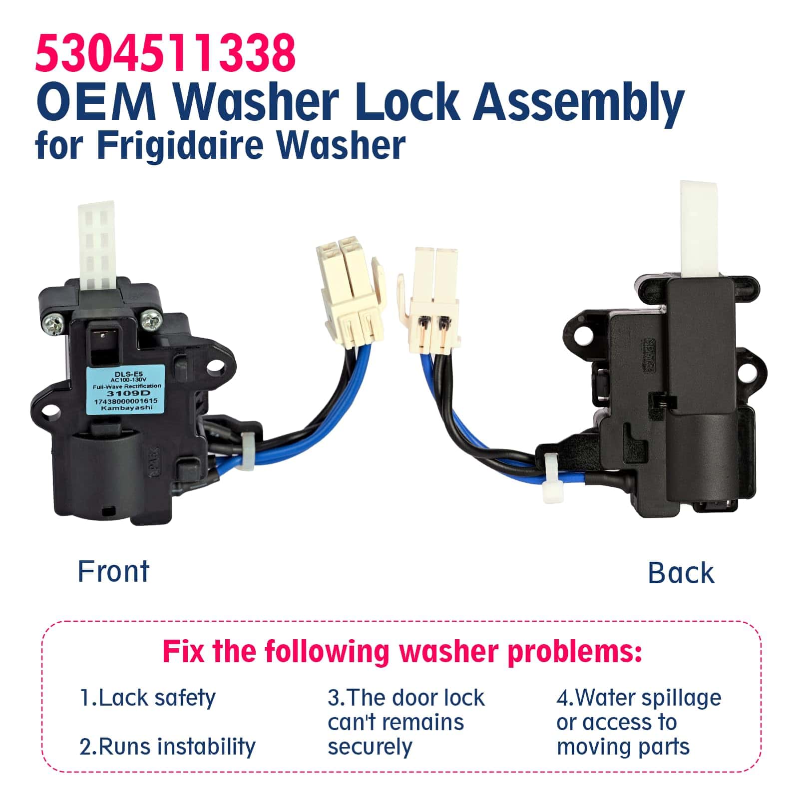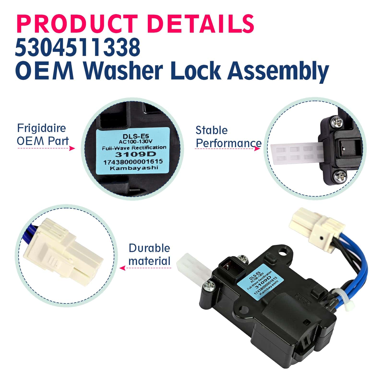 El ensamblaje de bloqueo de puerta de lavadora OEM 5304511338 es una pieza original del fabricante de equipos (OEM). Reemplaza números de modelo como 17438000001615, DLS-E5, 4584280, AP6261624, PS12176462, EAP12176462, etc. Es compatible con lavadoras Frigidaire, en modelos como FFTW4120SW, FFTW4120SW0, FFTW4120SW1. Está hecho de material de primera calidad y viene con una garantía de 2 años para devoluciones e intercambios. Nos comprometemos a garantizar su total satisfacción con cada compra.