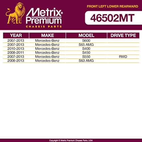 1. FUERTE Y DURADERO: Plateado con catáforo para una protección adicional contra la corrosión en contaminantes como sal, suciedad o ingreso de agua. Suministrado en un empaque premium duradero. 2. CALIDAD PREMIUM: Diseñado, probado y fabricado para cumplir o exceder la calidad OEM. Sometido a pruebas rigurosas y una fabricación estricta para garantizar un rendimiento óptimo. IATF 16949 ISO 9001. 3. INSTALACIÓN FÁCIL Y AJUSTE PERFECTO A LA PRIMERA: Se suministran todos los accesorios requeridos para garantizar un ajuste perfecto a la primera. 4. UNA MARCA EN LA QUE PUEDE CONFIAR: Calidad aprobada con un valor excepcional. Diseñado y fabricado en Turquía. Todas las piezas de chasis premium de Metrix vienen con una garantía limitada de 3 años / 36,000 millas desde la fecha de instalación. 5. COMPATIBLE CON: Mercedes-Benz S600 2007-2013, Mercedes-Benz S65 AMG 2007-2013, Mercedes-Benz S400 2010-2013, Mercedes-Benz S450 2008-2011, Mercedes-Benz S550 RWD 2007-2013, Mercedes-Benz S63 AMG 2008-2013