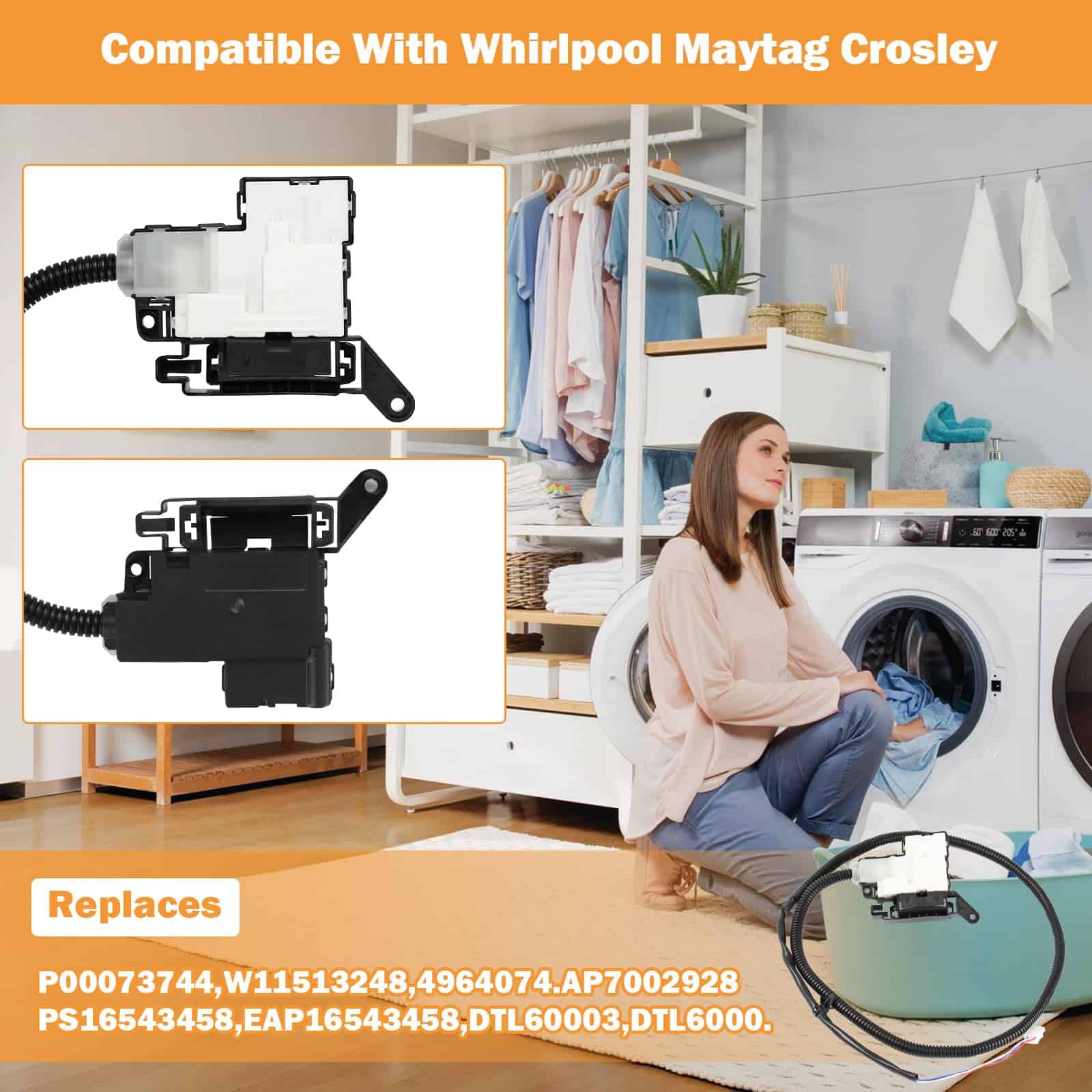 1. Números de Pieza de Reemplazo W11414731 Ensamblaje de Cierre de Lavadora compatible con lavadoras whirlpool crosley maytag reemplaza W11513248 PD00073744,W11513248,4964074,AP7002928,PS16543458,EAP16543458,DTL60003,DTL6000. Por favor, verifique que el número de parte sea correcto para su modelo antes de ordenar.