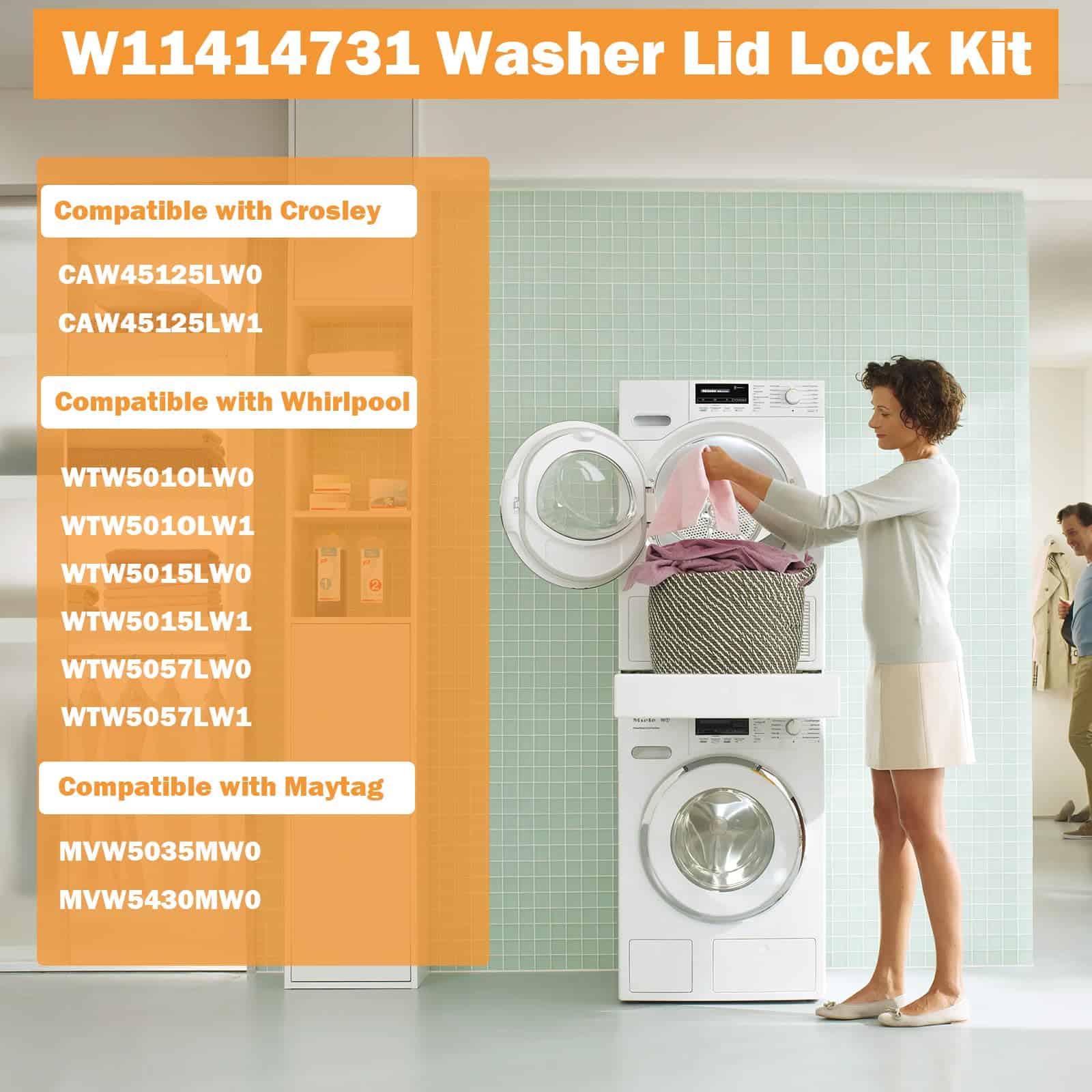 2. Modelos Compatibles Kit de Bloqueo de Tapa de Lavadora W11414731 compatible con lavadoras Whirlpool Crosley Maytag, Ajusta modelos CAW45125LW0 CAW45125LW1 MVW5035MW0 MVW5430MW0 WTW5010LW0 WTW5010LW1 WTW5015LW0 WTW5015LW1 WTW5057LW0 WTW5057LW1. Antes de realizar un pedido, verifique si el interruptor de bloqueo de tapa de la lavadora es adecuado para su modelo de lavadora.