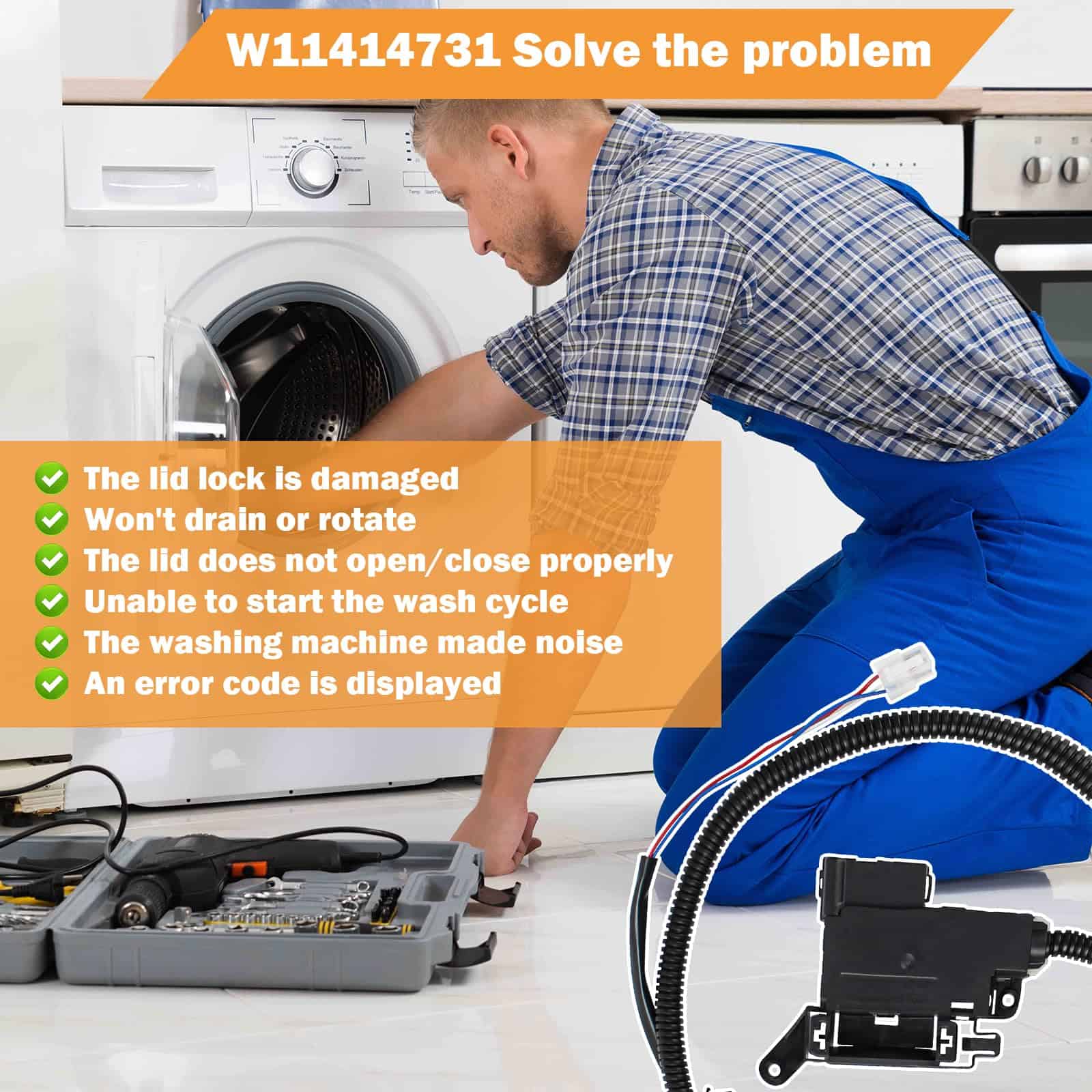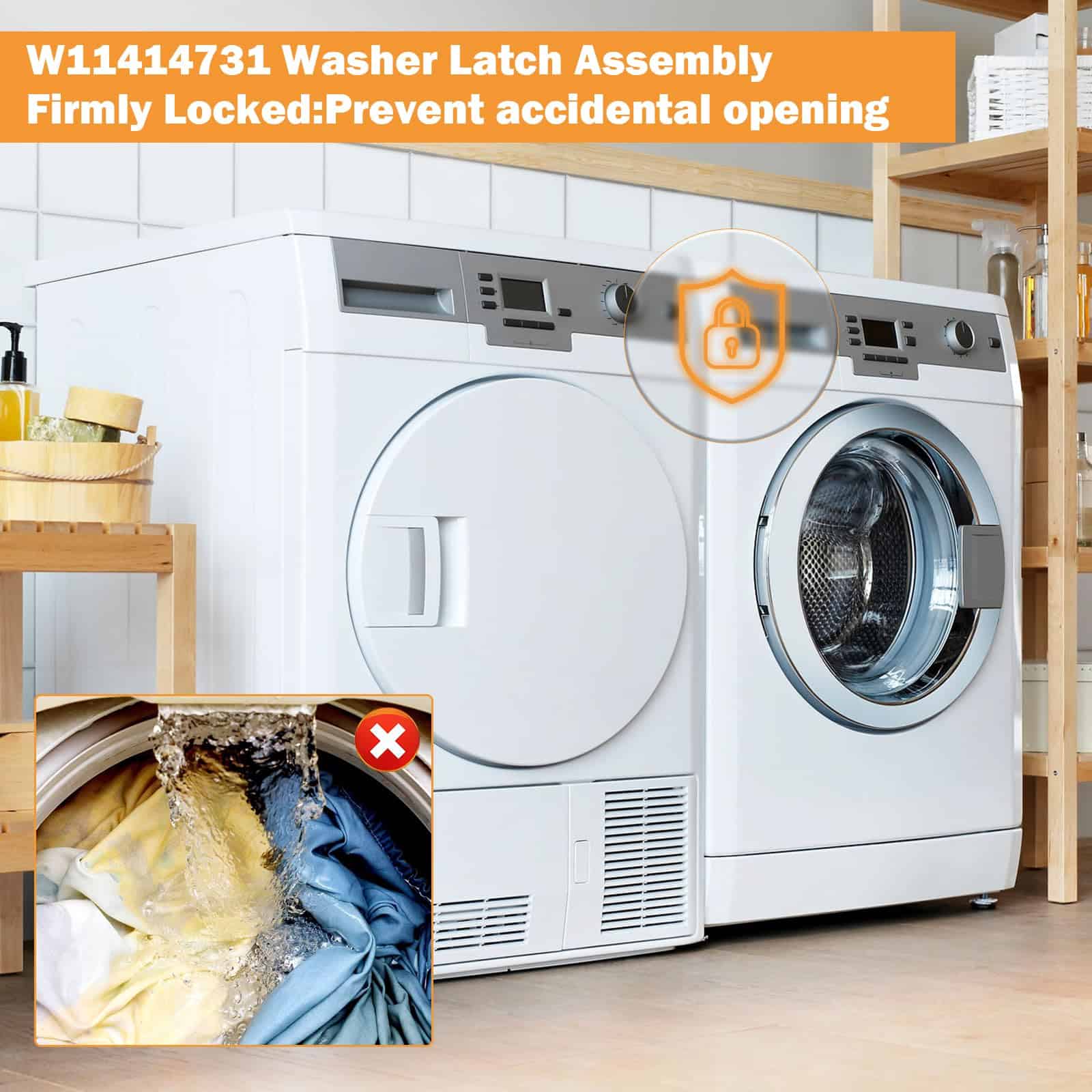 3. Problemas Solucionados El Ensamblaje de Interruptor de Bloqueo de Tapa de Lavadora W11414731 W11513248 evita la apertura accidental de la tapa durante la operación, evitando salpicaduras o interrupciones durante el proceso de lavado, puede resolver estos problemas de su lavadora: Cierre de tapa roto /No drena o gira /no se puede cerrar/abrir /No inicia ciclo de lavado /Tapa de la lavadora sigue haciendo clic /Llenó y se vació inmediatamente.