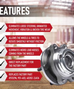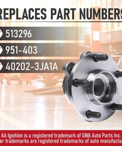 1. Ensamblaje de Cojinete de Cubo de Rueda de Repuesto – es una parte crucial del tren motriz ya que permite que las ruedas y neumáticos giren suavemente sin fricción. Los problemas del cojinete del cubo de la rueda se pueden identificar fácilmente por ruidos fuertes en el área del neumático, dirección suelta o movimiento no deseado, vibración y desgaste desigual de los neumáticos. 2. Reemplazo Compatible para Vehículos Infiniti y Nissan – 2014 – 2017 QX60 | 2013 Infiniti JX35 | 2008 – 2018 Altima | 2016 – 2018 Maxima | 2013 – 2015 Pathfinder |. La instalación es fácil y no se requieren herramientas especiales, encajará, se verá y funcionará como el cojinete del cubo de rueda de fábrica. 3. Reemplaza la parte 513296, 951-403, 40202-3JA1A comúnmente encontrada en los populares vehículos Altima, Maxima, Pathfinder, JX35 incluyendo los modelos de los años 08, 09, 10, 11, 12, 13, 14, 15, 16, 17, 18. El cojinete del cubo de la rueda se puede acceder fácilmente al quitar las ruedas de los vehículos y se adapta tanto a la izquierda como a la derecha de las ruedas delanteras. 4. Ajuste OEM, Calidad, Acabado – Si bien no es una pieza OEM genuina, es un reemplazo directo para el ensamblaje del cojinete del cubo de rueda de fábrica en su camioneta e incluye sellos de cojinete más duraderos para un viaje suave y de calidad para su vehículo. 5. – Este ensamblaje de cojinete de cubo de rueda fabricado por AA Ignition viene completo con una . Si la parte falla en su vehículo, simplemente contáctenos para un reemplazo. Ahorre tiempo y dinero al comprar esta pieza. Por favor, asegúrese de que su vehículo tenga conteos de 5 lug antes de comprar. Consulte nuestro sitio web para obtener detalles completos.