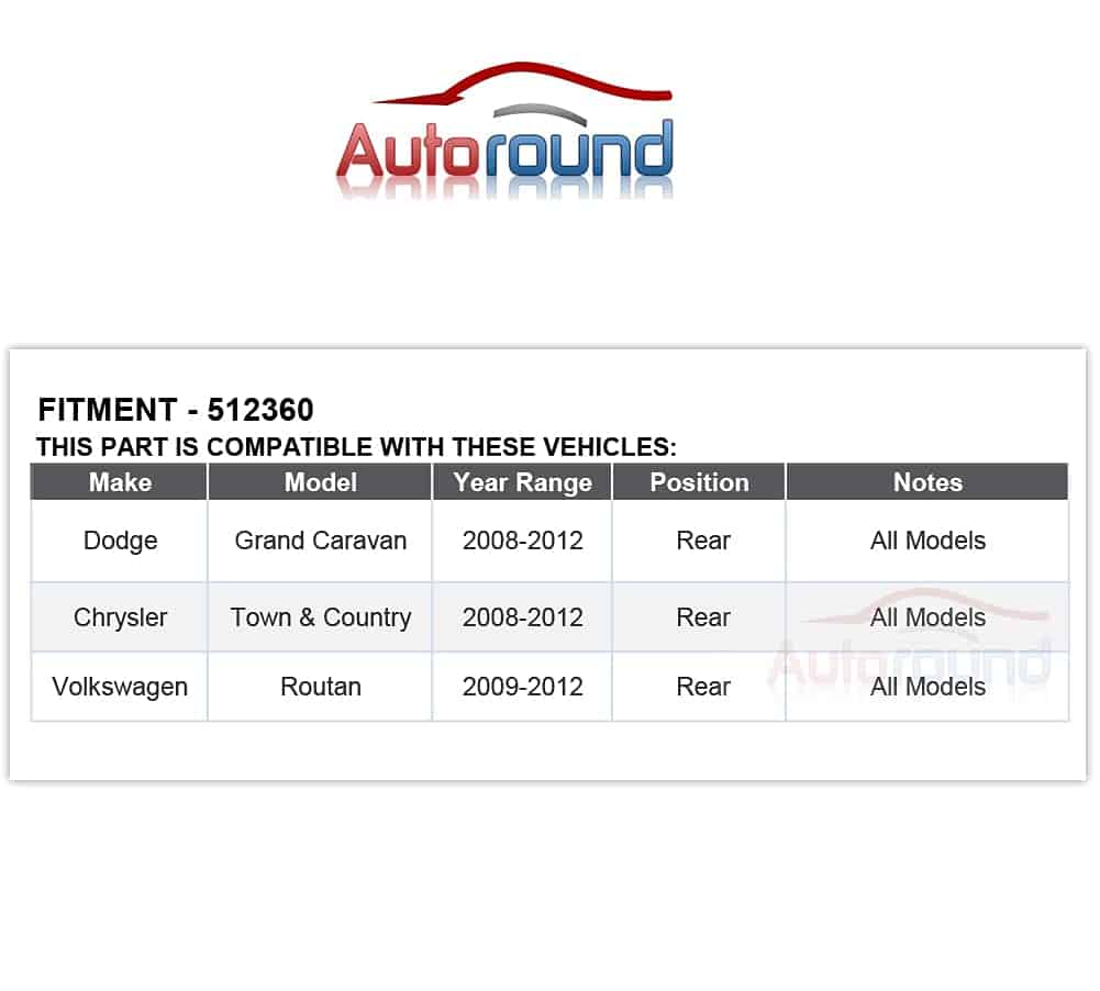 Especificaciones del Ensamblaje de Cubo de Rueda Trasera y Rodamiento Autoround – 512360. Se ajusta tanto al lado LH (conductor) como al lado RH (pasajero) trasero. 5 pernos de rueda con ABS. Brida Rectangular de 4 agujeros de perno. Garantía de 1 año. Incluido 1x Ensamblaje de Cubo de Rueda de Autoround. Esta pieza es compatible con los siguientes vehículos: Chrysler Town & Country 2008-2012, Dodge Grand Caravan 2008-2012, Volkswagen Routan 2009-2012.