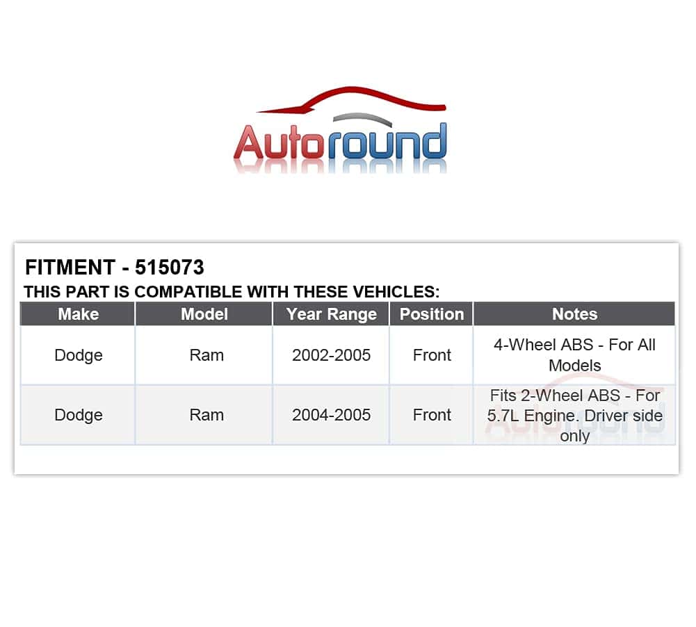 Especificaciones del Ensamblaje del Cubo de Rueda Delantero 515073 Se ajusta tanto al lado LH (conductor) como al lado RH (pasajero) Birlos de 5 con abs Flange Triangular de 3 Pernos Esta parte es compatible con los siguientes vehículos: 2002 Dodge Ram 1500 2003 Dodge Ram 1500 2004 Dodge Ram 1500 2005 Dodge Ram 1500