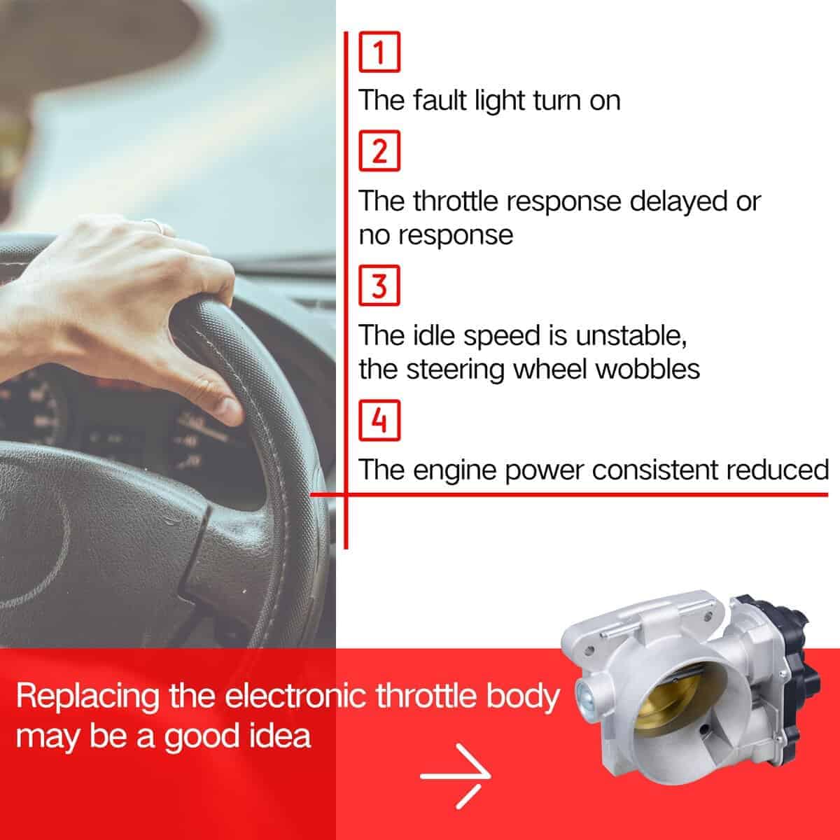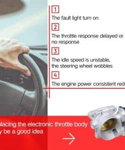 4. Cuándo necesitas reemplazar el cuerpo de aceleración: 1. Si la luz del motor y/o la luz de advertencia de potencia reducida está encendida, el mecánico determinará si alguno de los códigos de falla almacenados implica un mal funcionamiento del cuerpo de aceleración. 2. Velocidad de ralentí incorrecta. 3. Cambios de transmisión pobres.